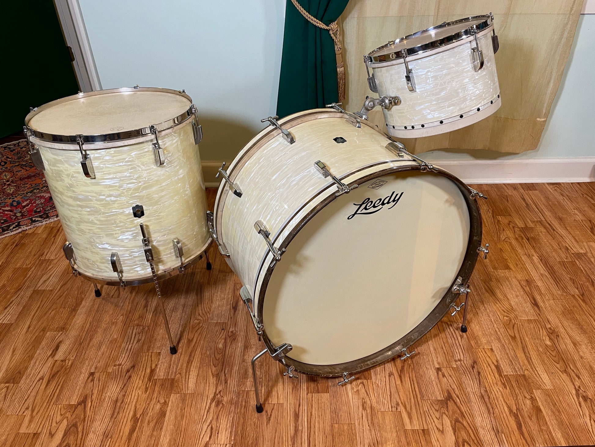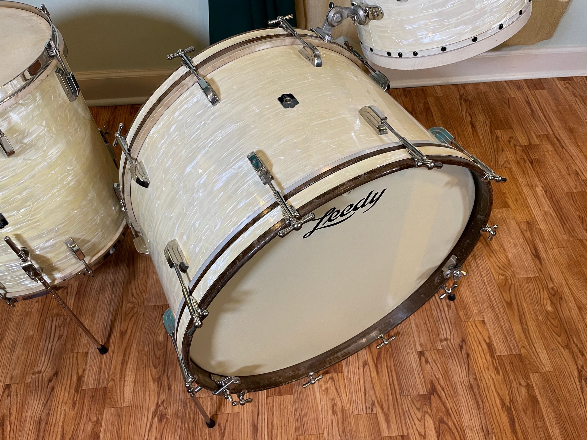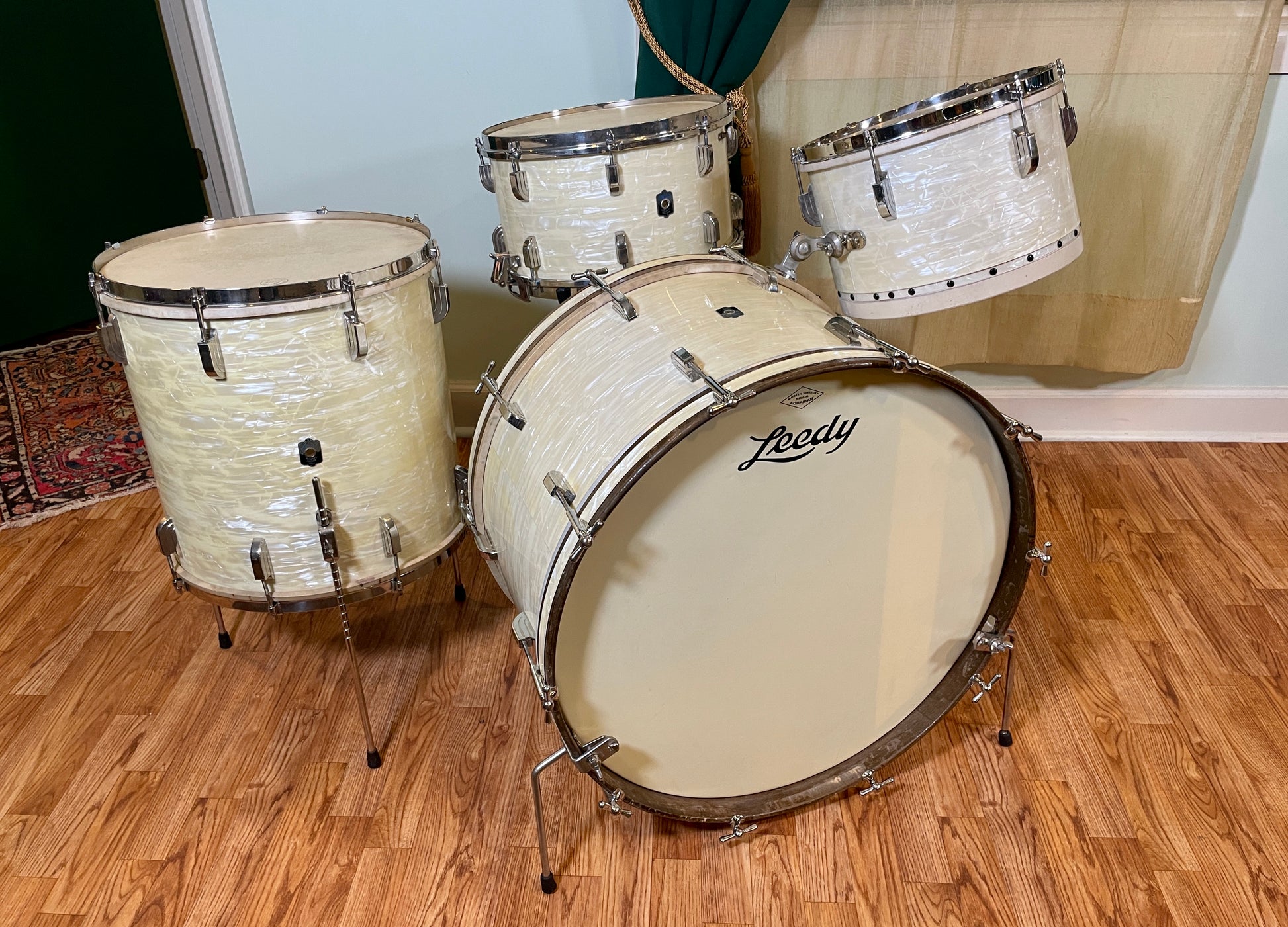 For your supreme viewing pleasure is this gorgeous vintage Leedy outfit in White Marine Pearl from the 1940s. Aside from a changed front head on the bass drum, all of the heads are fabulous clean original calf skin. The bass drum comes with vintage Ludwig hoop mount spurs. The beautiful badges are nice and tight. There are no extra holes or modifications of any kind. The set presents itself beautifully. Most importantly, it tunes up wonderfully and is as much of a pleasure to play as it is to gaze upon. Enjoy!!!