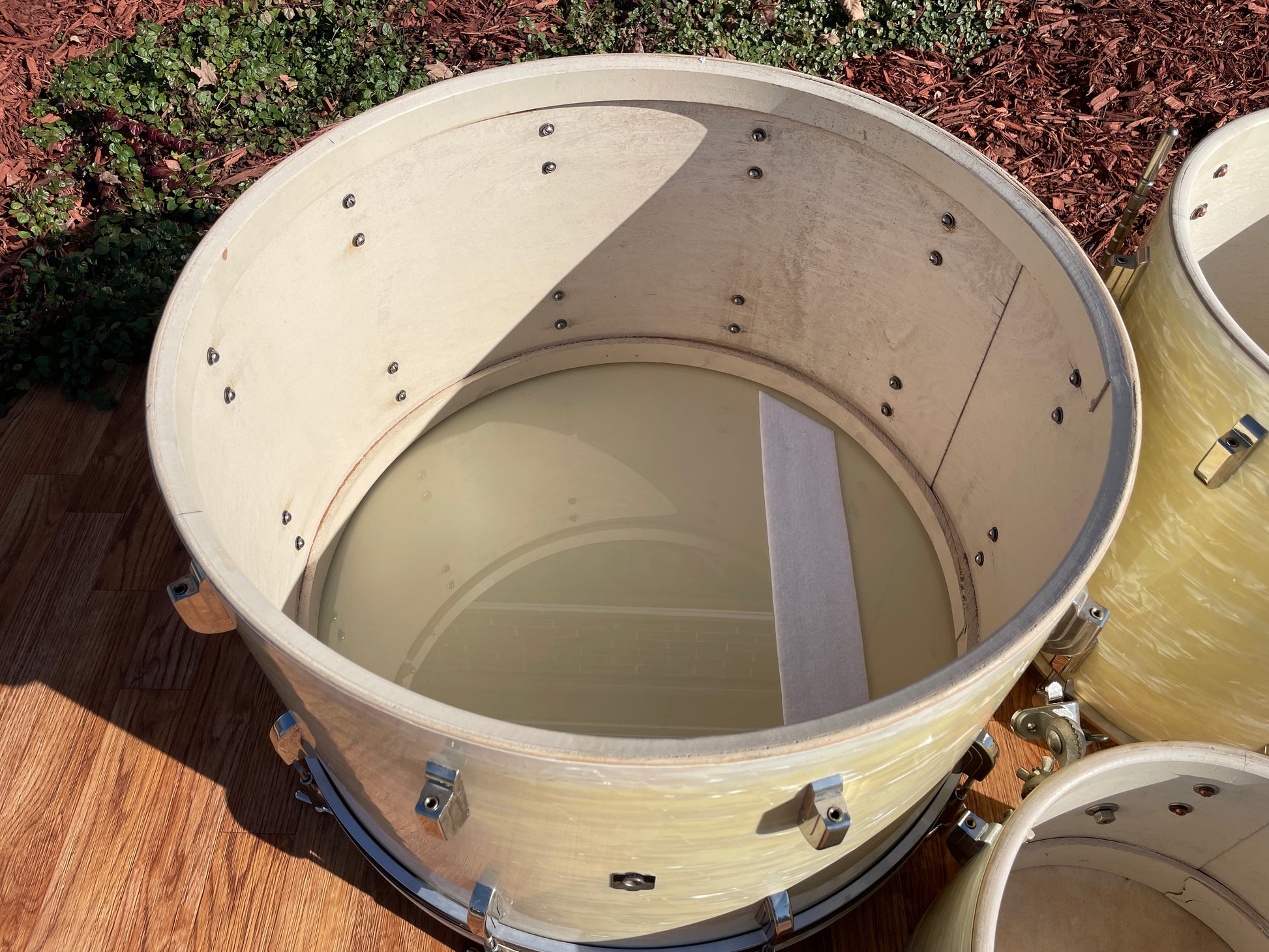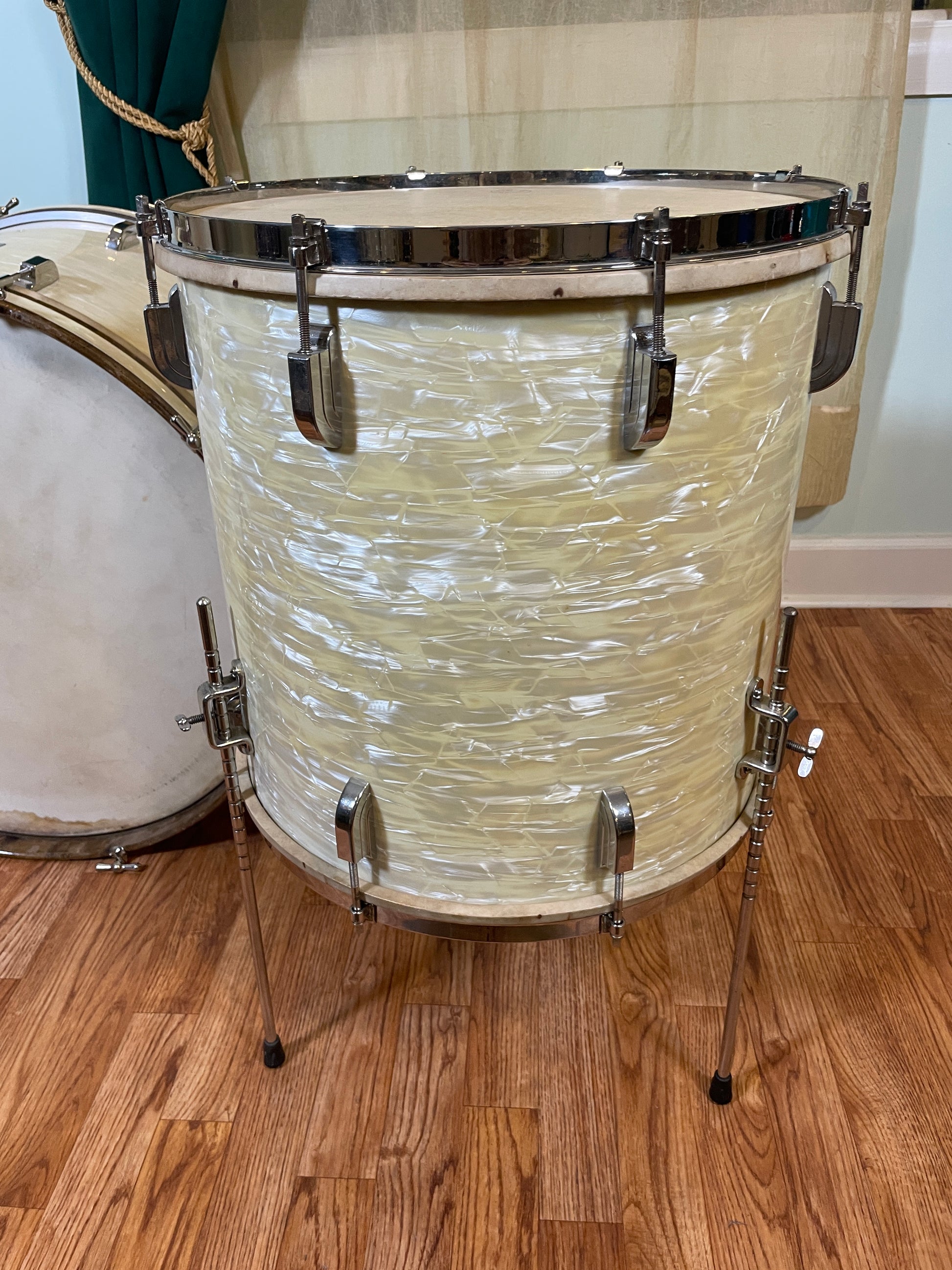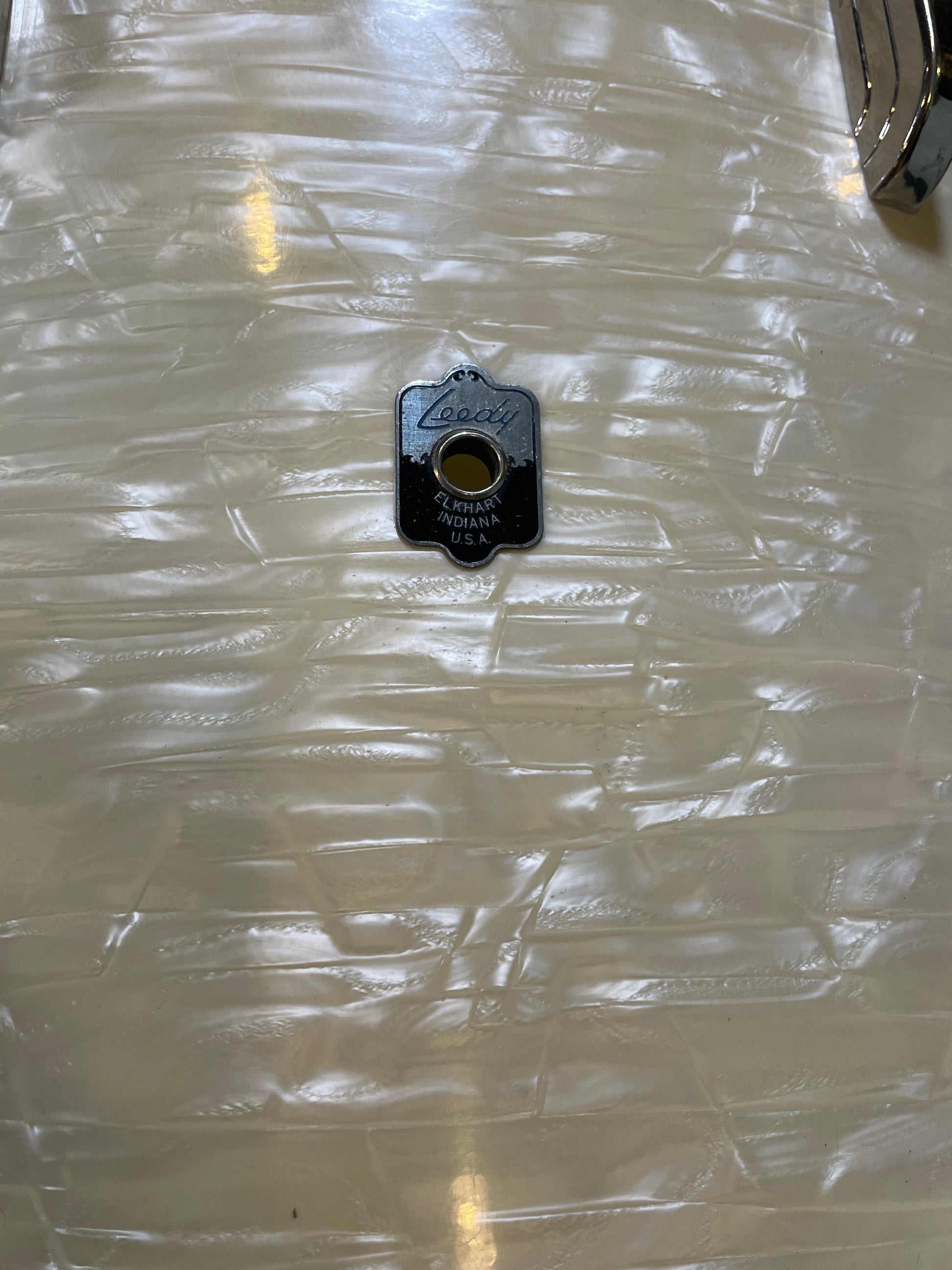 For your supreme viewing pleasure is this gorgeous vintage Leedy outfit in White Marine Pearl from the 1940s. Aside from a changed front head on the bass drum, all of the heads are fabulous clean original calf skin. The bass drum comes with vintage Ludwig hoop mount spurs. The beautiful badges are nice and tight. There are no extra holes or modifications of any kind. The set presents itself beautifully. Most importantly, it tunes up wonderfully and is as much of a pleasure to play as it is to gaze upon. Enjoy!!!