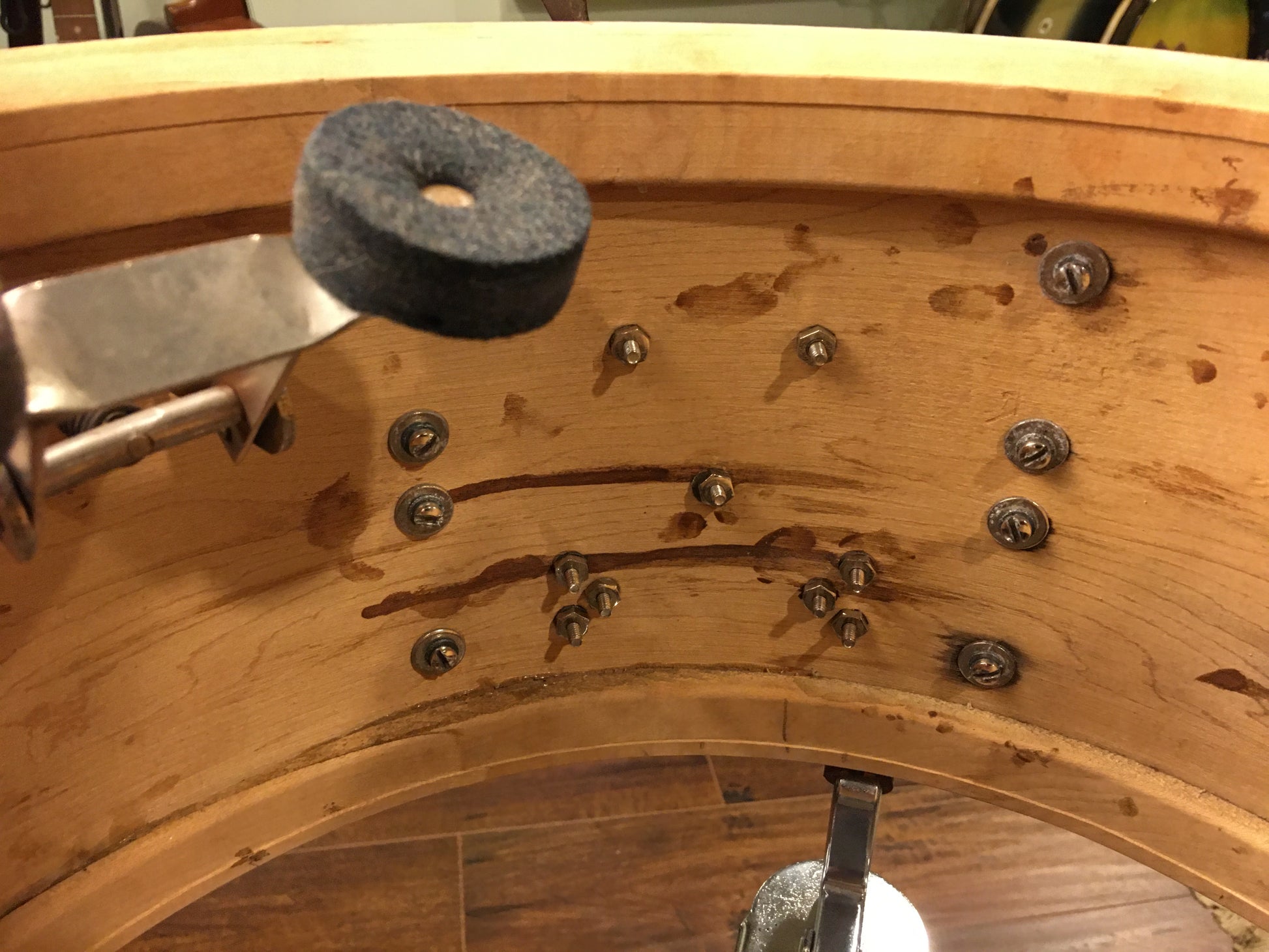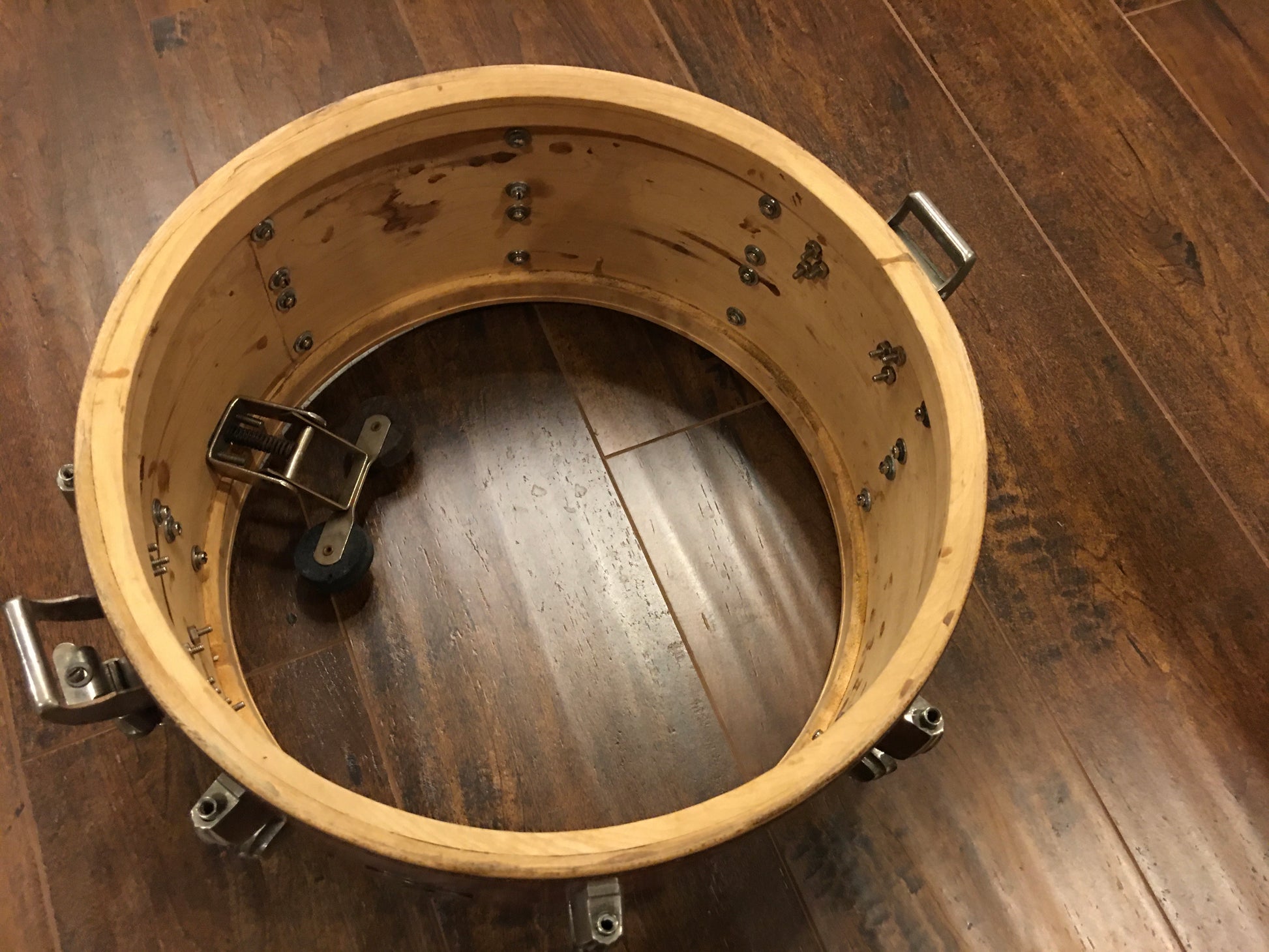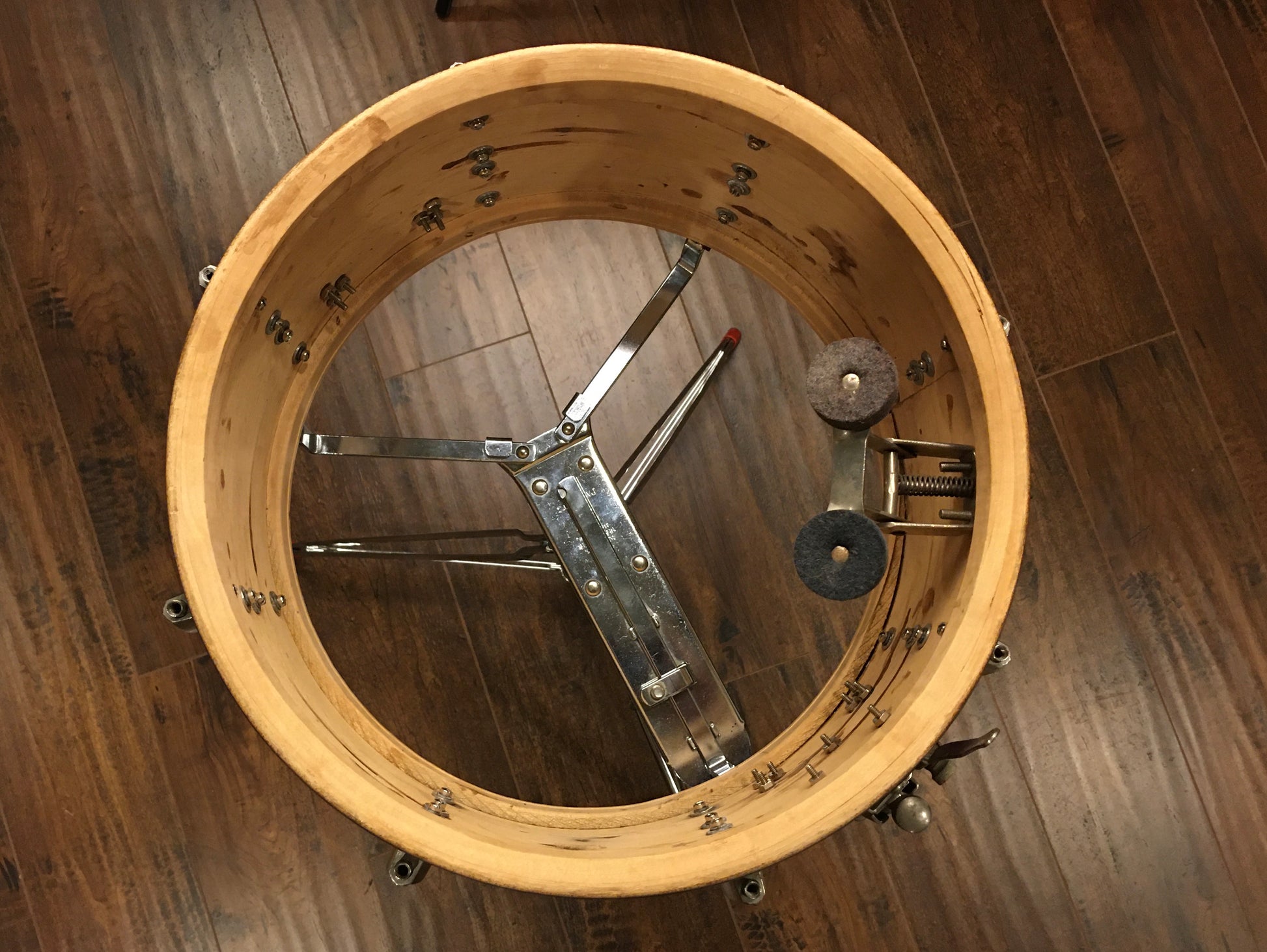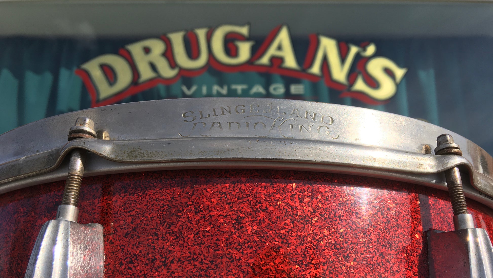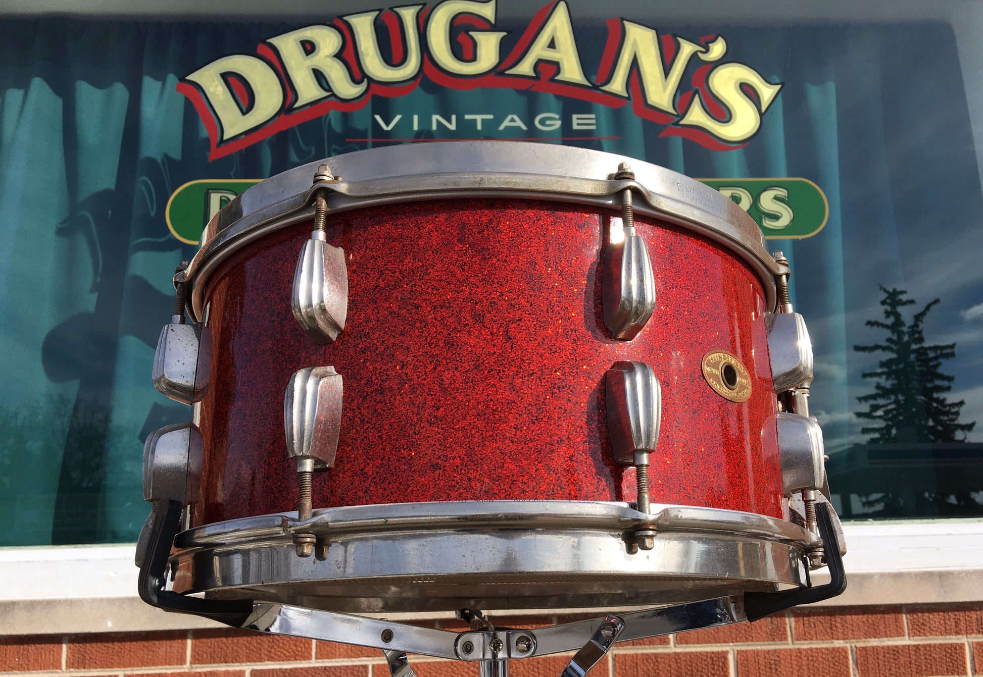 For your viewing pleasure is this wonderful 7x14 Slingerland Radio King solid maple shell snare drum in Sparkling Red Pearl (red glass glitter) built in 1953-56. With exception of the heads, it is 100% original including the wires and tension rods. The three point strainer works perfectly, as does the muffler. There is a bit of staining on the inside of the maple shell which are only cosmetic in nature, possibly from glue used at the factory. The black background of the red glitter wrap gives it a gorgeous ruby red glow. The wrap is in good condition with normal signs of age including a few small freckles commonly seen on older sparkling pearl wraps of this age, and a light mark and small surface scuff here and there. The seam is flat and tight. The bearing edges are original and true. As is common with these Radio Kings, some modern heads fit snug. The brass hoops are in overall good shape, the bottom hoop has a slight cosmetic bend that does not affect the fit or tuning in any way. This drum tunes up fantastically, and with the greatest of ease. Tuned low for a tremendous fat back beat, or tune high for a gorgeous woody ringing crack, and anywhere in between. It's tough to beat the classic magnificence that these old growth single ply Slingerland masterpieces embody. This drum would be a perfect addition to any collection or working professional's / recording studio's snare drum arsenal. Enjoy!