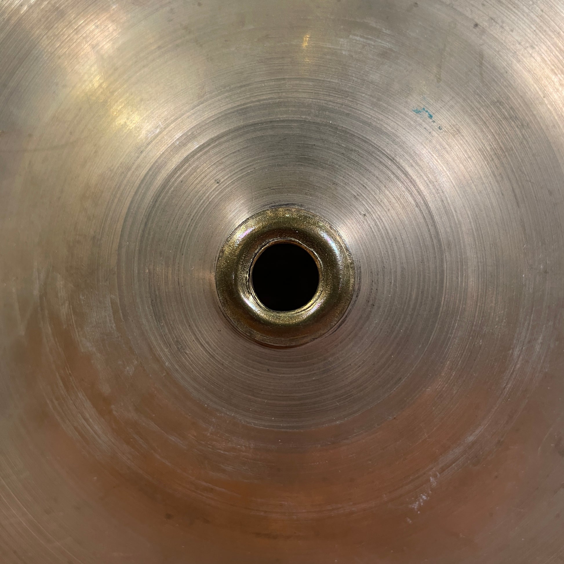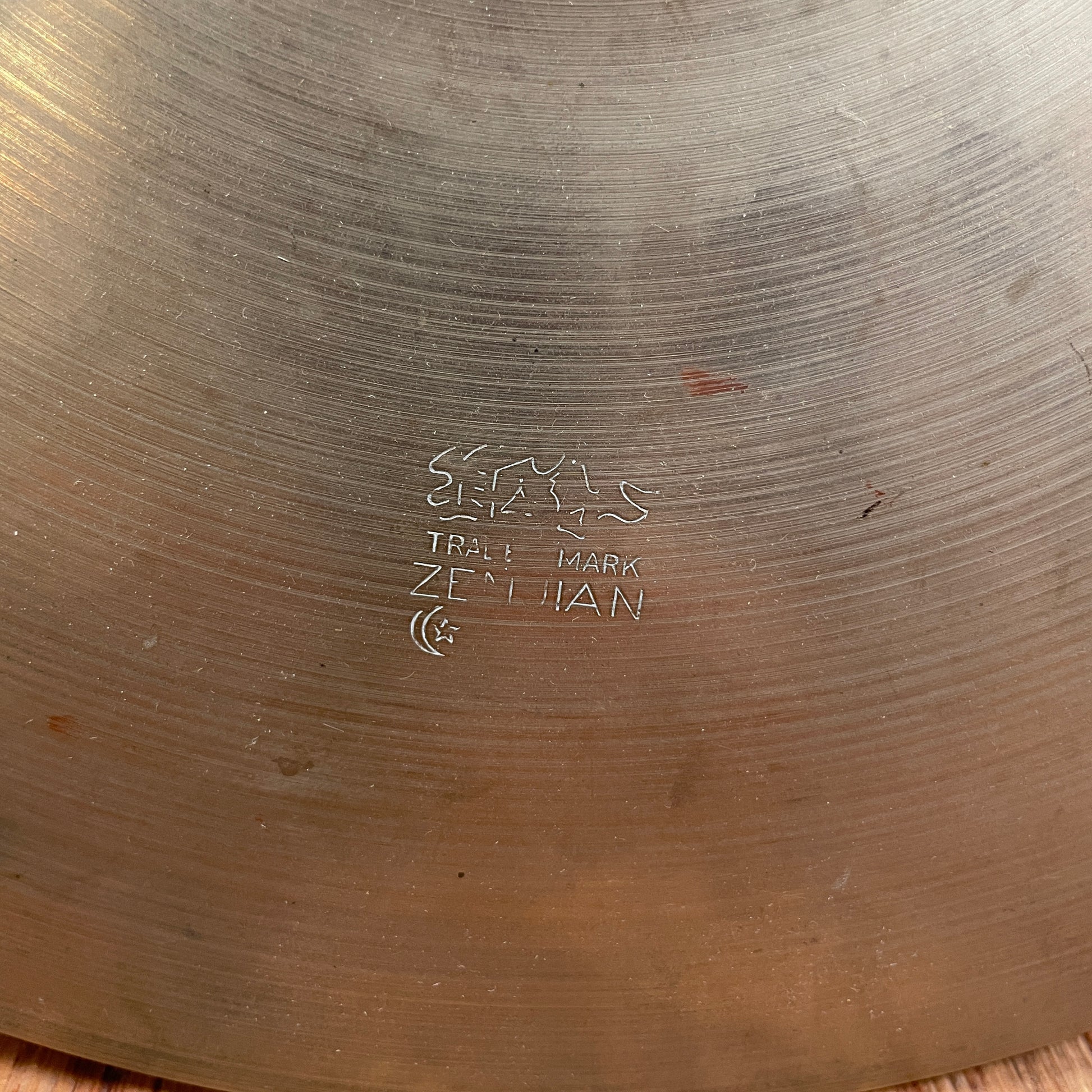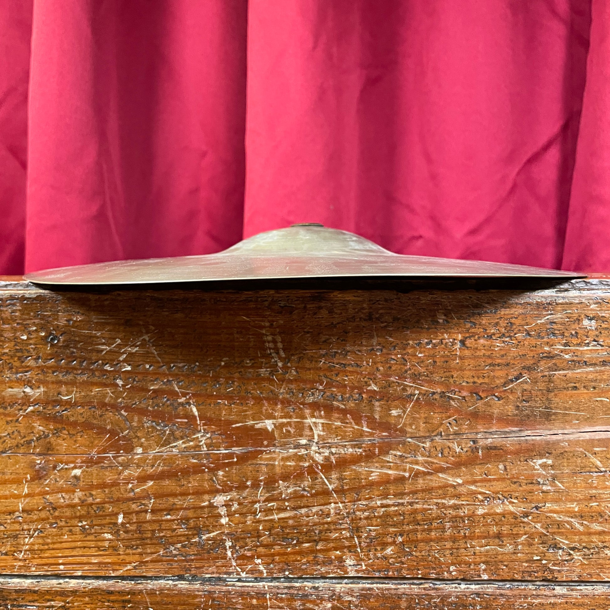 For your kind consideration is this vintage 12" Zenjian splash cymbal. It's a good condition overall and sounds super cool. Deep, punchy, quick little splash. It has small crack as shown in the photos that appears to be from an impact at some point in its life. It's fairly wavy as well and not perfectly round which really just adds to the character. Cool little vintage cymbal that would be a great addition to your collection. No flea bites or keyhole. Weighs in at 386 grams. Enjoy!