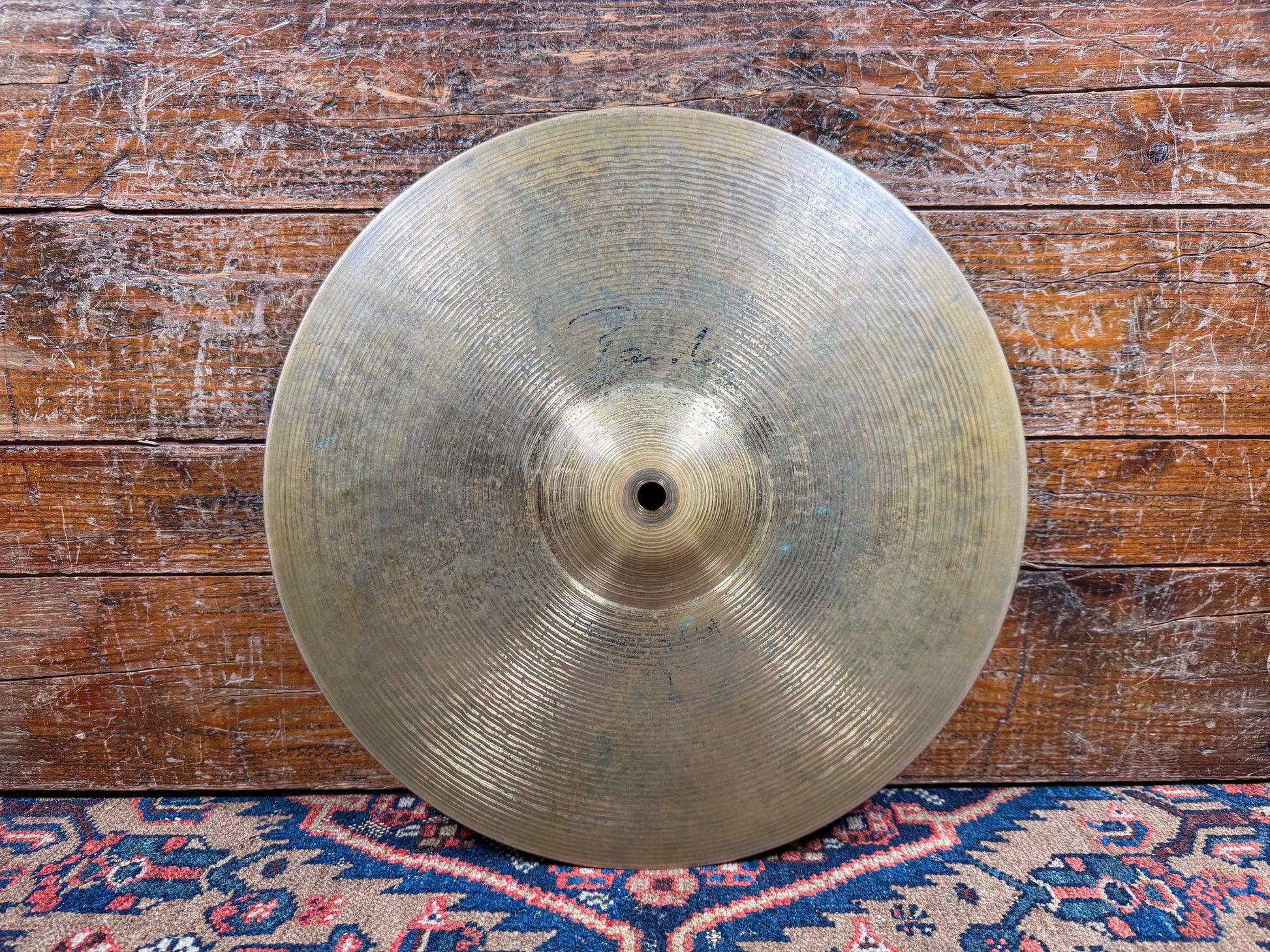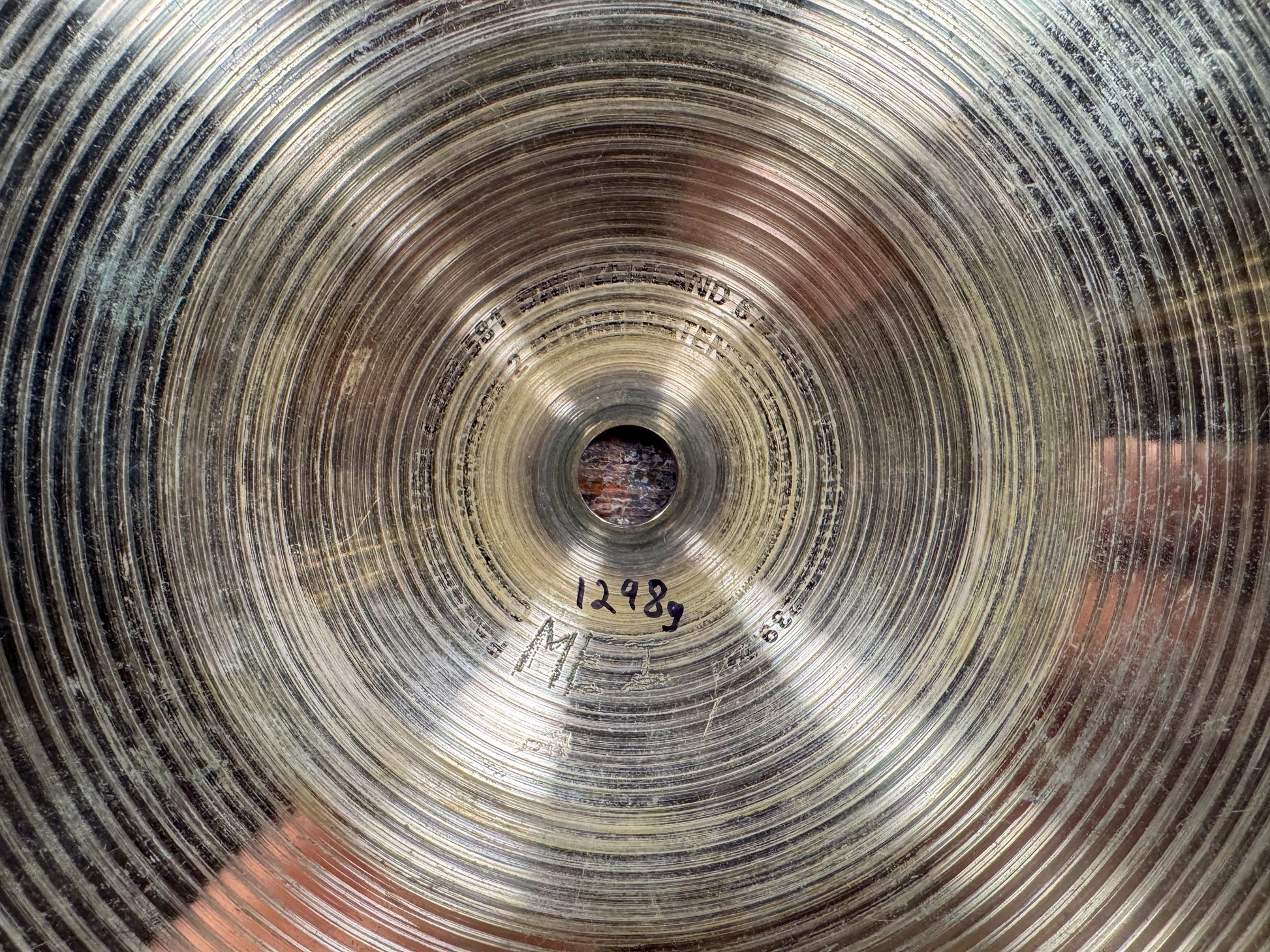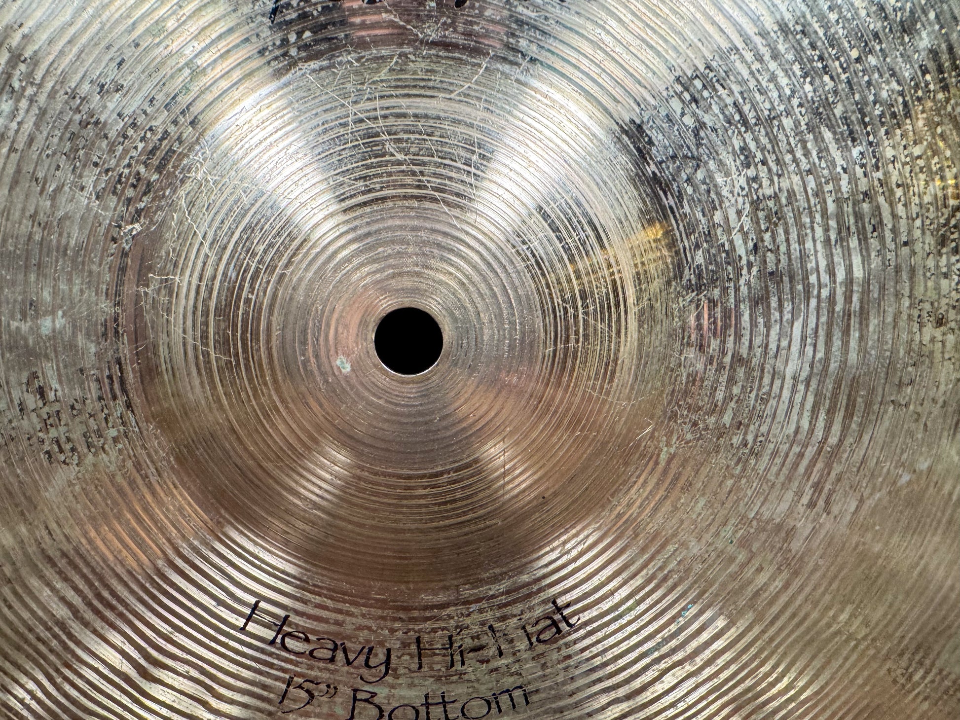 Bright, full, and brilliant, these cymbals have a clear, open sound that is perfect for heavier playing. Very balanced with a precise chick sound. No cracks, bends, flea bites, or keyhole. As evident from the bottom side bell photos, the initials "MEI" were etched in at some point. Top weighs in at 1298 grams and the bottom weighs 1474 grams.