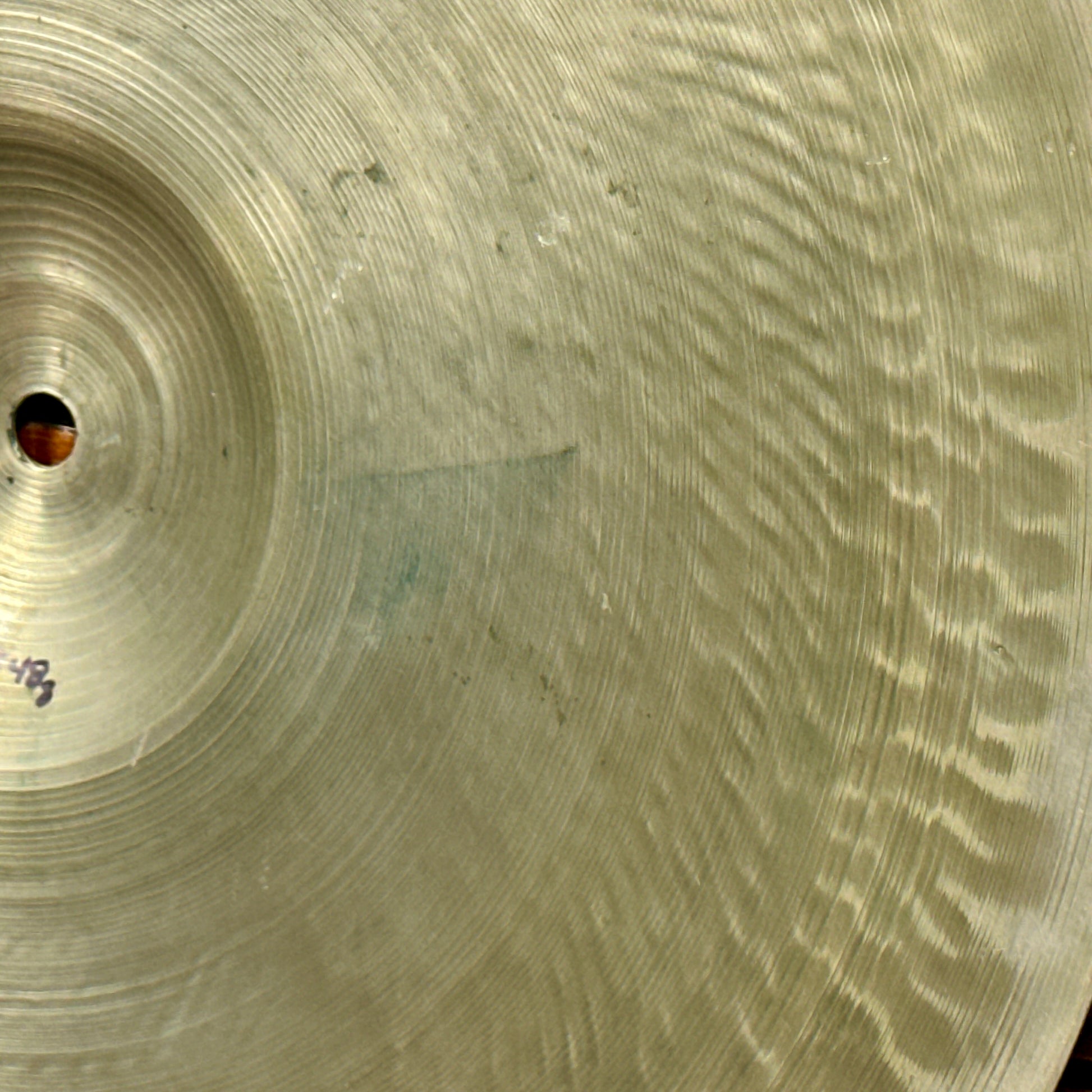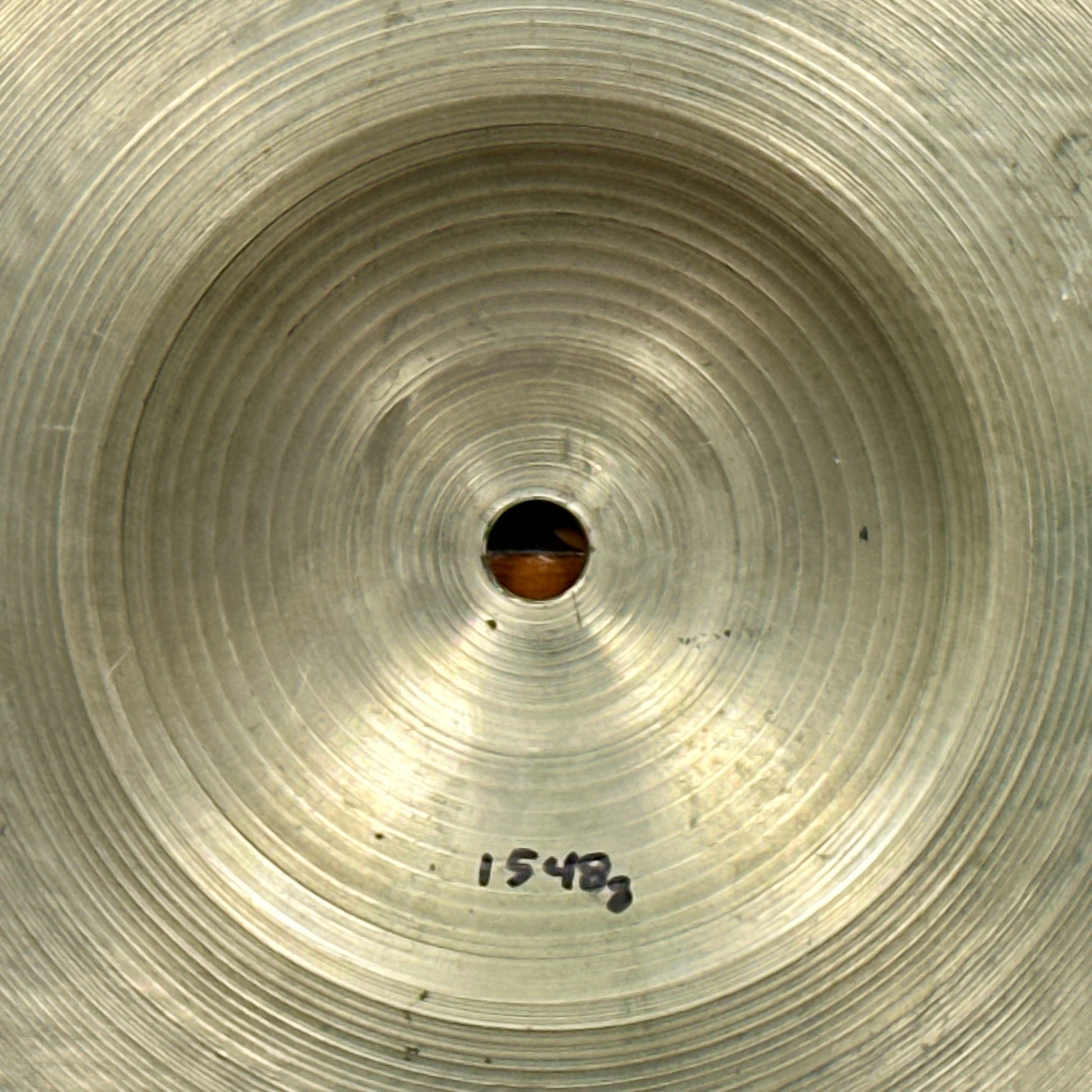 This cymbal has been well cared for in its long life. There is some edge roughness, but otherwise no cracks, bends, flea bites, and a near perfect hole. Check out the gorgeous lathing and hammering, especially the bottom side. A work of art! Weighs in at 1548 grams. Enjoy!