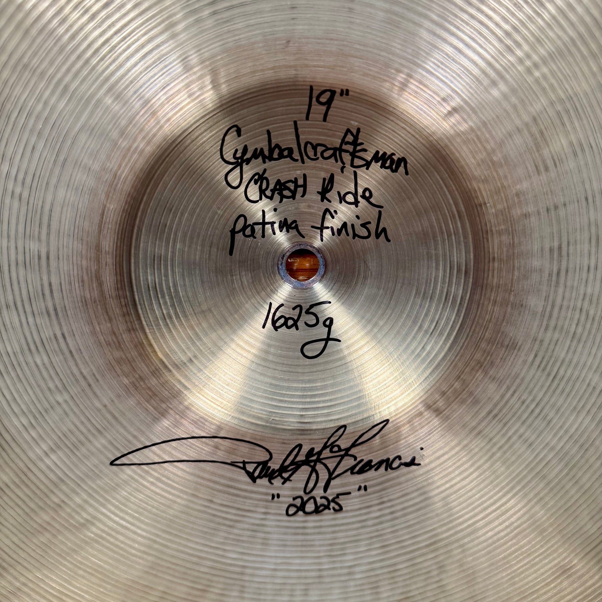 For your prime listening and viewing pleasure is this brand new 19" Royal Cymbals Cymbal Craftsman Crash Ride cymbal with a patina finish, hand picked by us from a batch of Royal's specially selected to show at the 50th Anniversary PASIC celebration. This heirloom quality instrument has been handcrafted by legendary cymbal smith Paul Francis, and is essentially a more hands on artisan version of the very best K Cons or Artisan series, with the patina process used on the no longer produced and sought after Keropes once offered by Zildjian. The current line of re-launched Keropes offered by Zildjian no longer has the factory patina. This bespoke instrument has been handcrafted by legendary cymbal smith Paul Francis. Paul has worked with the world’s greatest drummers to create many of the modern cymbal sounds you hear in live music and on countless recordings. This one is bright, silvery, and musical. Weighs in at 1625 grams. Enjoy!