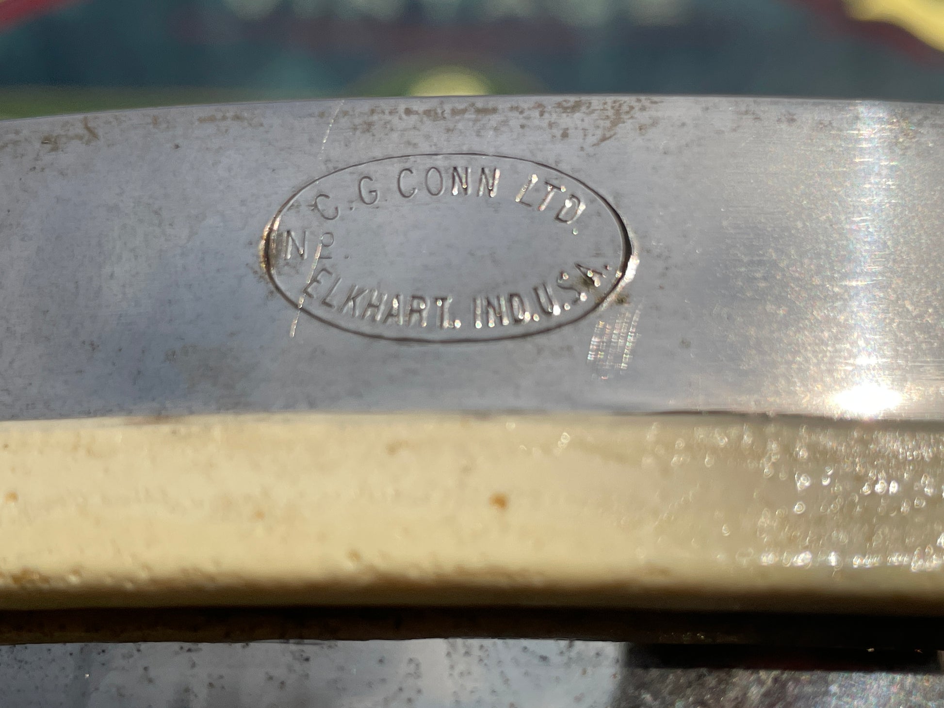 For your kind consideration is this rare vintage C.G. Conn 5x14 snare drum made by Leedy in the early 1900s. It's in great condition and features a nickel over brass shell. The tube lugs and nickel plating exude a fabulous antique look. Aside from the heads, it's all original down to the wires, tension rods, and strainer. Great sounding drum from yesteryear. Enjoy!