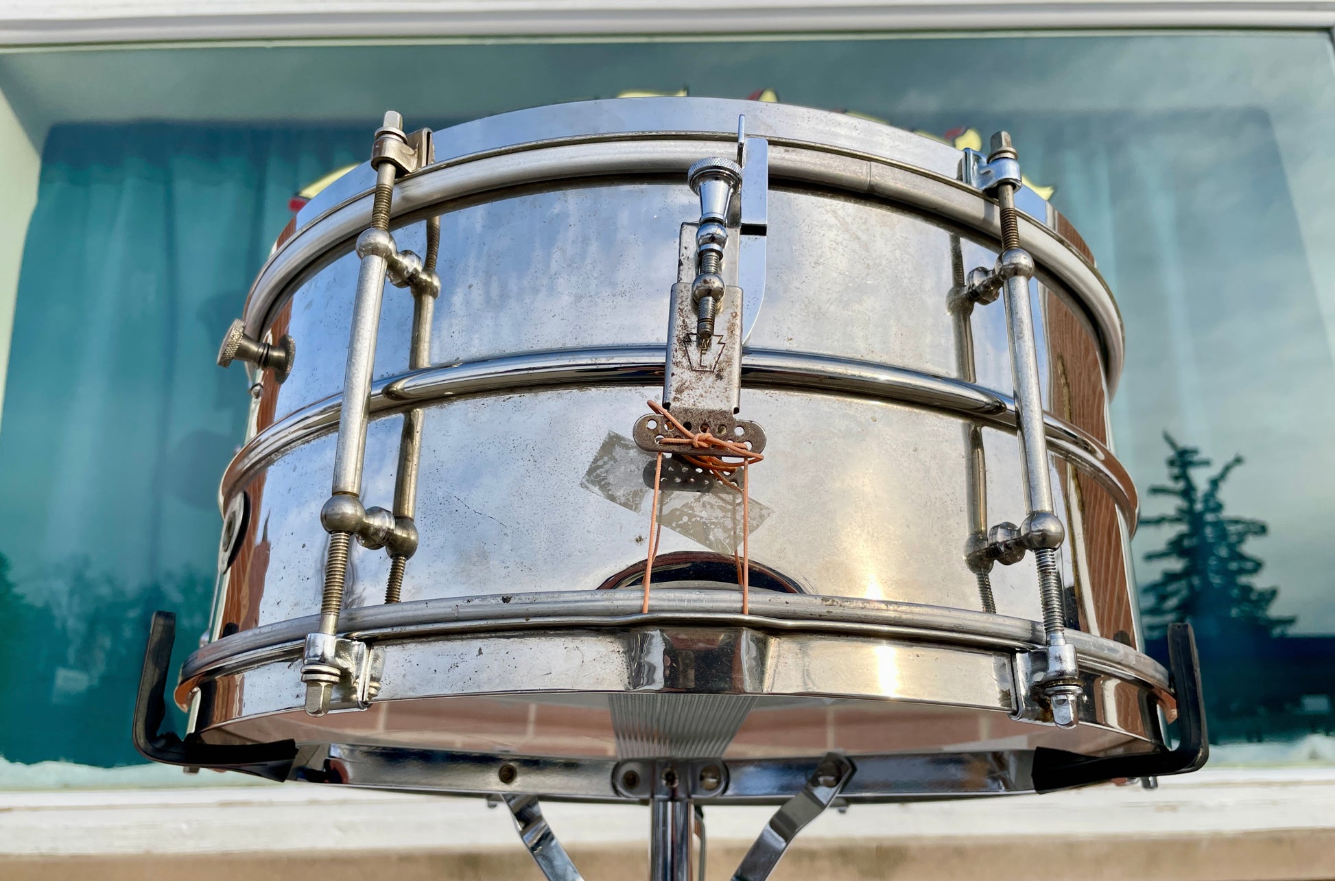 For your supreme viewing pleasure is this fabulous sounding 1930s 6.5x15 Ludwig snare drum made with the same coveted heavy 2 piece nickel over brass shell that the black beauties and Professional models in the 1920s were made with. It is in very good overall condition for a drum that's nearly a century old. The shell is in round, with no significant dings or dents. A few of the tension rods have been replaced with modern rods, but the hoops and rest of the hardware are original. The original P81 strainer was replaced with a newer P83 strainer, and thus there is an extra hole drilled for that. The shell of the drum was stamped with "U.S.N. 9", which indicates that this drum was purchased from Ludwig for the U.S. Navy. Overall the instrument functions very well, and is very useable by today's standards. The drum tunes up easily and sounds excellent. Enjoy the legendary sound of a Ludwig heavy 2 piece shell at a fraction of the price!