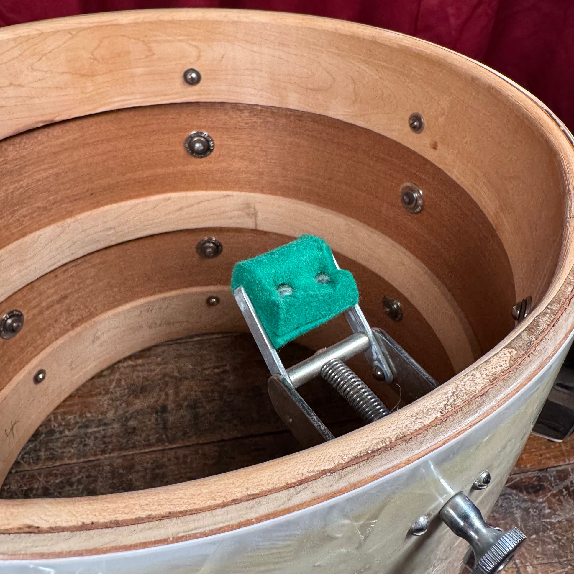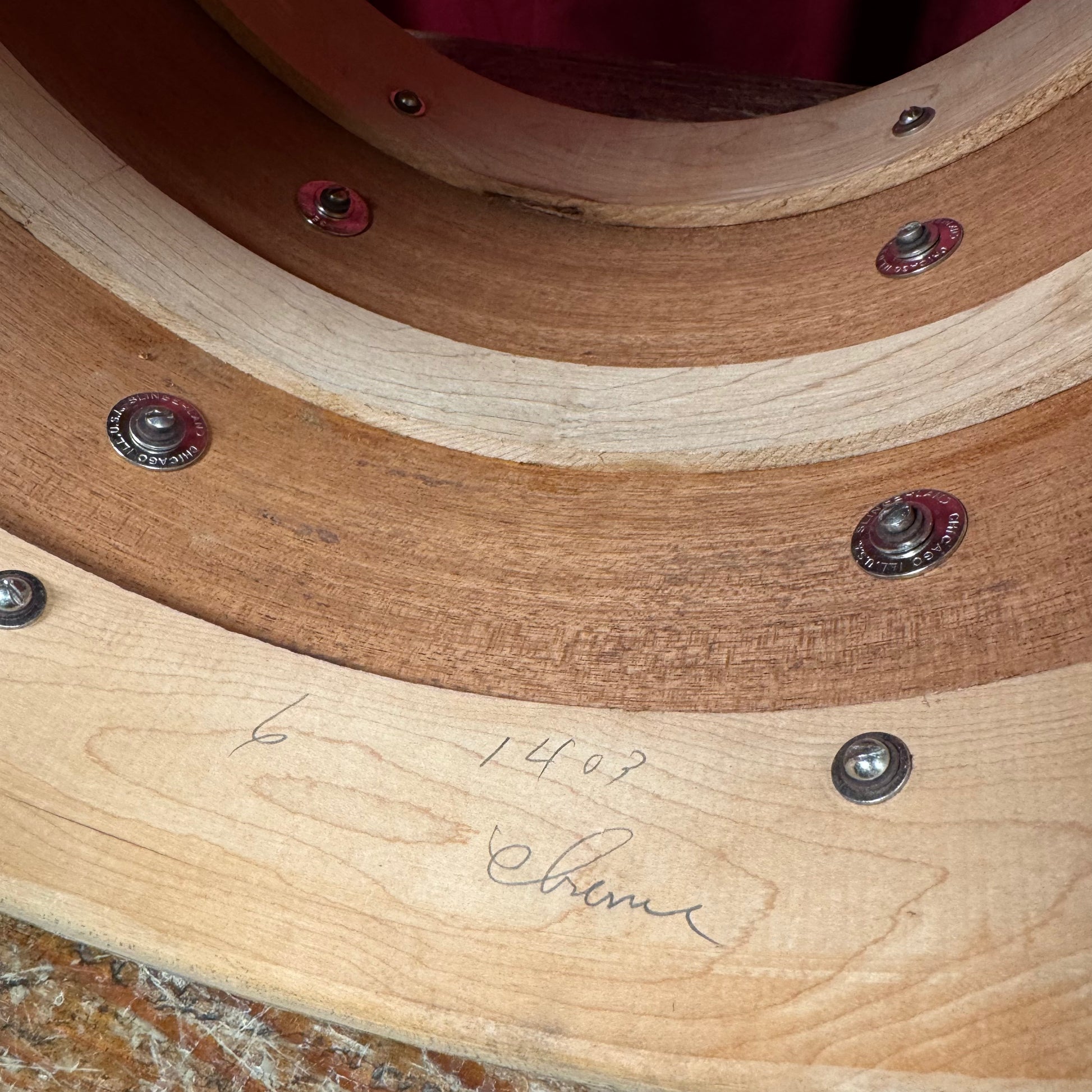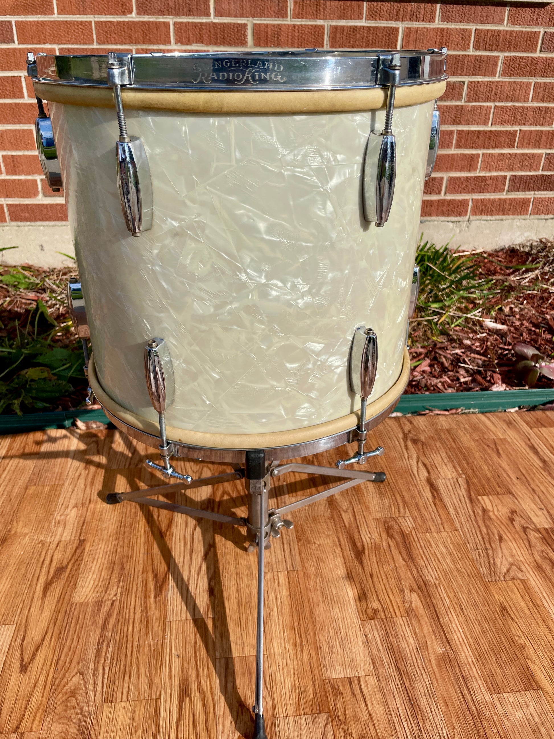 For your supreme viewing pleasure is this rare vintage Slingerland 12x14 Radio King tom from the 1930s with original cradle. This drum was originally owned by Barrett Deems, who famously played with Louis Armstrong. The beautiful White Marine Pearl wrap is in excellent shape with a tight seam. Made during Slingerland’s golden era, this rare pre-war drum showcases the craftsmanship and warm, resonant tone that made Radio Kings legendary among jazz and swing drummers. There are no additional holes or modifications. This stunner is 100% original including heads and cradle. This is a beautiful piece of early drum history that deserves a loving home. Enjoy!