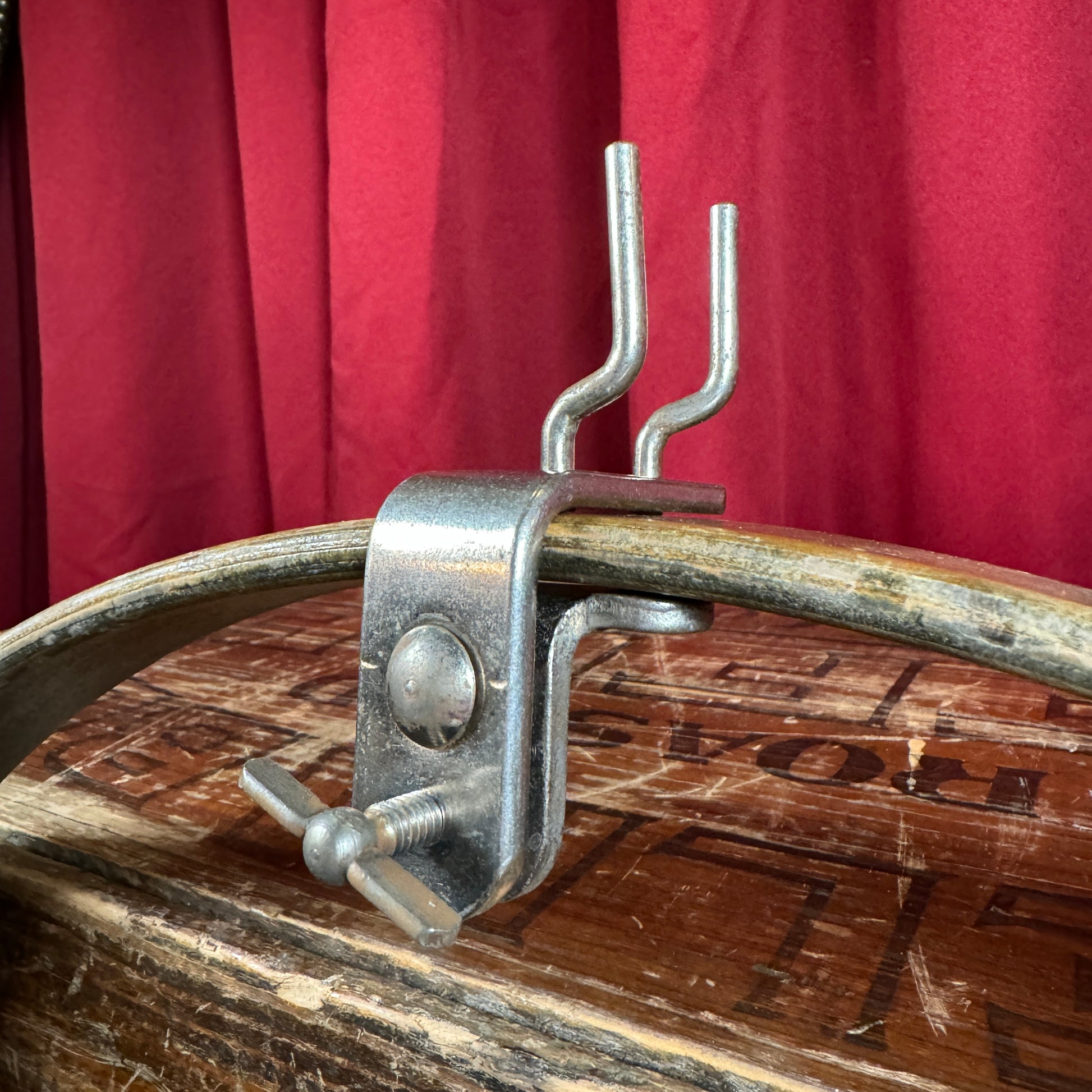 For your kind consideration is this vintage Ludwig No. 468 wood block holder from the 1940s. It's in excellent condition with very light aging. Mounts to the bass drum hoop or the edge of a trap table. The block mount sits 2" high from the base. Enjoy!