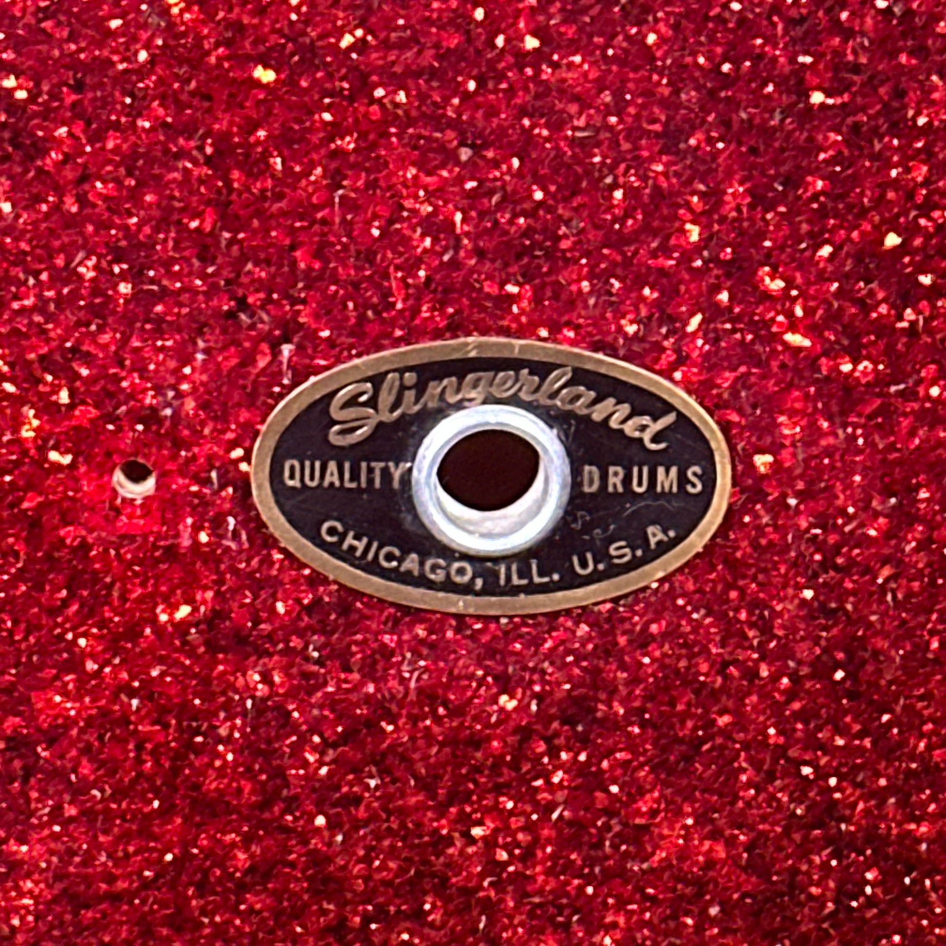 For your kind consideration is this vintage Slingerland Parade King 12x15 marching snare tom or bass drum conversion from the late 50s. This 3-ply mahogany interior drum is sporting a red sparkle wrap that has faded to a deep hue with light signs of wear. It has an internal date stamp of of DEC 18 195X and is sporting the 1956-1959 Black & Brass Chicago badge. The strainer, butt plate, key holder, and muffler have been removed. It has the original chrome over brass Stick Saver batter and snare side hoops that are in very good condition. There are no extra holes or modifications that have been performed. Most importantly it tunes up well and sounds great. This drum would be great option as a tom or to use for small bass drum project or restored as a marching snare. Enjoy!