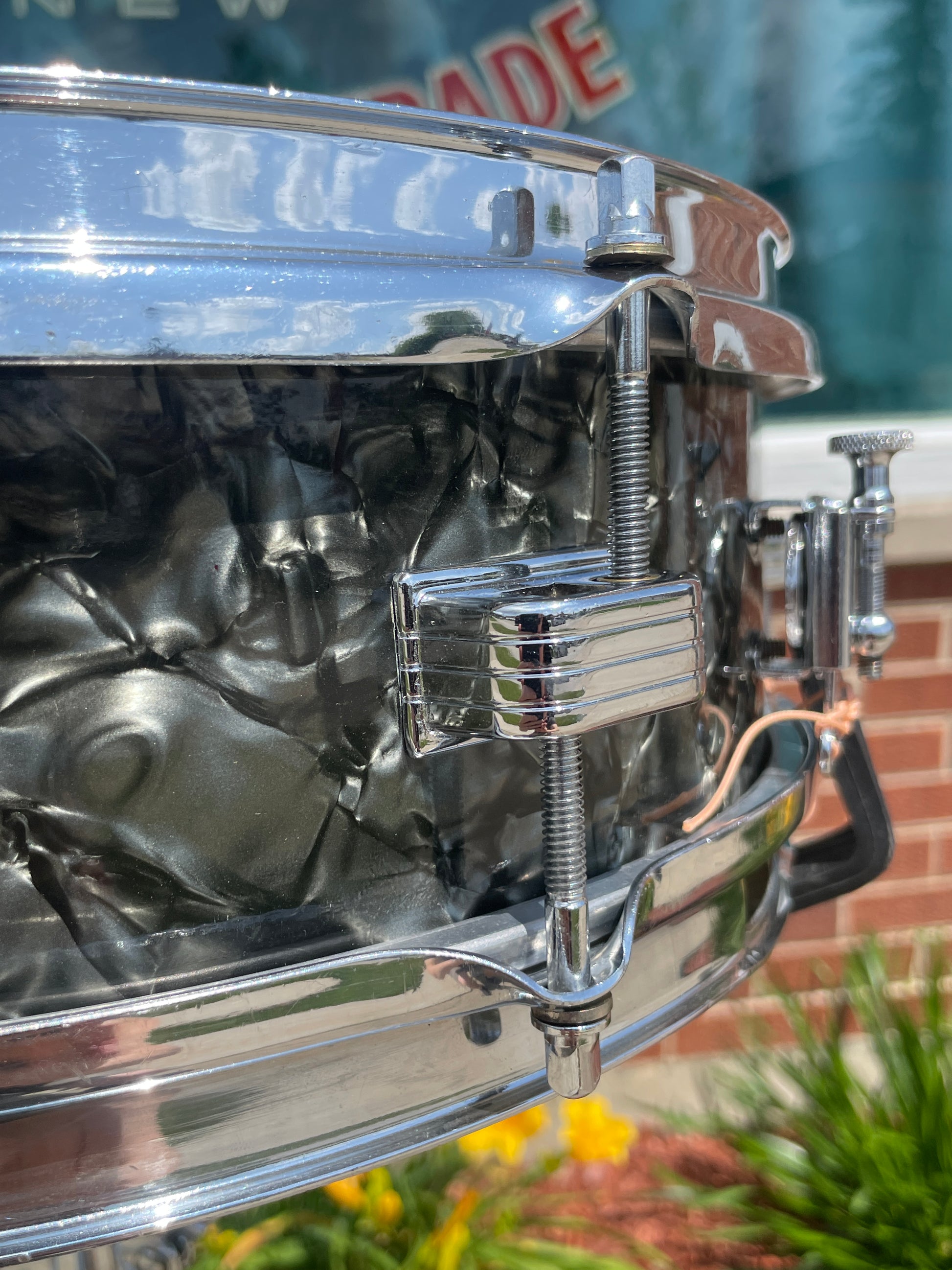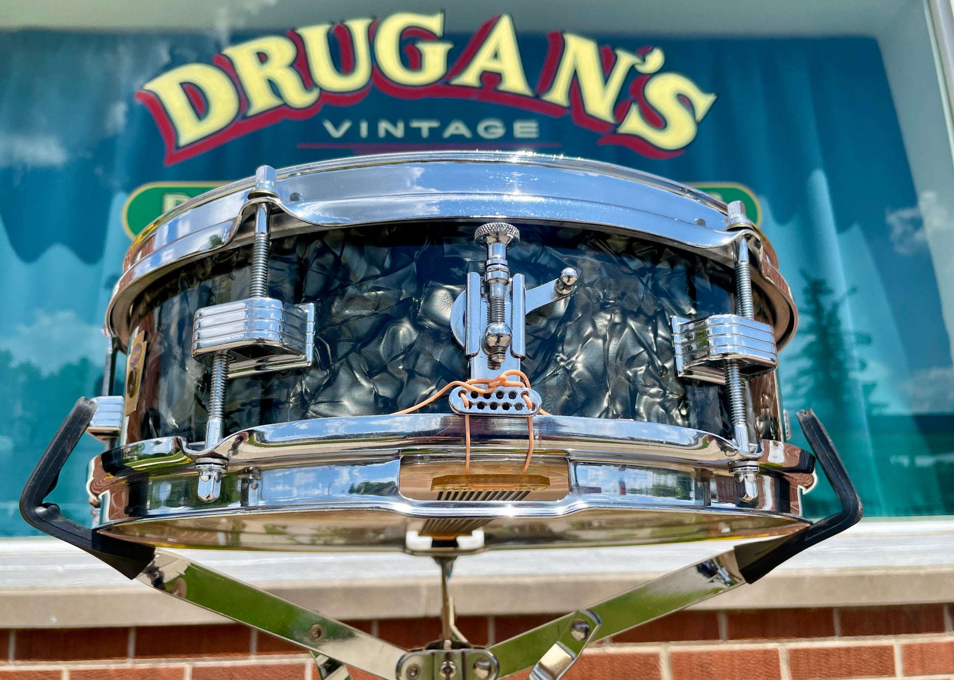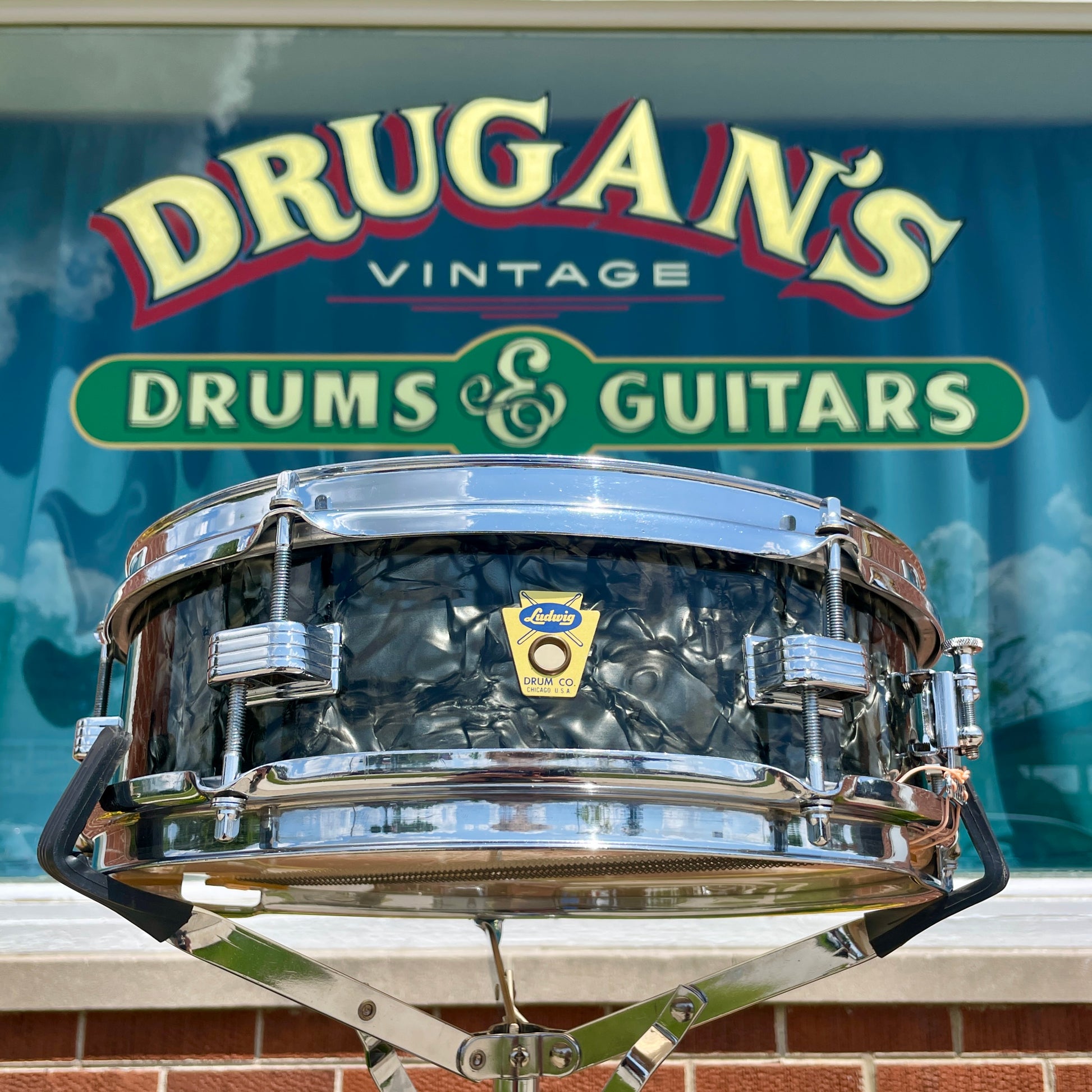 For your supreme viewing pleasure is this very rare vintage Ludwig 4x13 Las Vegas model snare drum in Black Diamond Pearl from the late 50s. Not to be confused with the more commonly seen 3x13 Jazz Comb snares, these guys had an extra 1" of depth and were only around for a very short time, making only one catalog appearance in 1960 and gone by time their next catalog came out in '62. It's all original down to the Playon Plastic heads and wires and is in excellent condition. The transition era Keystone badge is nice and tight and dates this to 1958-60 when this model first appeared in the catalog. The original chrome over brass hoops look great with light signs of age and two small dents/bends in the top hoop as shown that do not affect the tuning or sound in any way. It's sporting the original butt plate and throw-off. There are no extra holes or modifications. Most importantly, this fine instrument tunes up with the greatest of ease and sounds beyond fantastic. This drum would equally be at home amongst the finest of collections, studios, or stages. Enjoy!