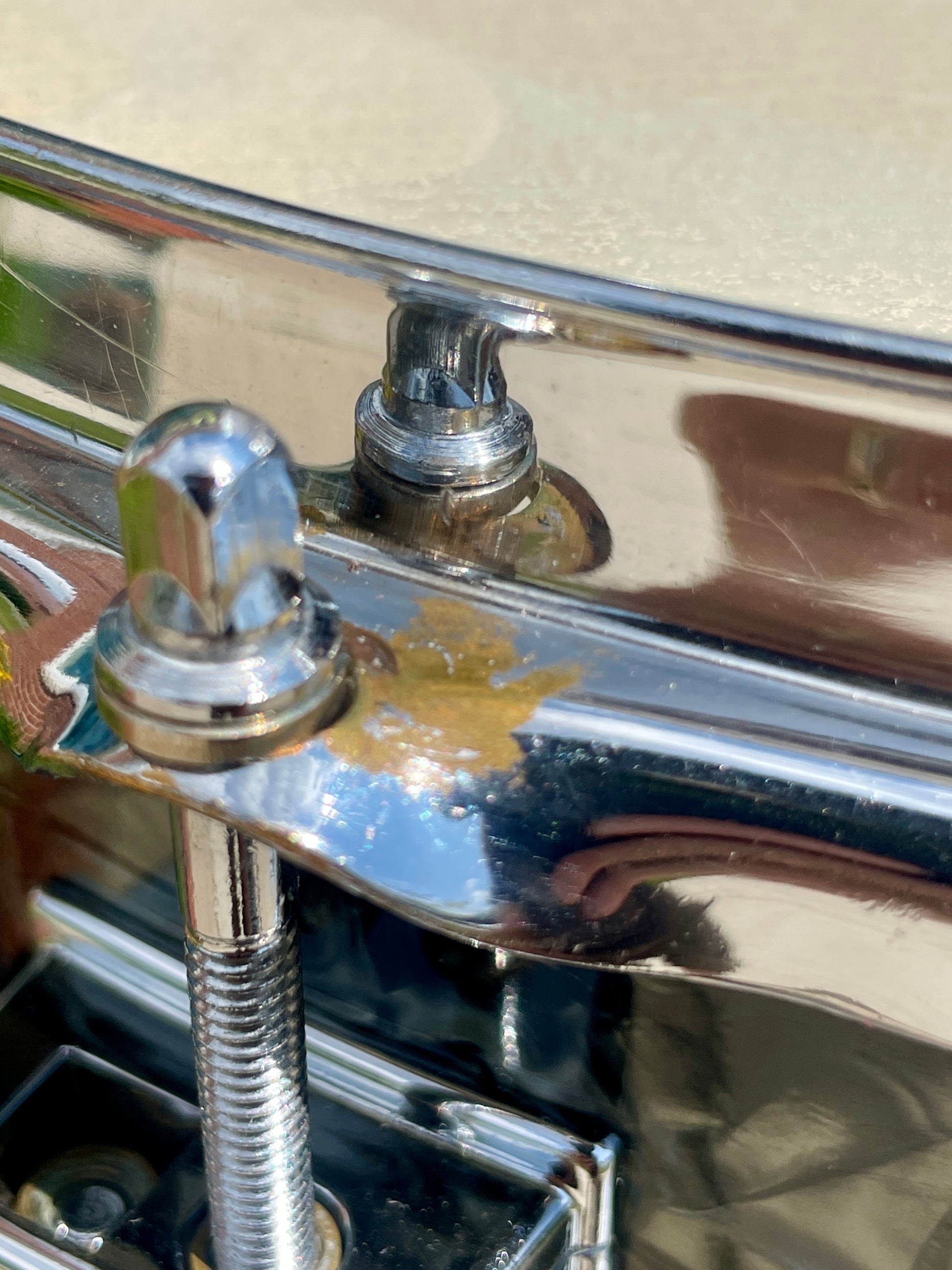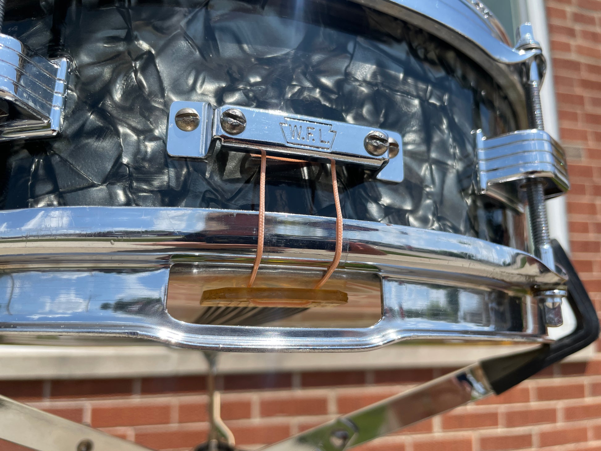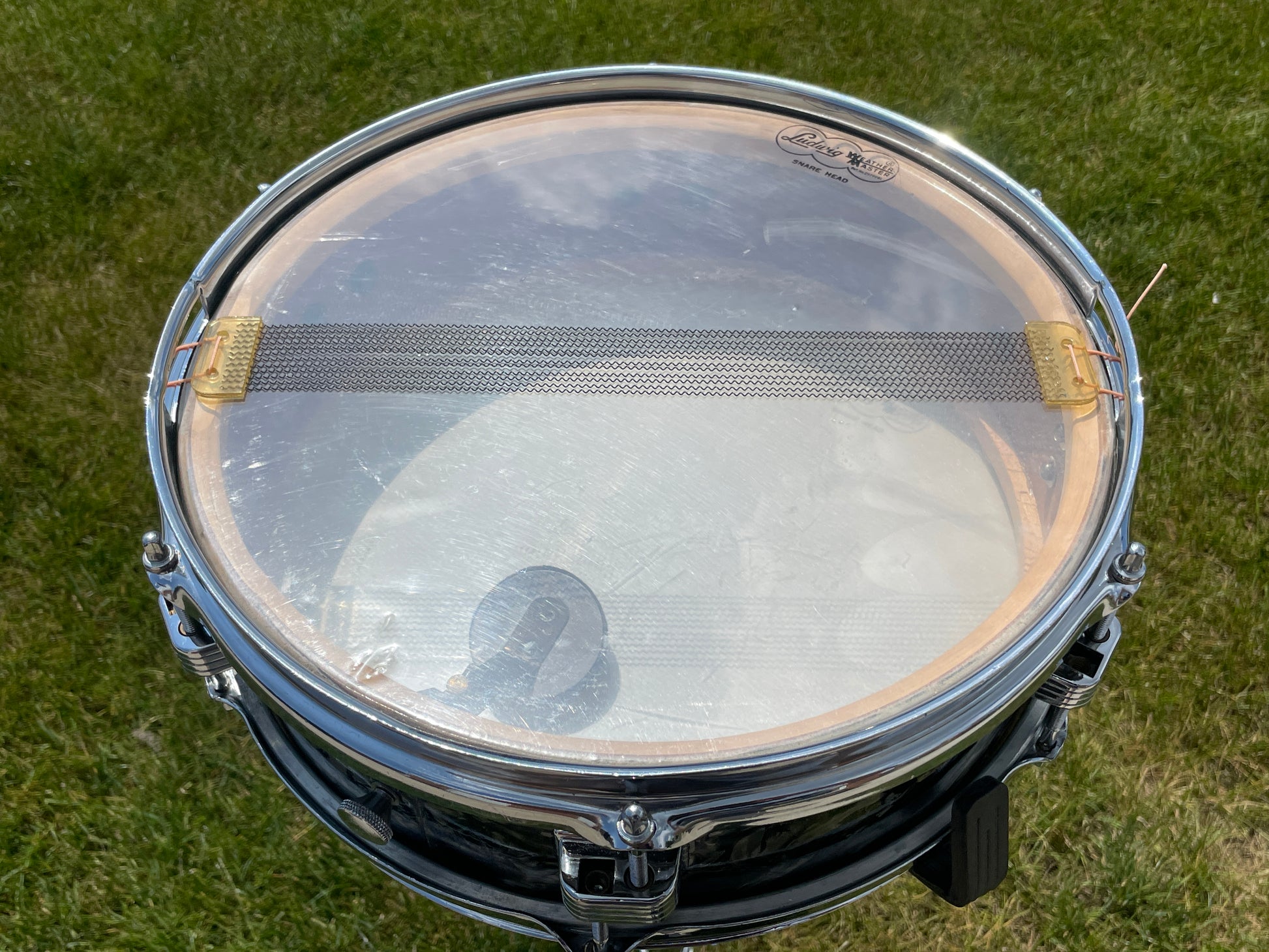 For your supreme viewing pleasure is this very rare vintage Ludwig 4x13 Las Vegas model snare drum in Black Diamond Pearl from the late 50s. Not to be confused with the more commonly seen 3x13 Jazz Comb snares, these guys had an extra 1" of depth and were only around for a very short time, making only one catalog appearance in 1960 and gone by time their next catalog came out in '62. It's all original down to the Playon Plastic heads and wires and is in excellent condition. The transition era Keystone badge is nice and tight and dates this to 1958-60 when this model first appeared in the catalog. The original chrome over brass hoops look great with light signs of age and two small dents/bends in the top hoop as shown that do not affect the tuning or sound in any way. It's sporting the original butt plate and throw-off. There are no extra holes or modifications. Most importantly, this fine instrument tunes up with the greatest of ease and sounds beyond fantastic. This drum would equally be at home amongst the finest of collections, studios, or stages. Enjoy!