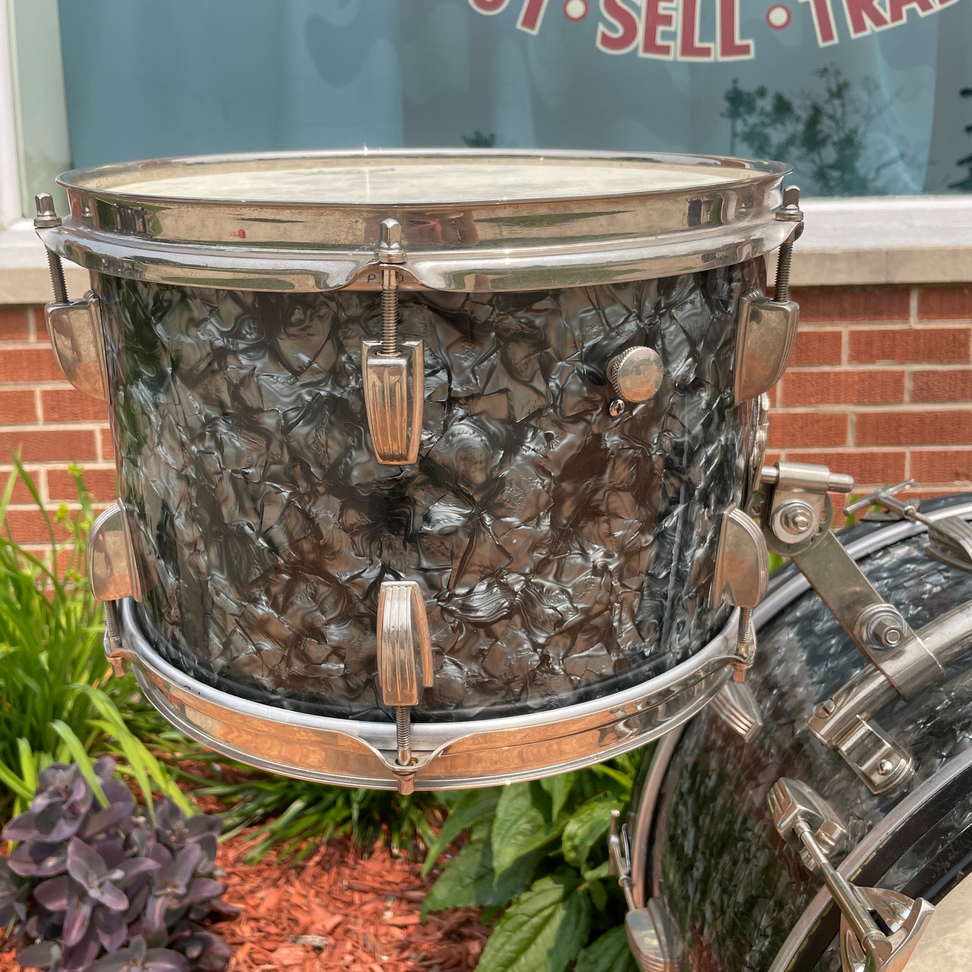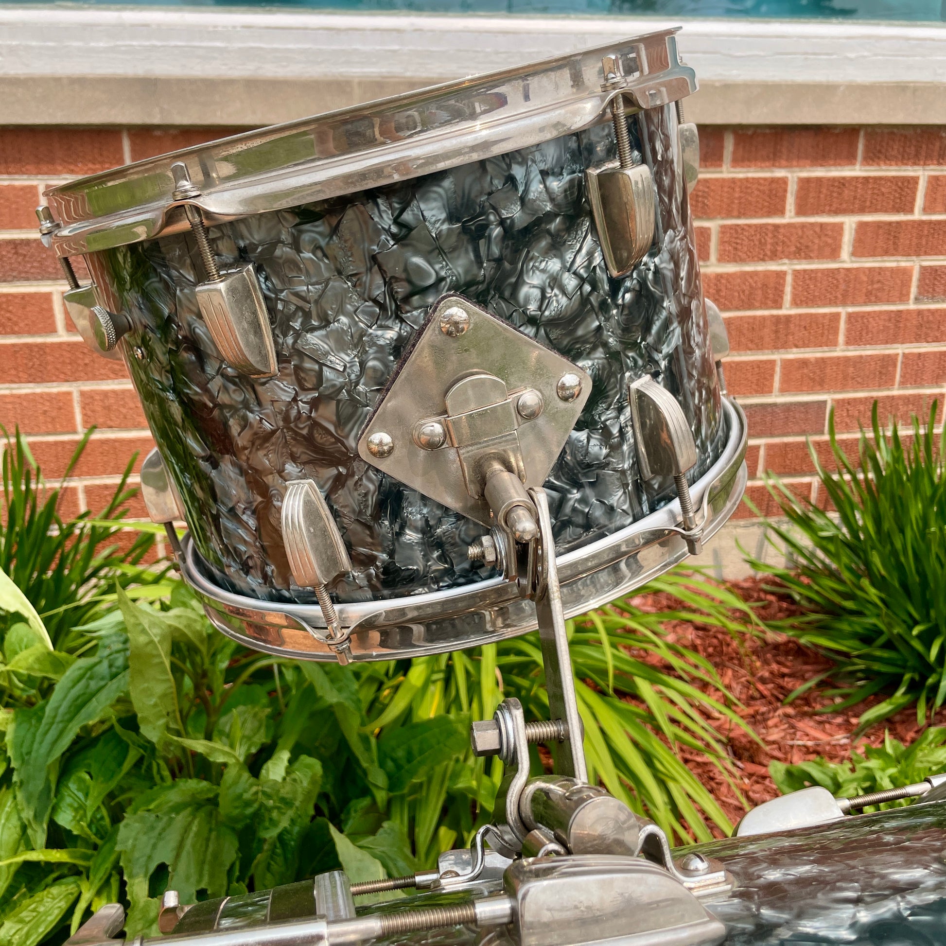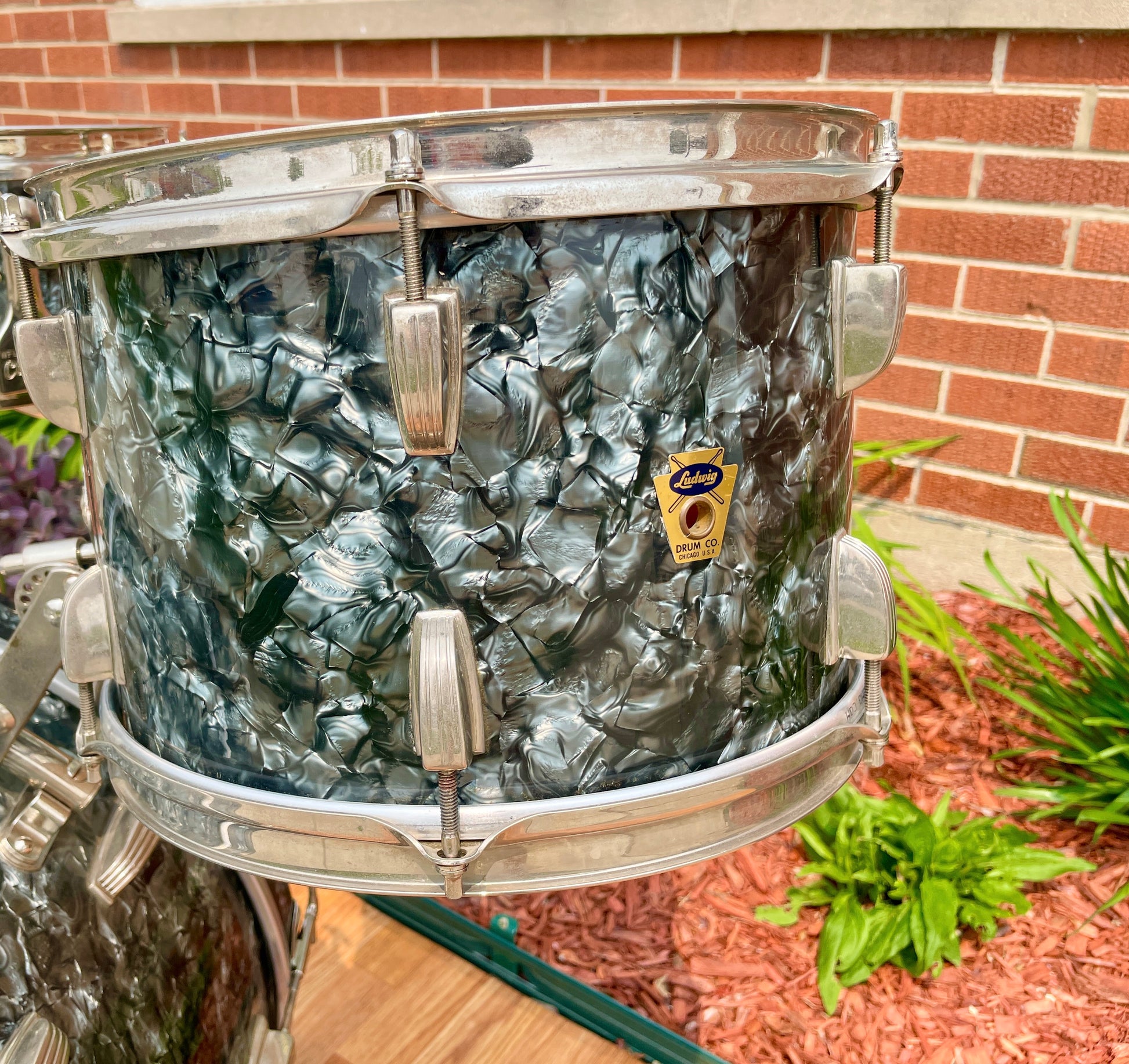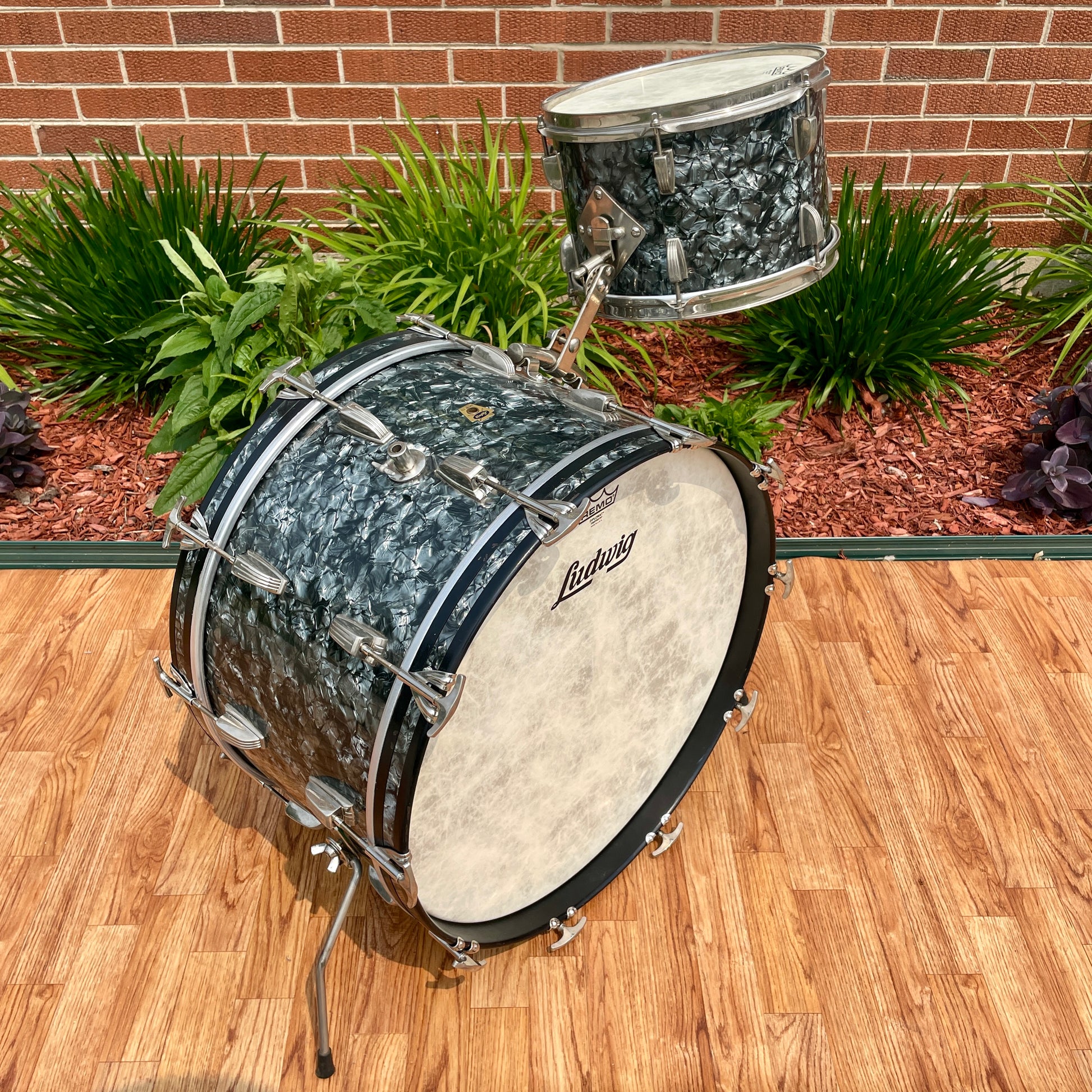 For your prime viewing pleasure is this transition era Ludwig New Yorker outfit in a lovely Black Diamond Pearl. It's in collector's condition and is all original aside from the heads. The nickel hardware displays well with some light signs of age. It has the original cymbal mount and rail mount which are both fully functional. It's sporting the 1958-1959 Keystone Transition badges which are securely attached and the tom has an internal date stamp of OCT 30 1959. There are no extra holes or modifications. Most importantly, this set tunes up wonderfully and is an absolute pleasure to play. Enjoy!