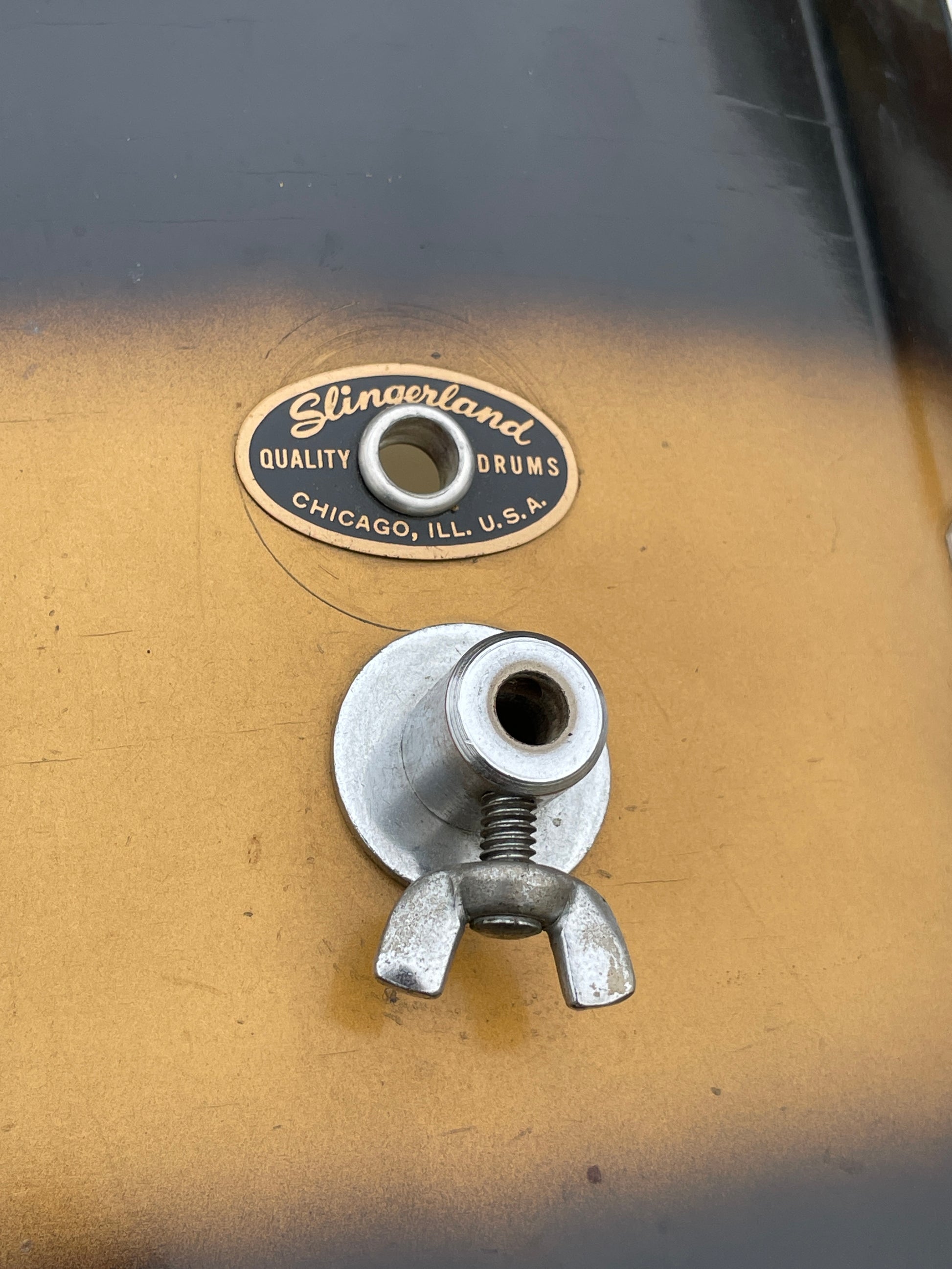 For your prime viewing pleasure is this vintage Slingerland Swingmaster Ensemble 5-N Outfit as cataloged in 1959. This well cared for closet classic is in wonderful condition with all of the original accessories, including the brushes, cow bell & wood block with combo bass hoop mount, bass drum cymbal holder, snare stand, and Epic bass drum pedal. The Black & Gold two-tone Duco finish is in great condition and there are no extra holes or modifications. The bearing edges are original and the chrome has all aged beautifully. The 5.5x14 snare is all original down to the heads and wires. The awesome 12x22 bass is all original as well with the gold sparkle inlay hoops and calf heads with the original owner's super vibey front bass drum head painted with "The Figs". The 8x12 rack tom is also original including the calfskin heads which tune up wonderfully. These have the first version Black and Brass Chicago badge used from 1956-1959. It's rare to find an original set like this with all of the ultra cool accessories. Enjoy!