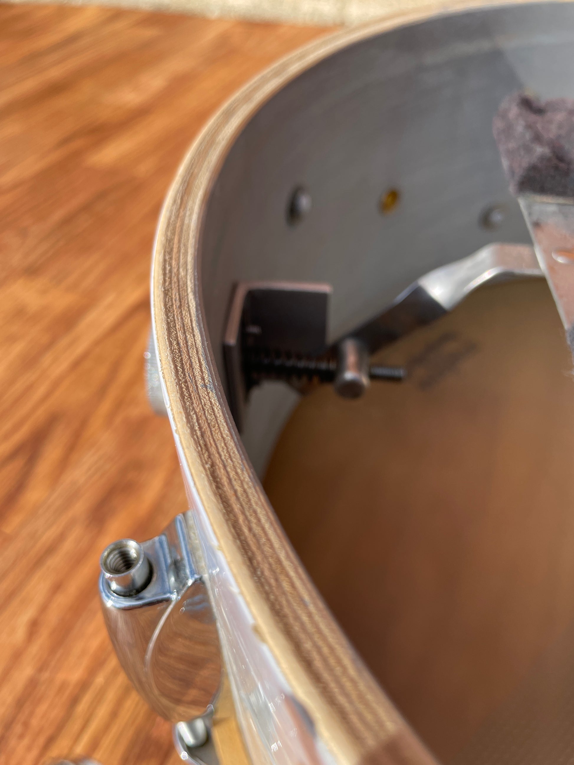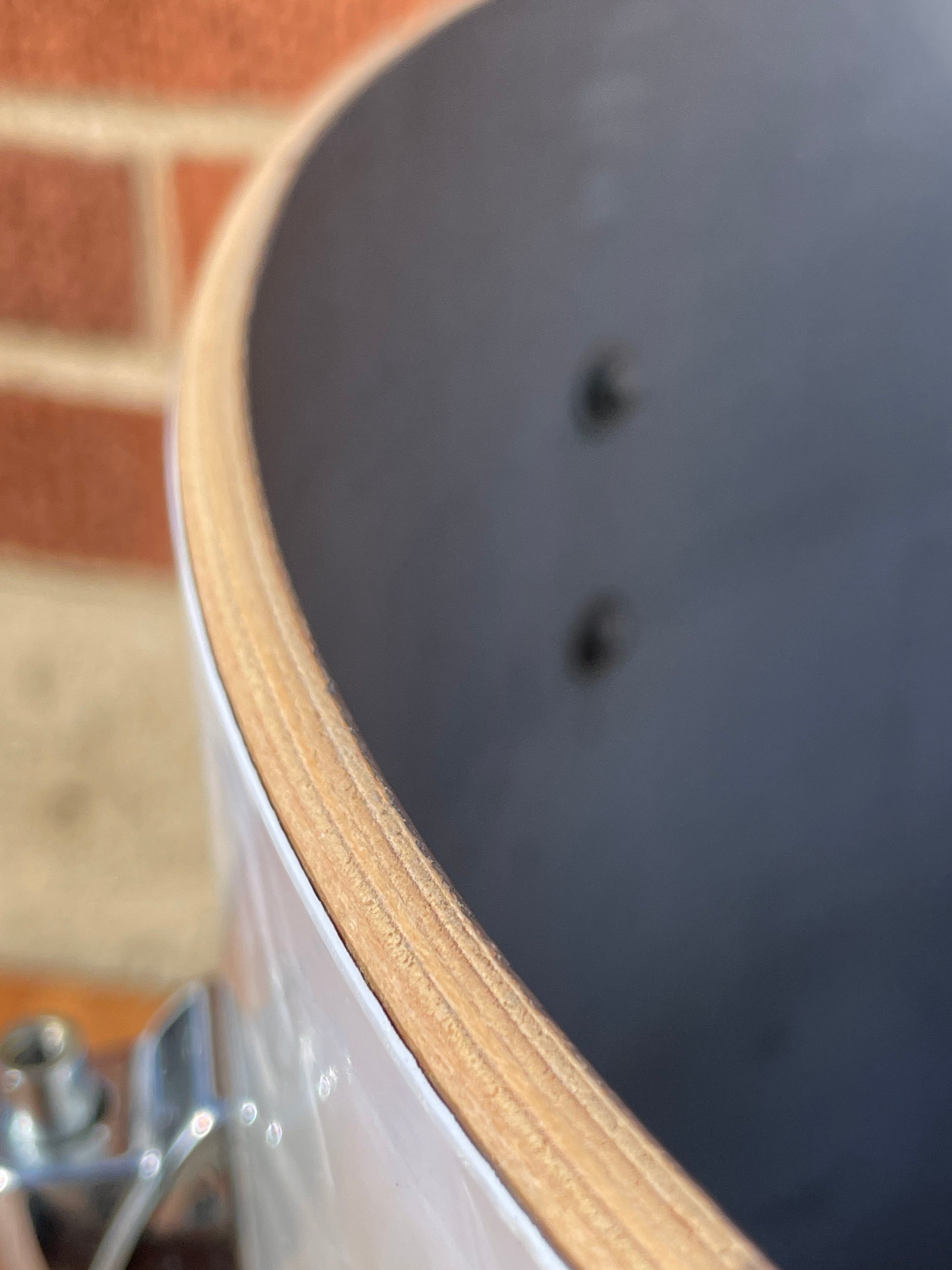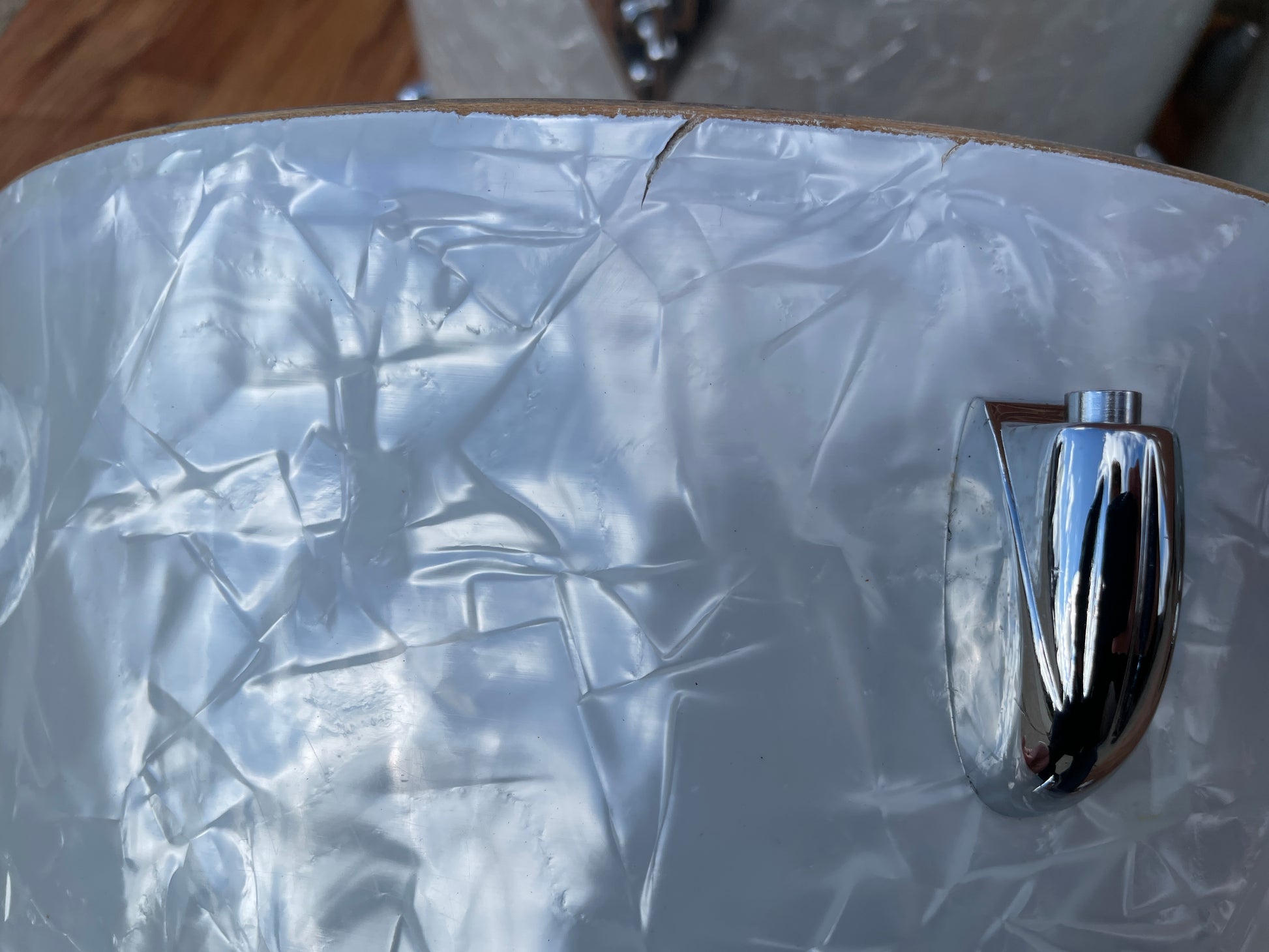 The original hardware is clean and brilliant. The original front logo calf skin bass drum head is a crown jewel. The bearing edges are all true and original, and there are no extra holes or modifications. The interiors of the early 6 ply Jasper shells are all adorned with silver sealer paint (as Gretsch enthusiasts know, the early silver sealer drums did not have paper tags). The snare drum still has the original Gretsch wires and heads, which still sound fantastic. All of the tone controls (top and bottom) are nice and fully functional, as is the original Jimmy Pratt bass drum muffler. There are a few commonly seen small incidental splits that naturally occurred early on in their life as seen in the pics, only one of which is visible when the heads are on (located at the seam of the floor tom), but are extremely stable, flat to the shell, and have remained the same for decades per the previous owner who had them since the '80s.