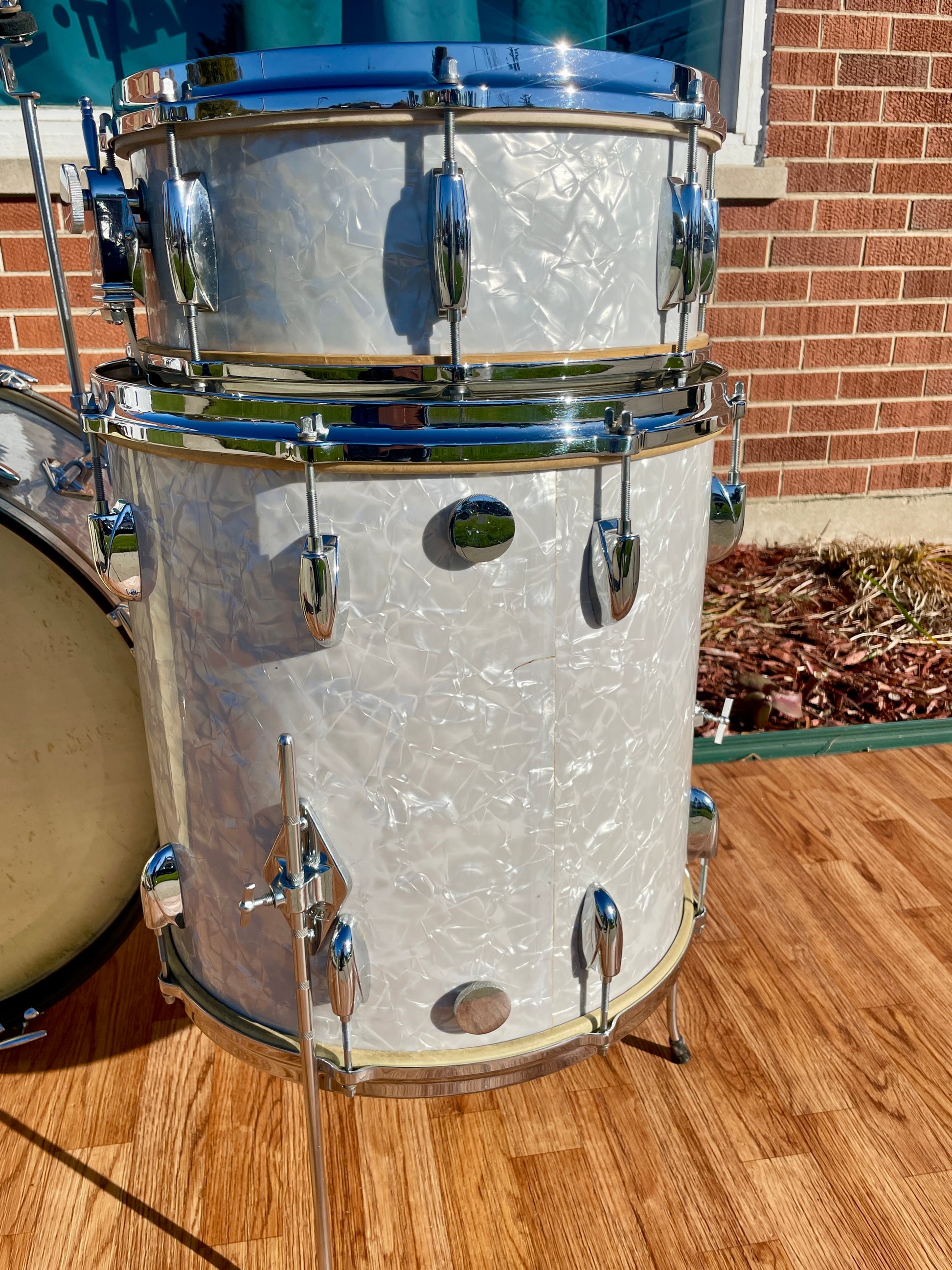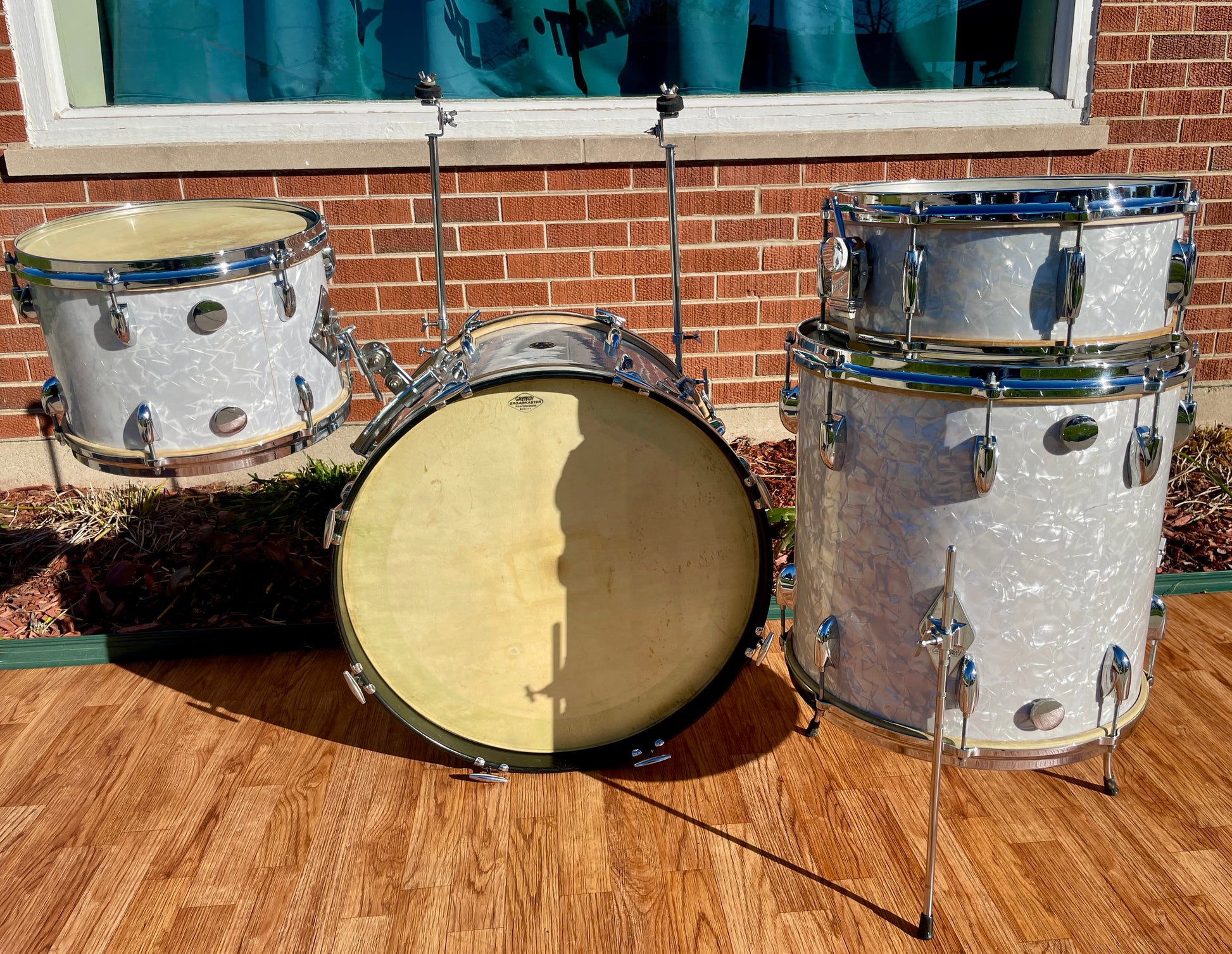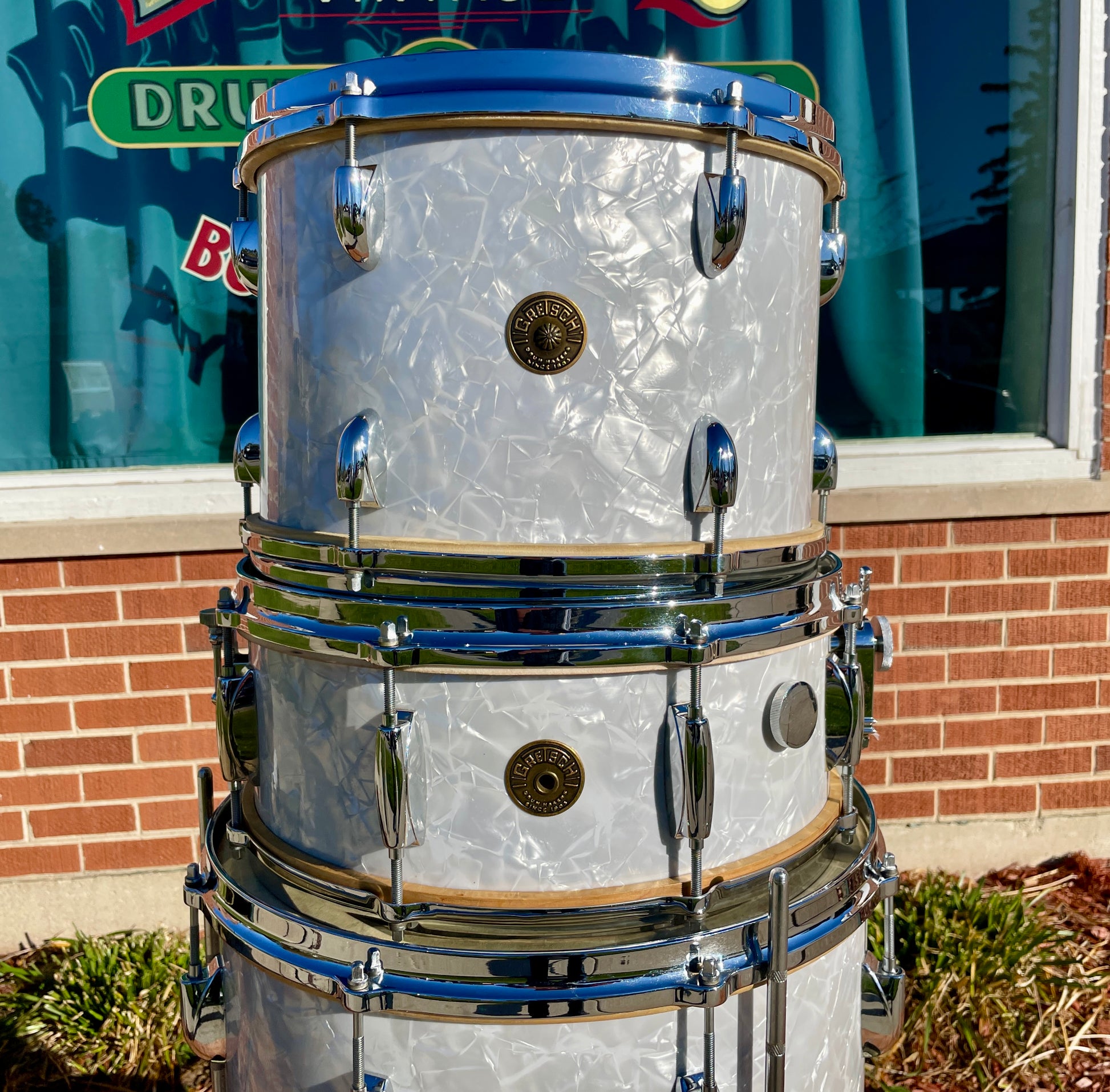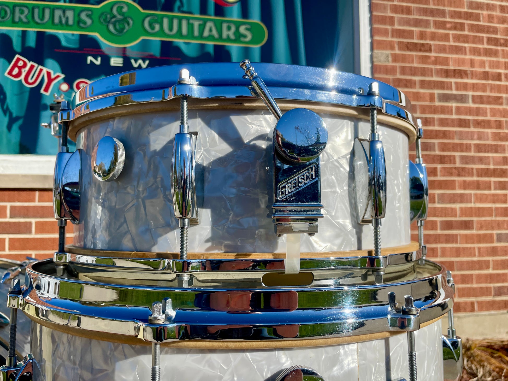 1950s Gretsch 6 ply Round Badge Name Band Outfit Drum Set White Marine Pearl 22/13/16 w/ 5.5x14 Snare