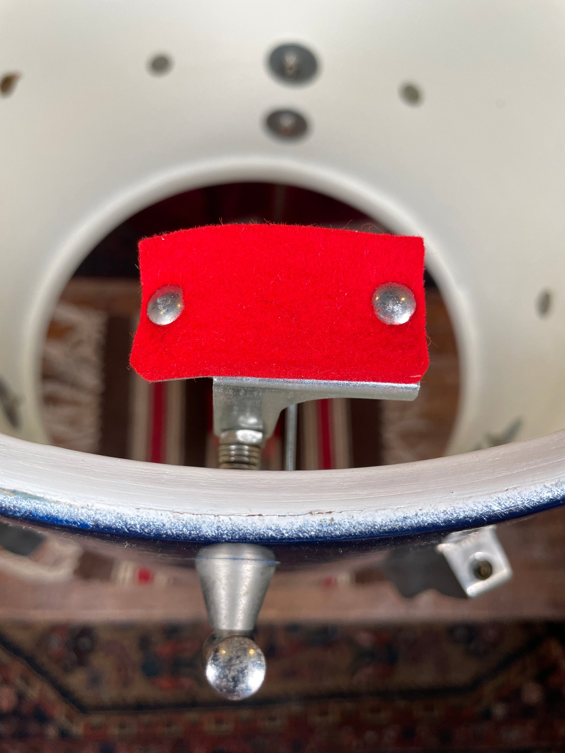 For your prime viewing pleasure is this vintage Ludwig 14x14 Downbeat floor tom from 1963-65. This drum is in well taken care of condition and the Silver to Blue Duco finish is beautiful. It's in great shape with some oxidation on the nickel over brass hoops and legs as seen in pics. The shell is 3-ply mahogany with re-rings and a white interior. The keystone badge is nice and tight. All original aside from the heads, which are era-correct, and correct Ludwig spring loaded leg brackets. There are no extra holes or modifications and the bearing edges are true and original. The red felt baseball bat muffler is present and operates smoothly. Most importantly it tunes up easily and sounds fantastic. This would make a great addition to your vintage Ludwig outfit. Enjoy!