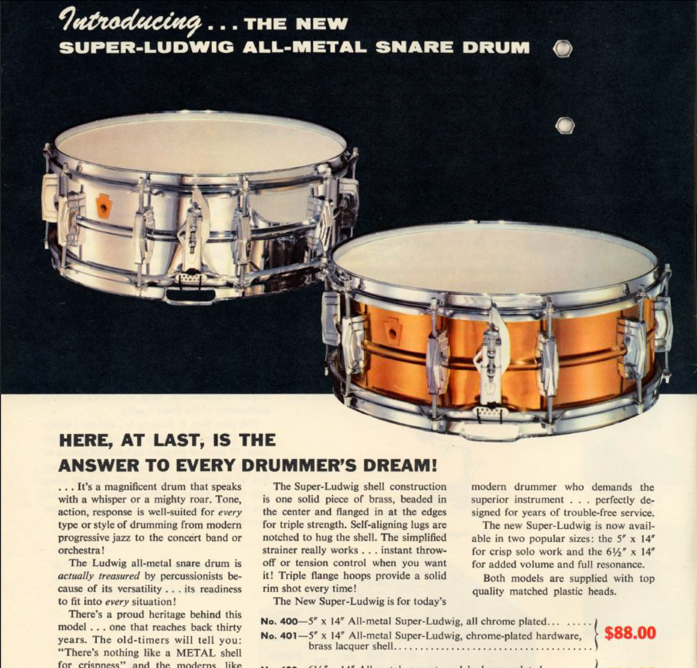 The Super 401 model designation signified a 5x14 lacquered one-piece brass shell, and was only briefly available from roughly 1958-1960. This is sporting a pre-serial Ludwig badge, which dates it to 1960 when the 401 was first introduced in the catalog, and even graced the cover.
