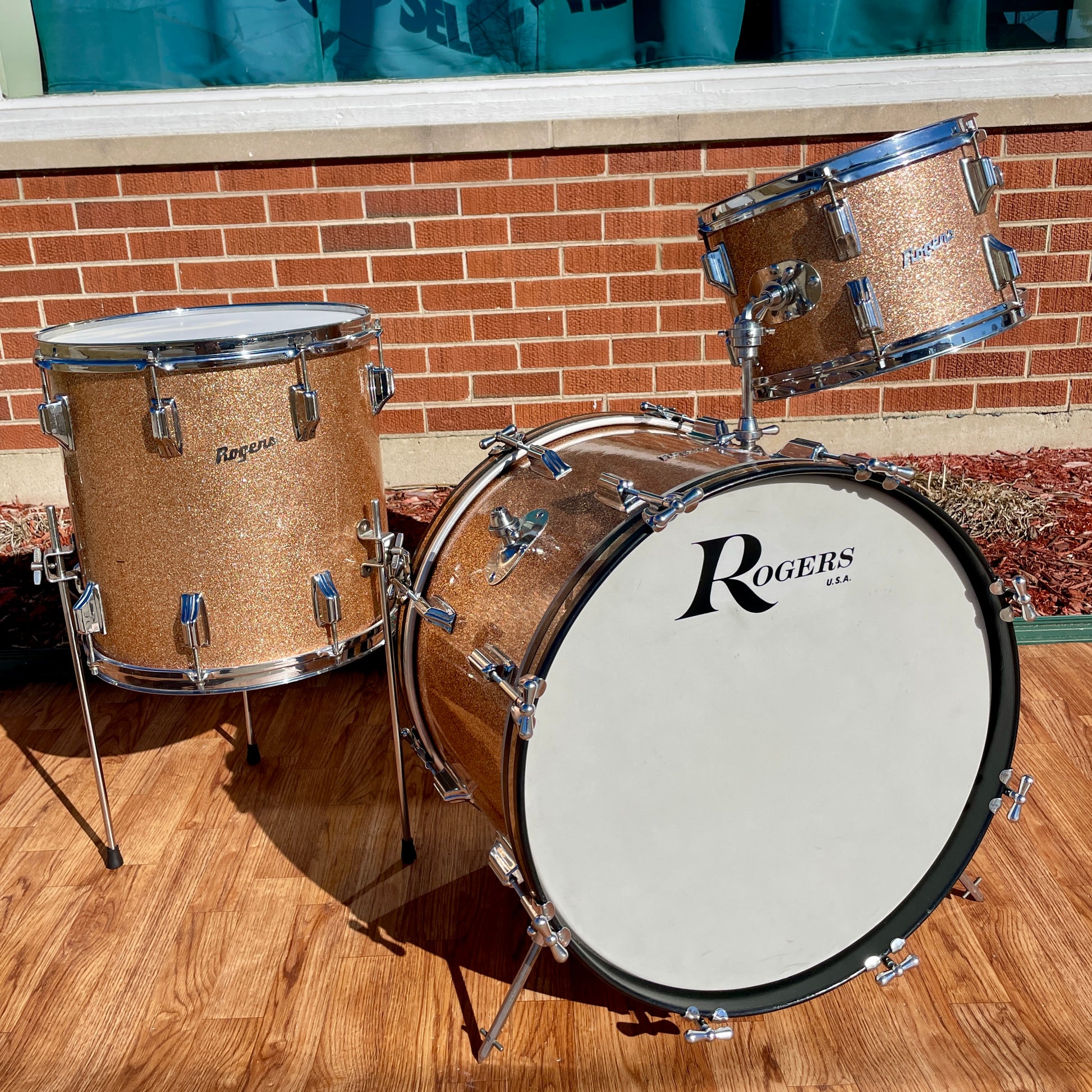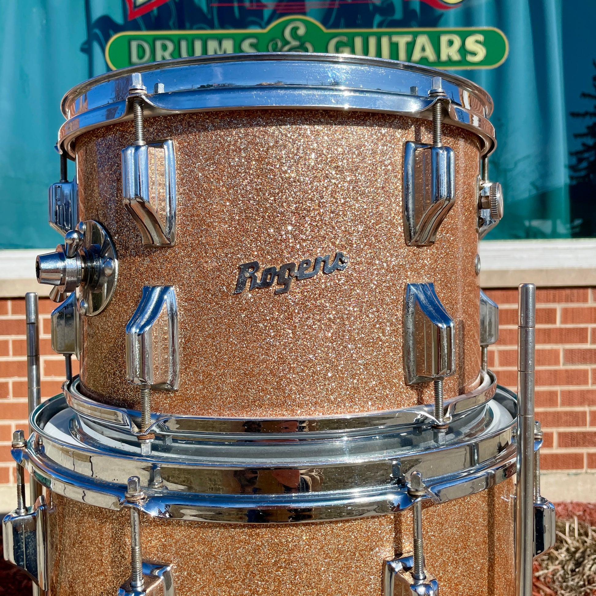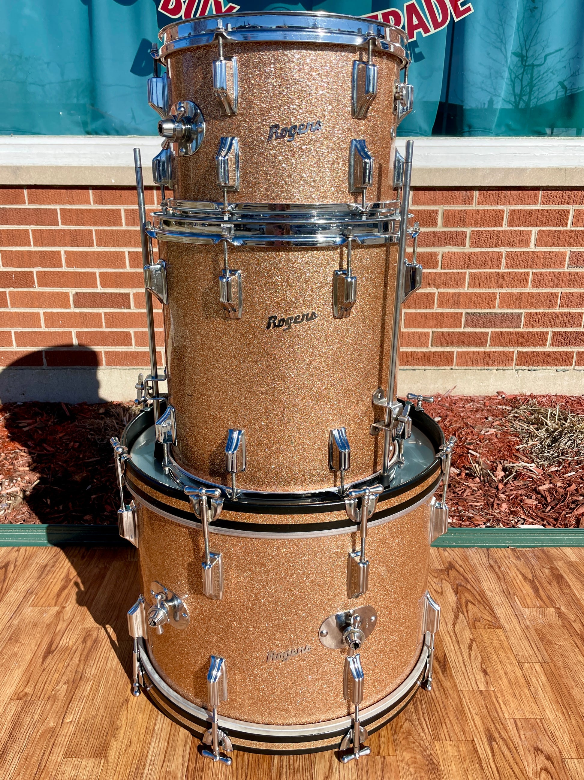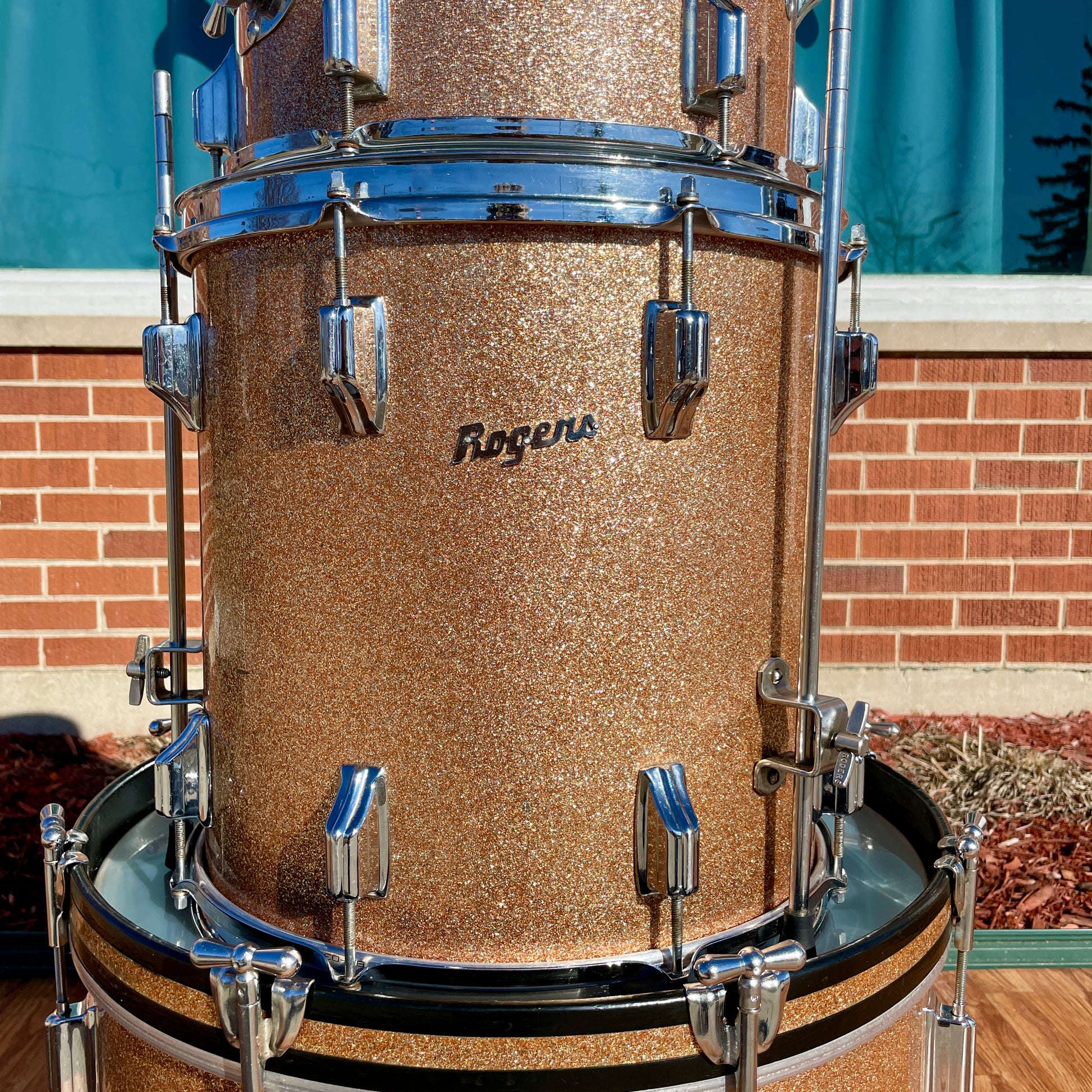 For your prime viewing pleasure is this absolutely gorgeous vintage Rogers Holiday drum set in Pink Champagne Pearl Sparkle from the 60s, which is a glass glitter finish. This set is in terrific, well cared for collectors condition with just a small bit of tom rash as shown in the last photo. The drums have 5-ply flat gray interior shells with Beavertail lugs. The edges are true and original, and there are no extra holes or modifications of any kind. The original wrap is vibrant and is by far one of the best looking Champagne Sparkles ever made. This set was ordered with the ultra cool light weight Sta-Tite floor tom legs instead of the Knobby brackets typically used on Holiday drums of this era, which aid in fast set-up and tear down, not to mention overall resonance from lower metal mass on the shell. The bass drum is equipped with factory telescoping cymbal holder. These all tune up like absolute champs and sound heavenly. Enjoy!