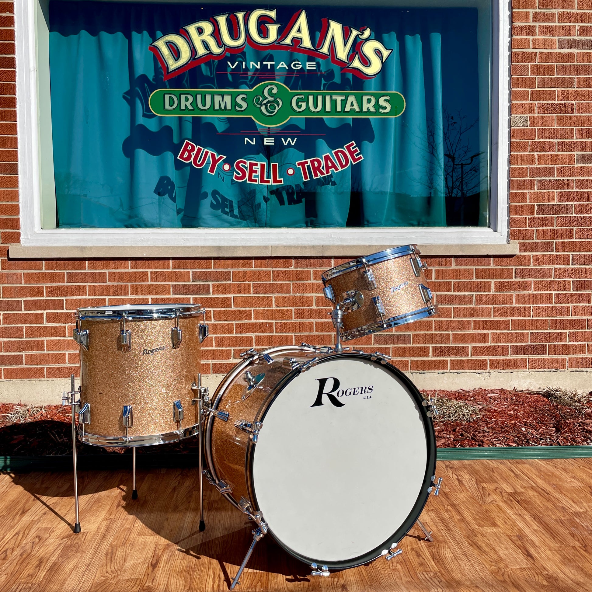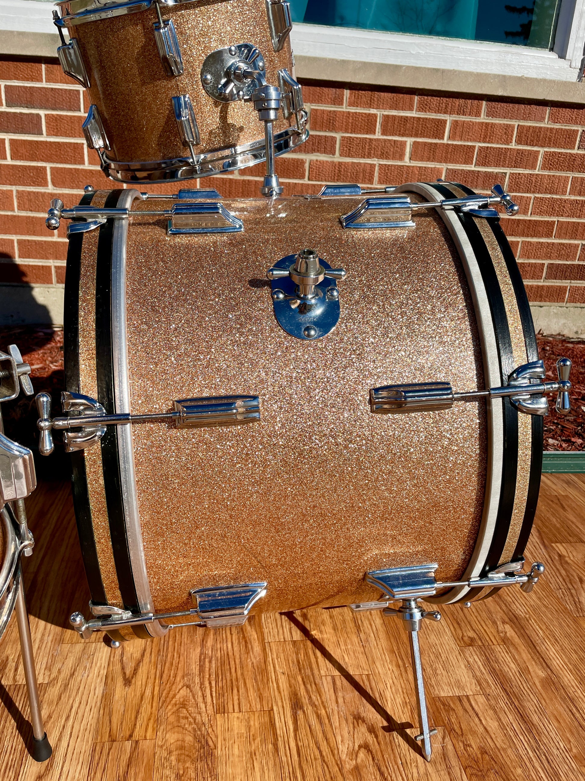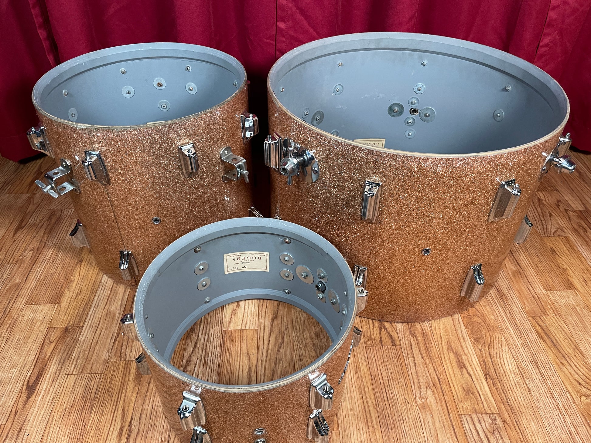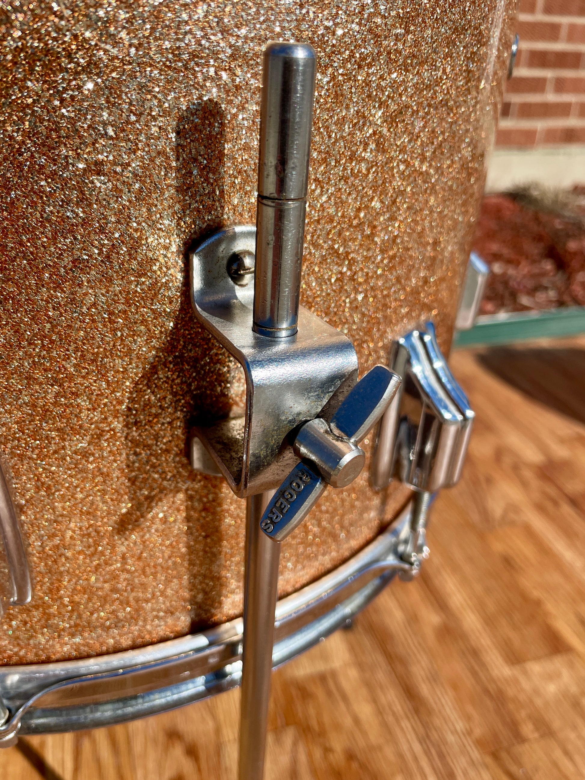 For your prime viewing pleasure is this absolutely gorgeous vintage Rogers Holiday drum set in Pink Champagne Pearl Sparkle from the 60s, which is a glass glitter finish. This set is in terrific, well cared for collectors condition with just a small bit of tom rash as shown in the last photo. The drums have 5-ply flat gray interior shells with Beavertail lugs. The edges are true and original, and there are no extra holes or modifications of any kind. The original wrap is vibrant and is by far one of the best looking Champagne Sparkles ever made. This set was ordered with the ultra cool light weight Sta-Tite floor tom legs instead of the Knobby brackets typically used on Holiday drums of this era, which aid in fast set-up and tear down, not to mention overall resonance from lower metal mass on the shell. The bass drum is equipped with factory telescoping cymbal holder. These all tune up like absolute champs and sound heavenly. Enjoy!