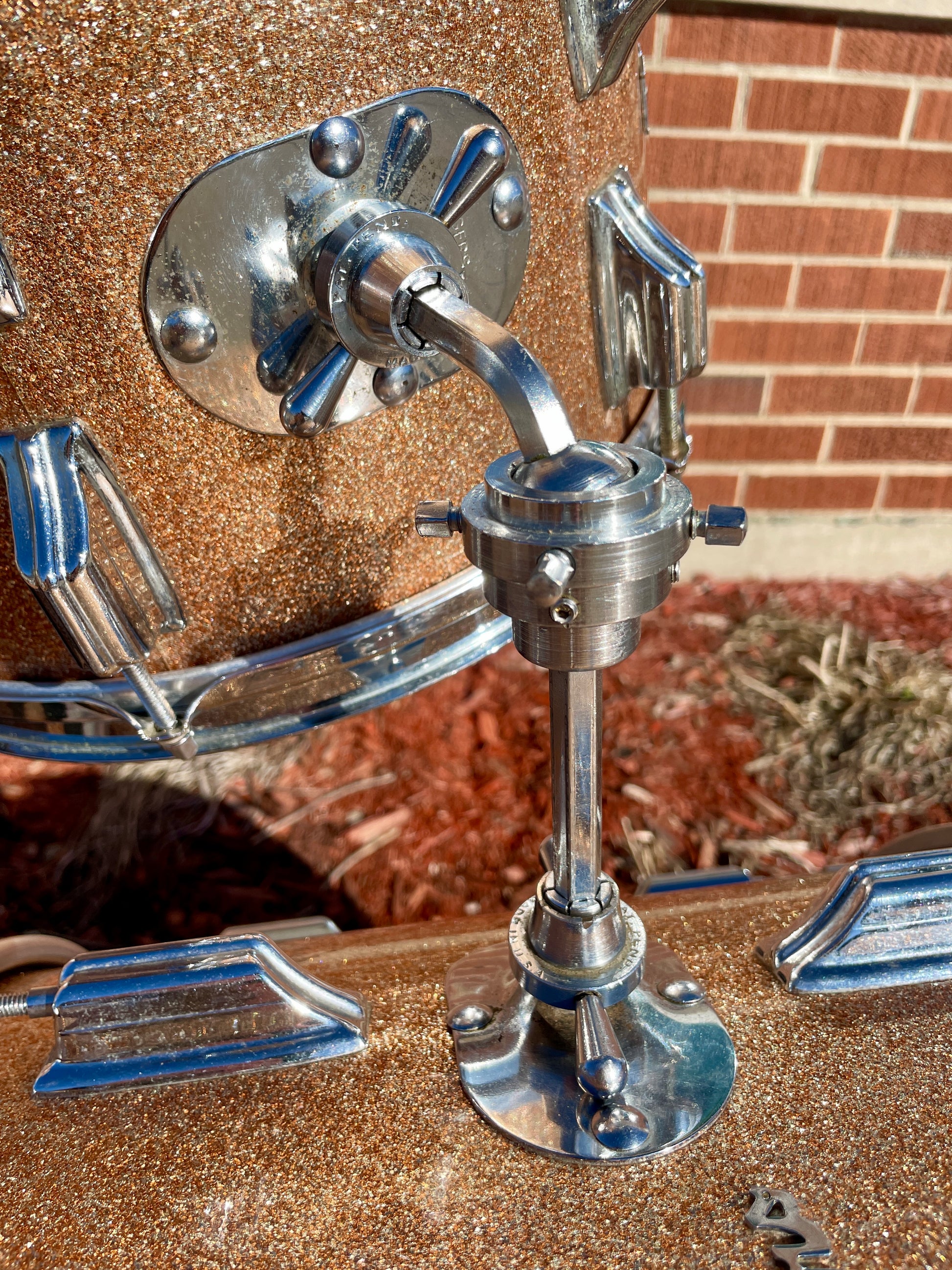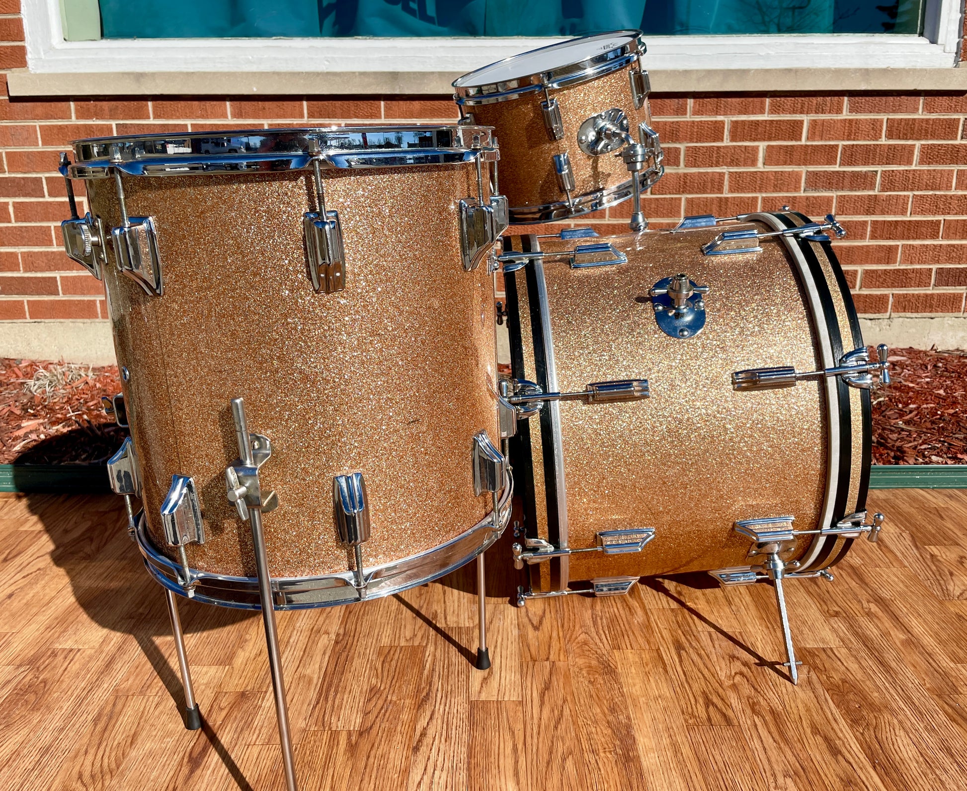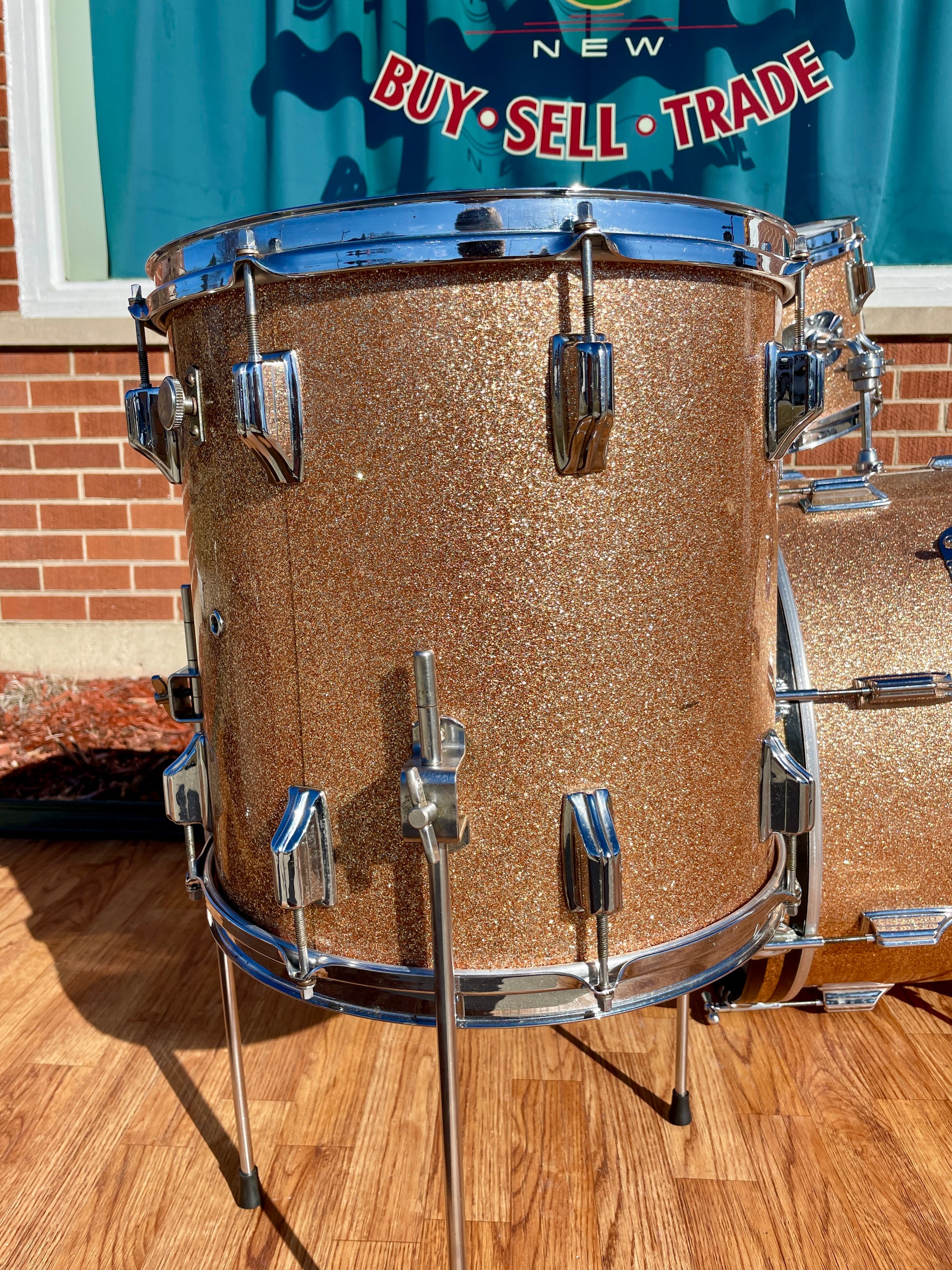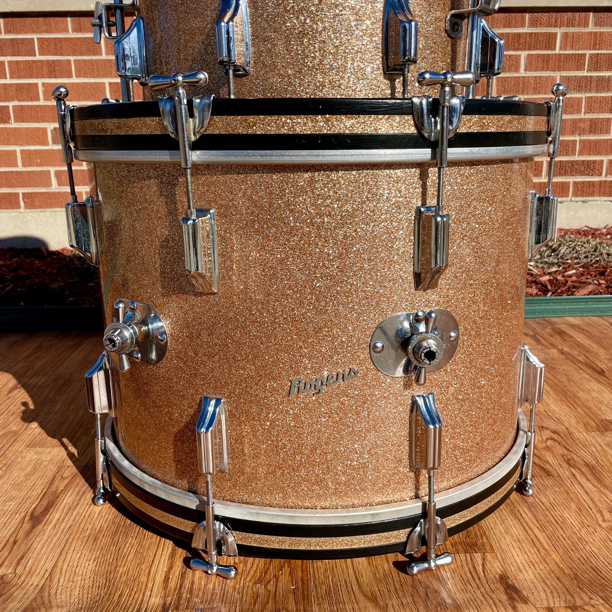 For your prime viewing pleasure is this absolutely gorgeous vintage Rogers Holiday drum set in Pink Champagne Pearl Sparkle from the 60s, which is a glass glitter finish. This set is in terrific, well cared for collectors condition with just a small bit of tom rash as shown in the last photo. The drums have 5-ply flat gray interior shells with Beavertail lugs. The edges are true and original, and there are no extra holes or modifications of any kind. The original wrap is vibrant and is by far one of the best looking Champagne Sparkles ever made. This set was ordered with the ultra cool light weight Sta-Tite floor tom legs instead of the Knobby brackets typically used on Holiday drums of this era, which aid in fast set-up and tear down, not to mention overall resonance from lower metal mass on the shell. The bass drum is equipped with factory telescoping cymbal holder. These all tune up like absolute champs and sound heavenly. Enjoy!