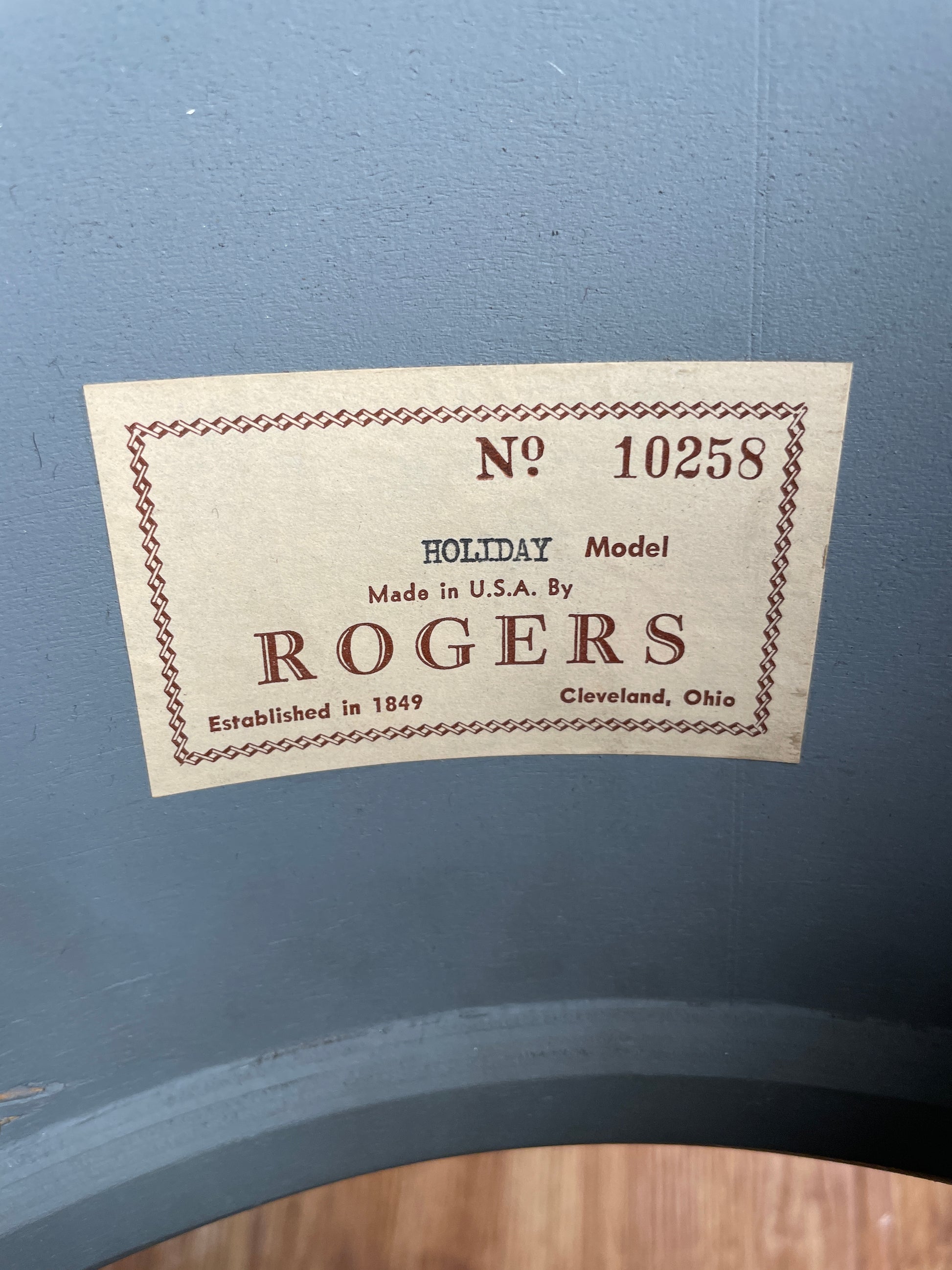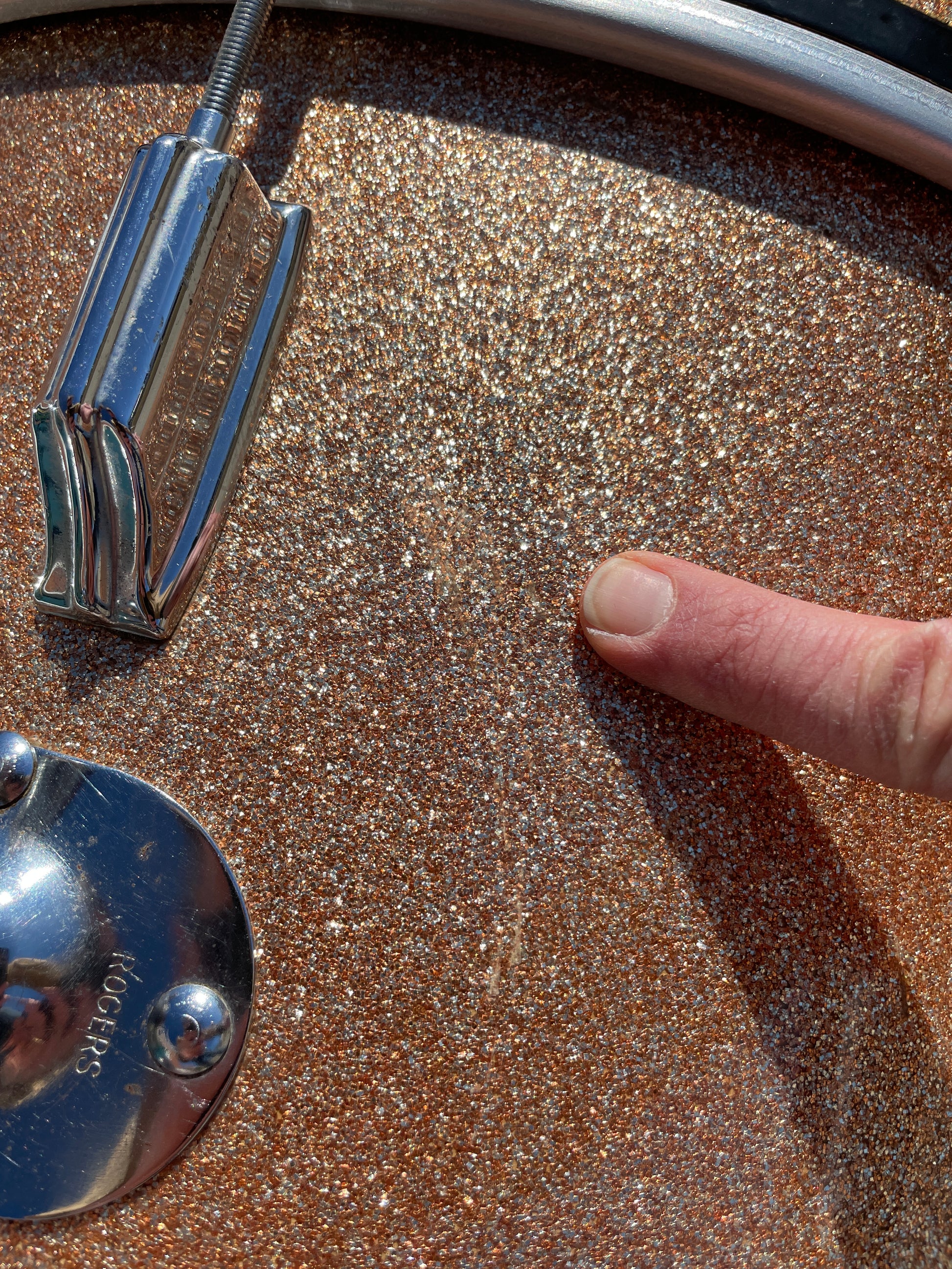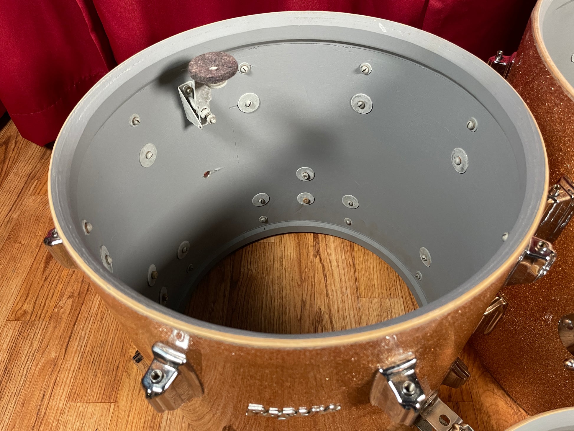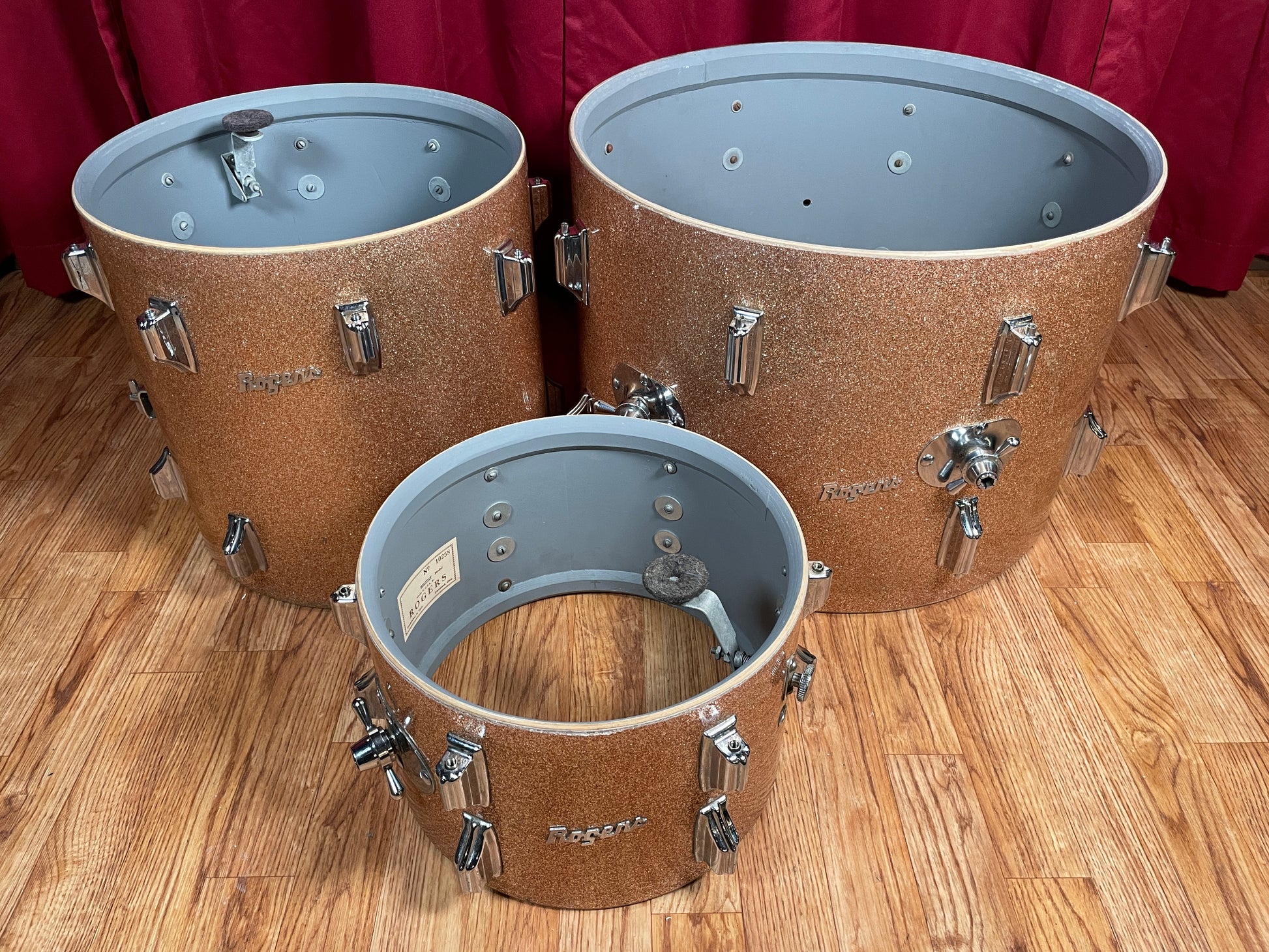 For your prime viewing pleasure is this absolutely gorgeous vintage Rogers Holiday drum set in Pink Champagne Pearl Sparkle from the 60s, which is a glass glitter finish. This set is in terrific, well cared for collectors condition with just a small bit of tom rash as shown in the last photo. The drums have 5-ply flat gray interior shells with Beavertail lugs. The edges are true and original, and there are no extra holes or modifications of any kind. The original wrap is vibrant and is by far one of the best looking Champagne Sparkles ever made. This set was ordered with the ultra cool light weight Sta-Tite floor tom legs instead of the Knobby brackets typically used on Holiday drums of this era, which aid in fast set-up and tear down, not to mention overall resonance from lower metal mass on the shell. The bass drum is equipped with factory telescoping cymbal holder. These all tune up like absolute champs and sound heavenly. Enjoy!