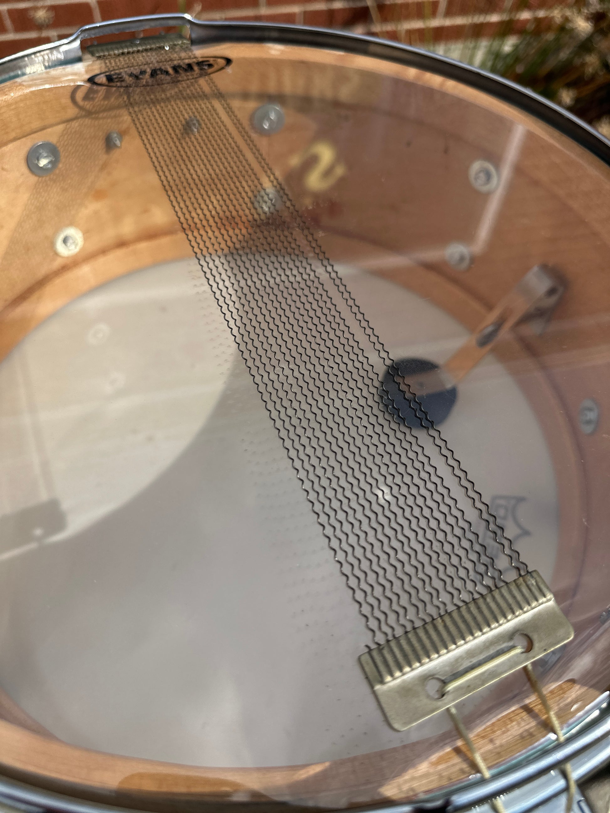 For your viewing pleasure is this vintage Slingerland 3-ply 8 lug Artist Model snare in Green Satin Flame wrap. It's in excellent condition with light signs of wear and is all original aside from the heads. The wrap is in overall great condition with some normal wear, as shown, and a tight and flat seam. The black & brass Niles badge is in great shape and securely attached. The hoops are original chrome over brass stick savers and the rods are original. The Zoomatic throw off operates smoothly, as does the muffler. There are no extra holes or modifications. There is some commonly seen wear to the inner ply on the otherwise clean maple interior, and some glue residue on the bearing edges. Most importantly, it tunes up wonderfully and is an absolute joy to play. Enjoy!