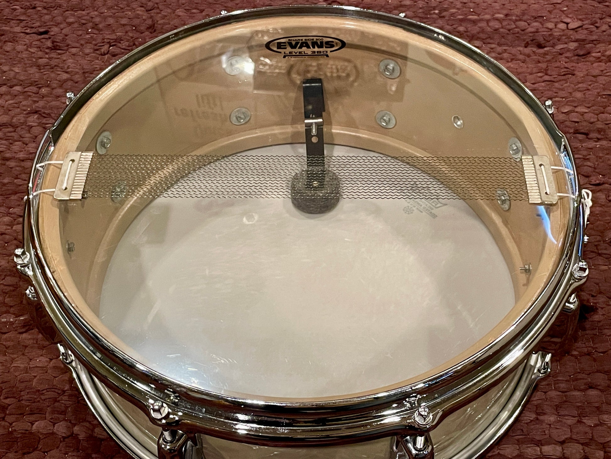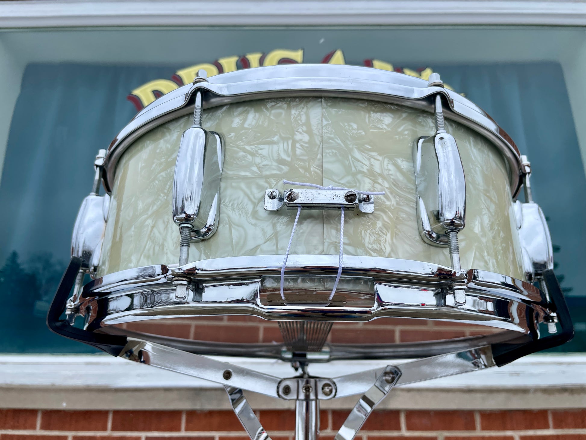 For your kind consideration is this vintage Slingerland 5.5x14 Hollywood Ace snare drum in White Marine Pearl from the 1960s. It's in excellent condition and aside from the heads is all original including the wires. The light chocolate milk interior of this 3-ply shell is very clean. The wrap is in excellent condition and the seam lays flat. The original chrome over brass stick saver hoops are in great condition with on tiny din on the outer edge of the resonant hoop that can be felt more than seen. The Rapid strainer operates smoothly with the original wires as does the original tone control. There are no extra holes or modifications. Most importantly, it tunes up with the greatest of ease and sounds fantastic. This would be a lovely addition to any collection. Enjoy.