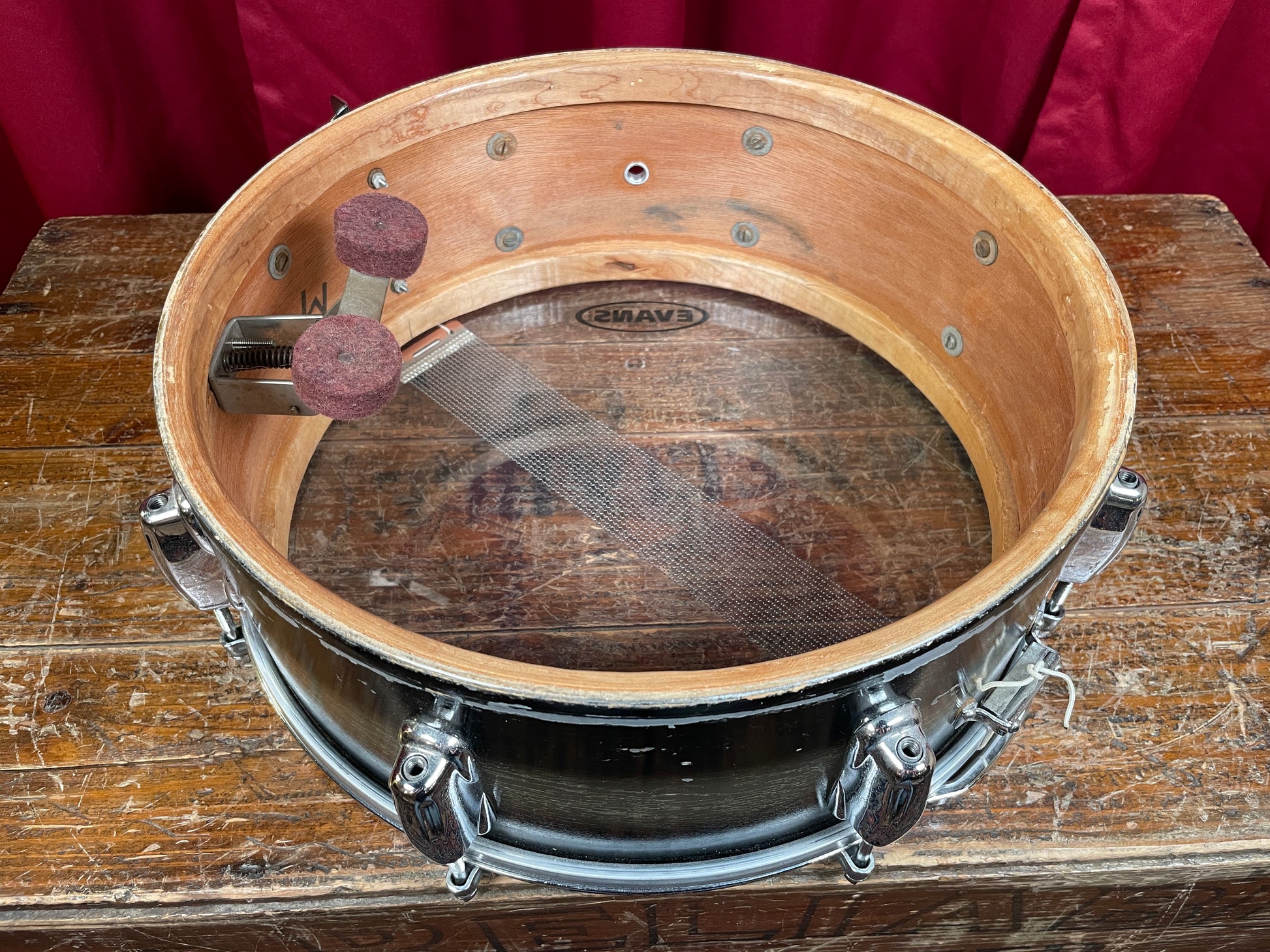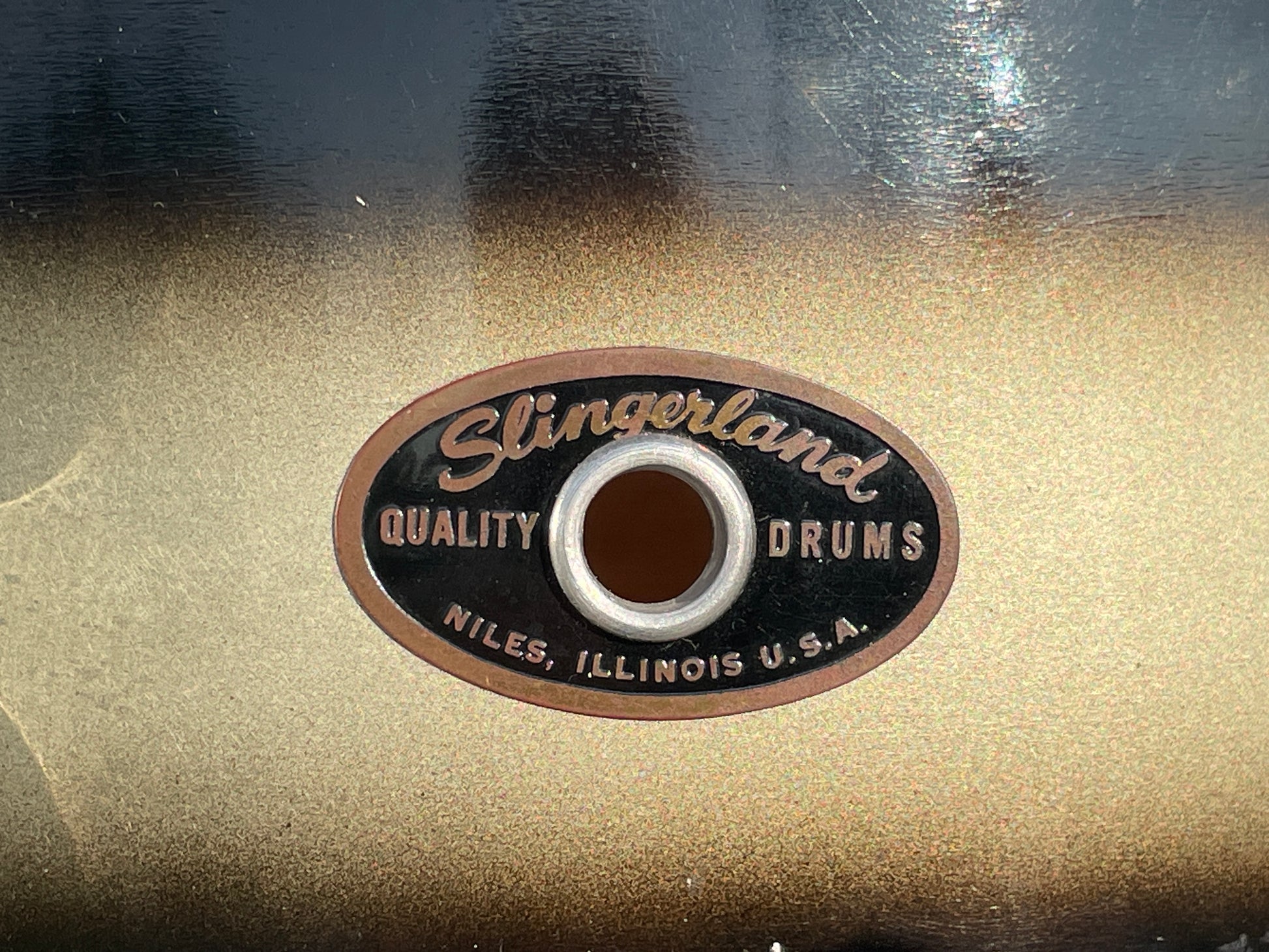 For your prime consideration is this Slingerland No. 151 Student Model 5.5x14 snare drum in stunning Black & Silver Duco finish. It has a 3-ply shell with a clean interior. The Duco finish is in very good condition with only light flaking as shown. The original hardware is all in excellent condition with very light aging. It's sporting a gorgeous pre-serial Black & Brass Niles badge and has an internal date stamp of FEB 1962. The Evans heads and Puresound wires are in great condition. There are no extra holes or modifications. It tunes up wonderfully, displays well, and would be right at home in any great snare collection. Enjoy!