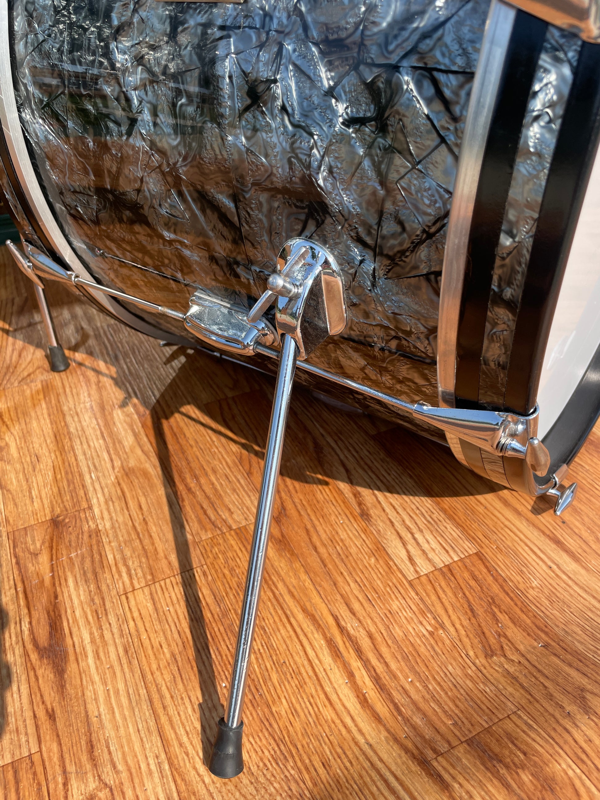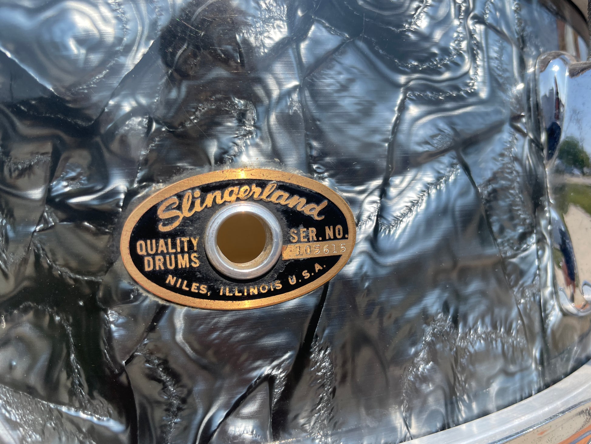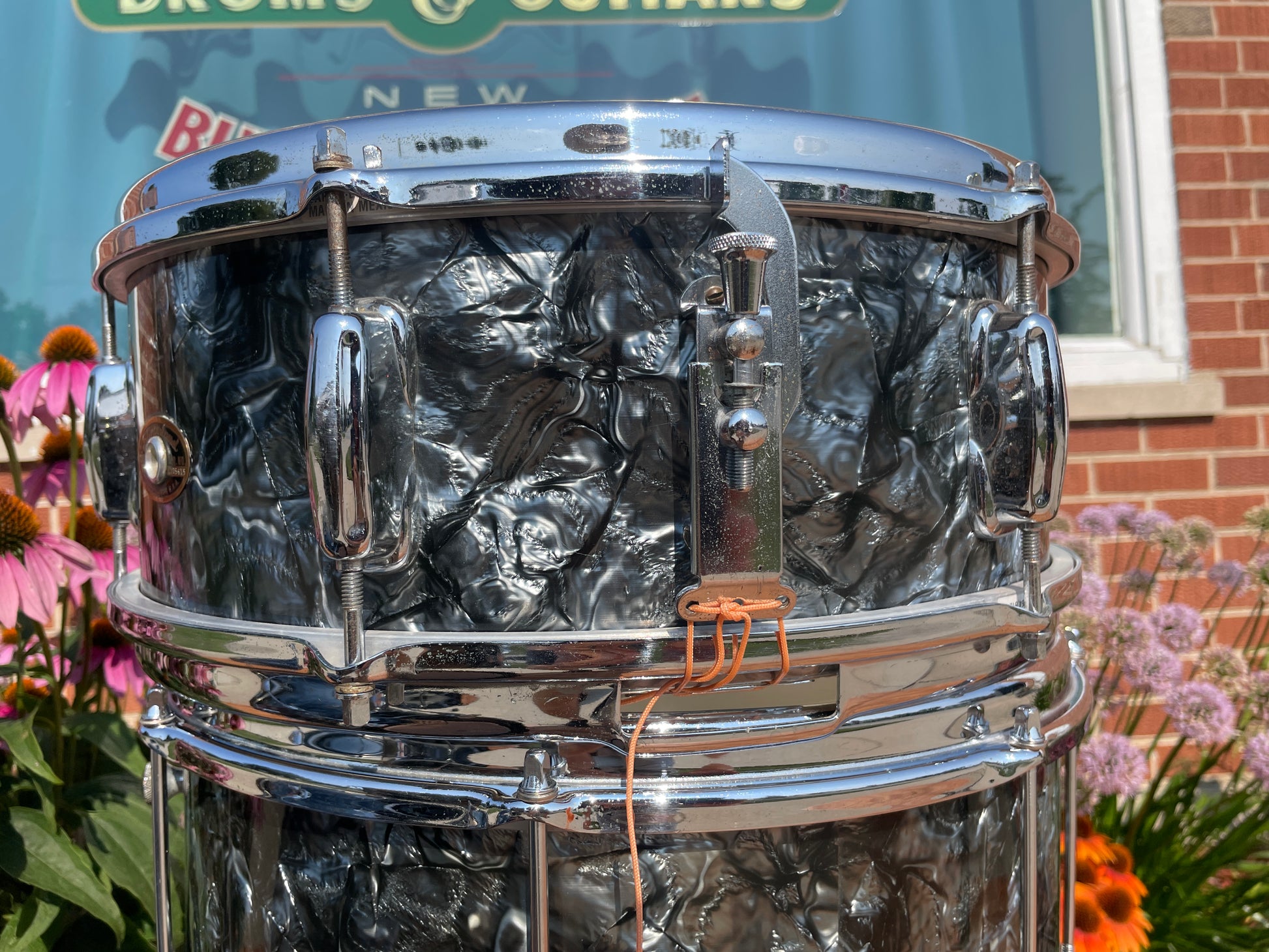 For your prime viewing pleasure is this stunning vintage Slingerland Stage Band drum set with matching 5.5x14 Deluxe Student Model snare in Black Diamond Pearl from the late '60s. The drums are all in in great condition with original chocolate milk interiors. As can be seen, this particular batch of diamond pearl wrap Slingerland had on hand when this set was originally wrapped was out of this world. Just a truly exceptional example of some of the nicest BDP pattern you'll ever see. Wrap is clean other than some tiny paint specs as shown being pointed to in pic. This 3-ply set is configured just as in the catalogs with a 13" tom and 14" floor tom with the 1288 shell mount tom holder prior to switching to the consolette rail in 1968. The snare drum is in overall great condition with just some light aging on the hoops and is all original aside from the heads and wires. The Rapid strainer and muffler operate smoothly. The hardware is in overall great condition on the set and all of the bearing edges are original. Most importantly, this set tunes up easily and sounds and looks fantastic. Enjoy!