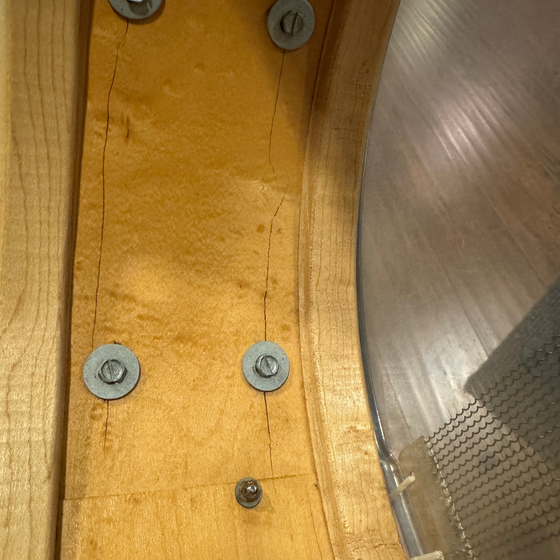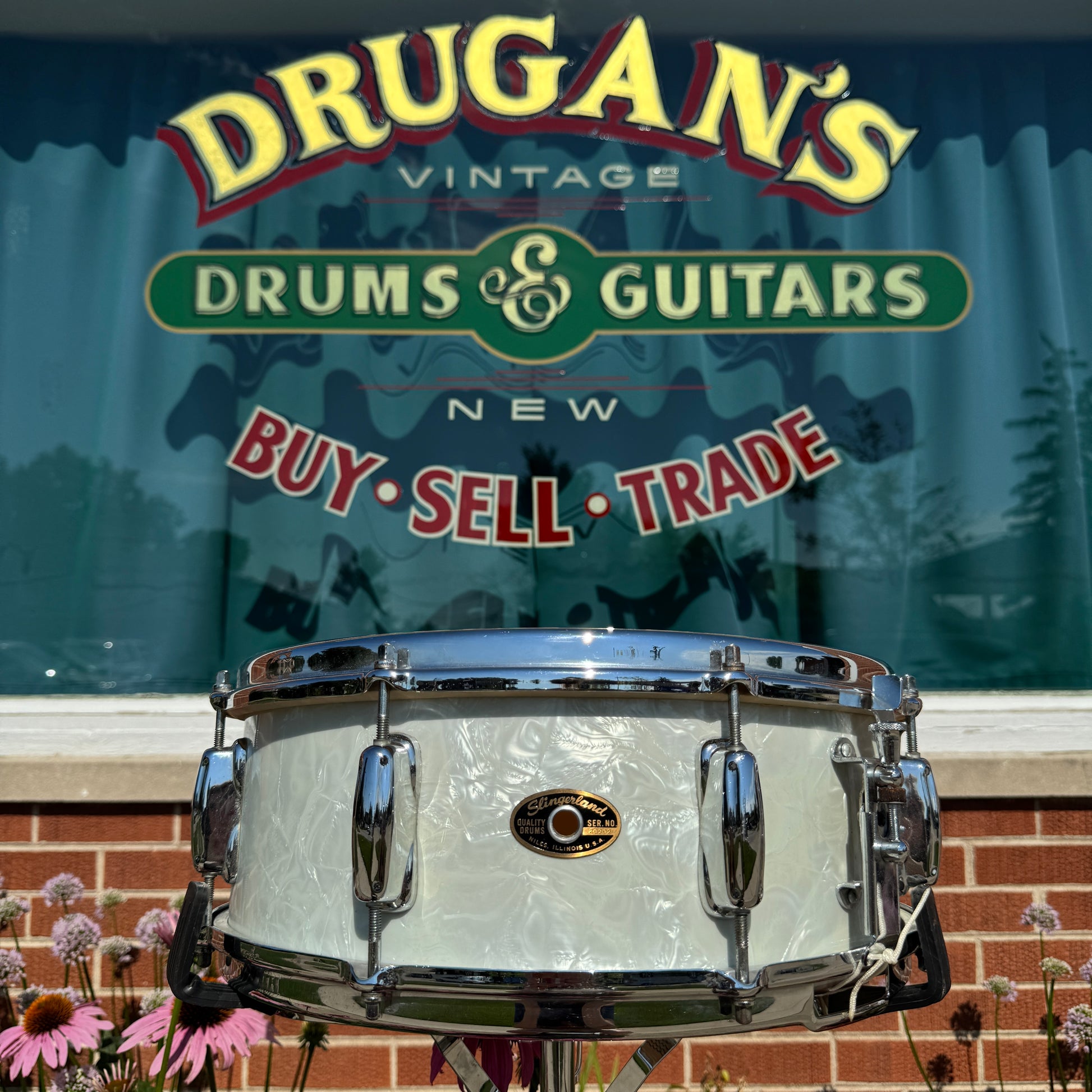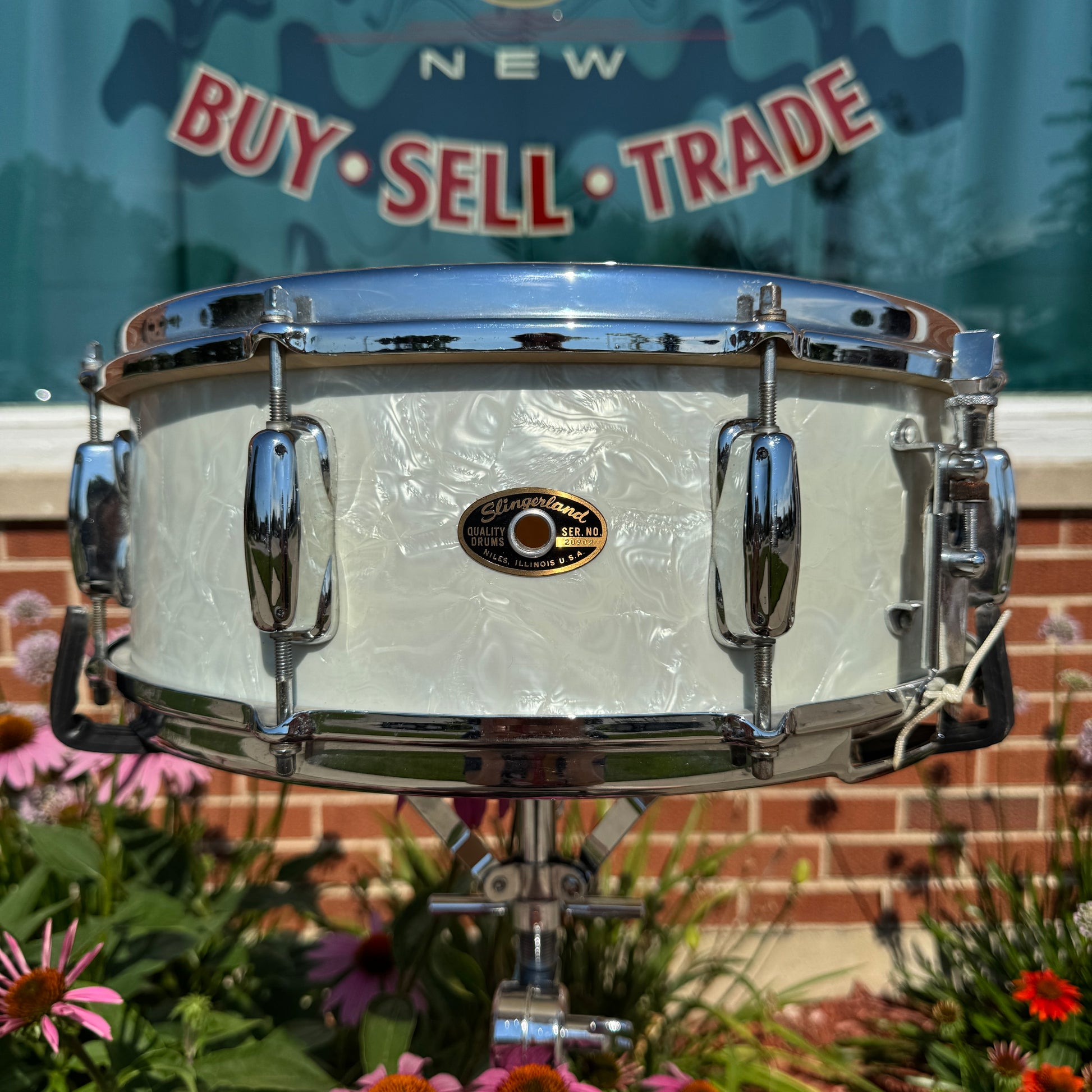 For your kind consideration is this vintage Slingerland 5.5x14 Hollywood Ace snare drum in White Marine Pearl from the 1960s. It's in excellent condition and all original down to the Slingerland calf batter head and Weather-All resonant head as cataloged. The interior of this 3-ply shell is very clean with some cosmetic separation on the inner ply as shown. It has an internal date stamp of SEP 63 and the bearing edges look great. The wrap has virtually no scratches and the seam lays flat. The original chrome over brass stick saver hoops are in great condition with a few spots of surface scratches as shown, no pitting, and great looking lugs as well. The Rapid strainer operates smoothly with the original wires. A cool and unique feature of this drum was that it was ordered from the factory without an internal tone control. There are no extra holes or modifications. Most importantly, it tunes up with the greatest of ease and sounds fantastic. This would be a great addition to any collection. Enjoy.