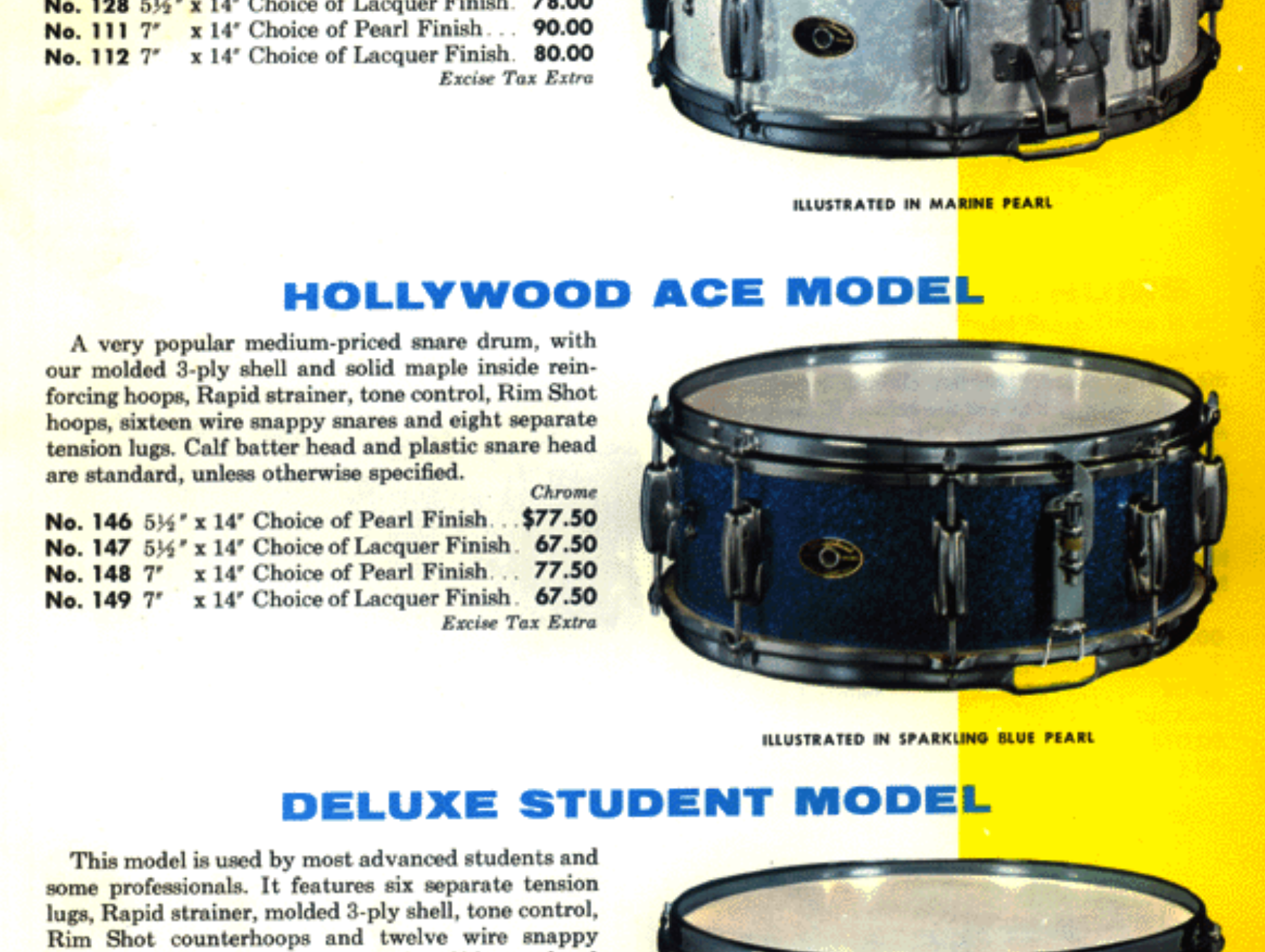 1963 Slingerland 5.5x14 No. 146 Hollywood Ace Snare Drum White Marine Pearl