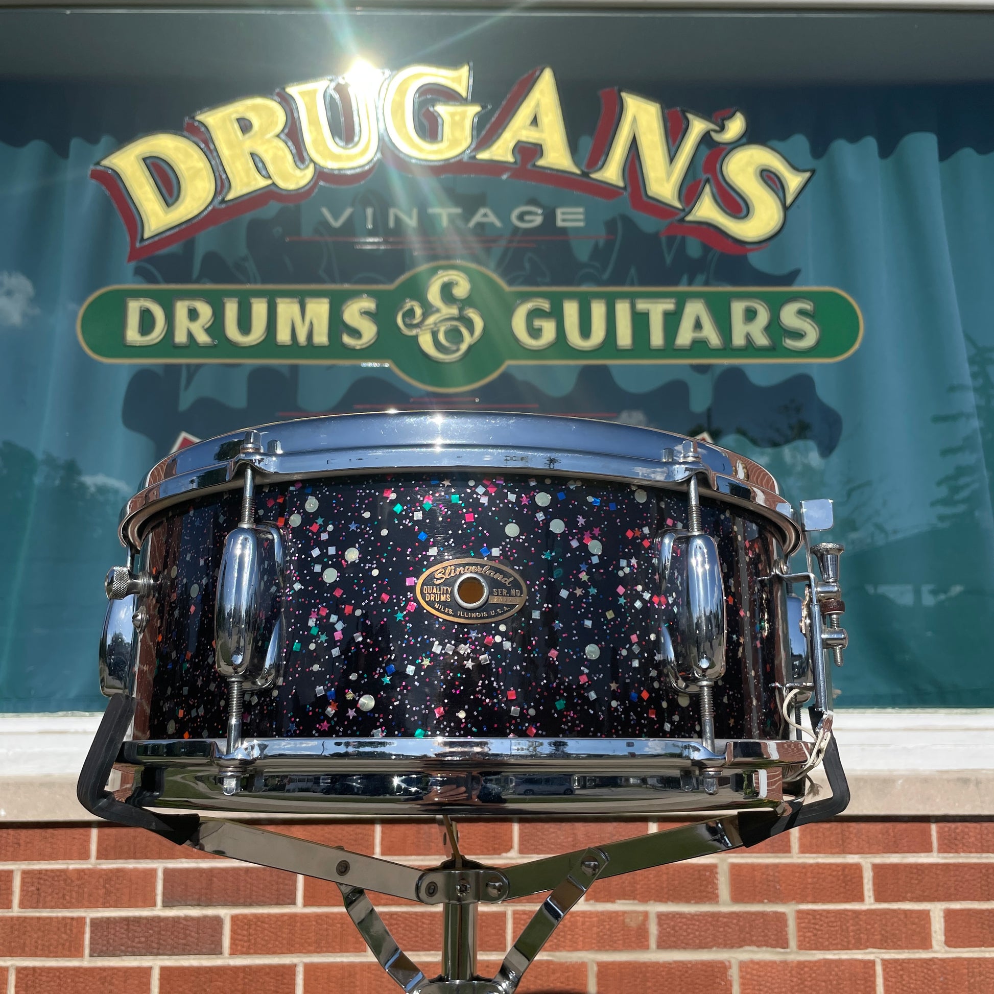 For your prime consideration is this vintage Slingerland No. 161 Deluxe Student Model 5.5x14 snare drum in gorgeous and rare Mardi Gras Pearl. It's in excellent condition overall and is all original aside from the heads and wires. This 6 lug model features a 3-ply maple shell, 673A Rapid strainer which is in great condition, chrome over brass Rim Shot triple flanged Stick Saver hoops, and a tone control. It has an internal date stamp of AUG 63. There is some superficial splitting of the interior ply as shown in the photos that is merely cosmetic in nature, does not affect the structural integrity of the drum in any way, and was most likely there since it was shipped from the factory. Most importantly it tunes up well and sounds wonderful. An awesome '60s snare that would be equally at home in any great Slingerland collection, on stage, or in the studio. Enjoy!
