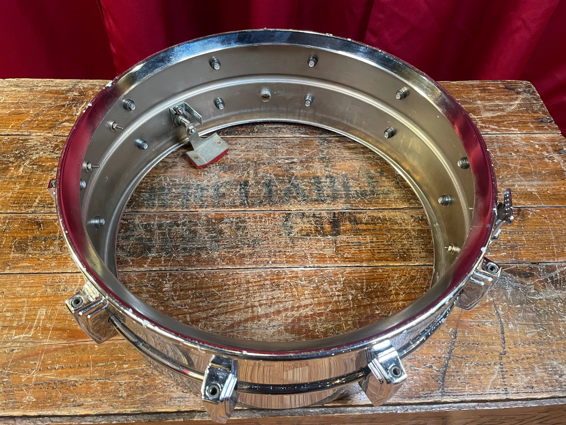 For your kind consideration is this Ludwig Supraphonic from 1964. This drum is in good condition with some pitting and chrome loss on the shell. Aside from the heads and wires, this drum is all original including both coveted chrome over brass hoops, red felt baseball bat muffler, and tension rods. There are no extra holes or modifications of any kind. The Keystone badge is nice and tight with 5 digit serial #20XXX. It tunes up with the greatest of ease and sounds absolutely incredible. This snare would equally be at home amongst the finest of studios, or stages. Enjoy!