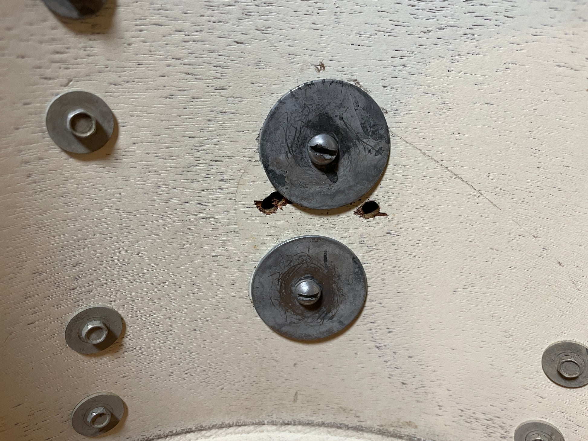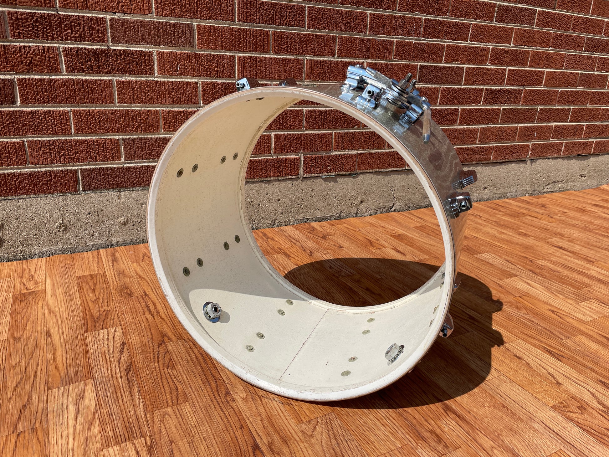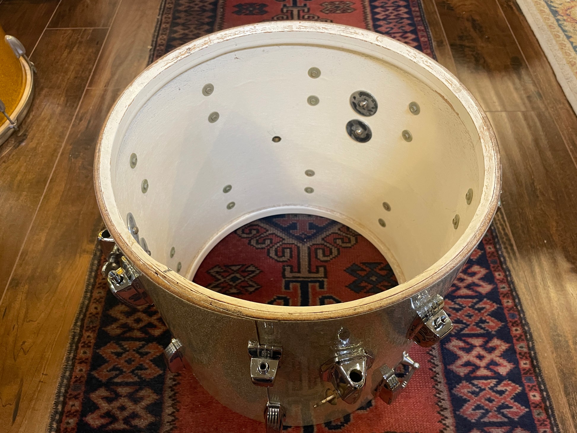 For your extreme viewing pleasure is this rare Ludwig Jazzette set in stunning silver sparkle. The wrap has strong color and is nice and tight. Of particular note is that the original rail mount is in the cool off-center position, unlike nearly every 12x18 Jazzette bass drum every made, which nearly all of them have the rail positioned in the center. The bass drum keystone badge is nice and tight with serial # 115XXX, and is from 1966. Both the 12" tom and 14" tom have serial #'s 94XX dating from 1964. The 12" tom has extra holes from a previous mount, which are covered up on the outside by the mount (see pics). The floor tom seam has a slight lift which would be an easy fix. This superb little beauty would be a great addition to your collection. Most importantly it tunes up like a champ and sounds incredible. Enjoy!