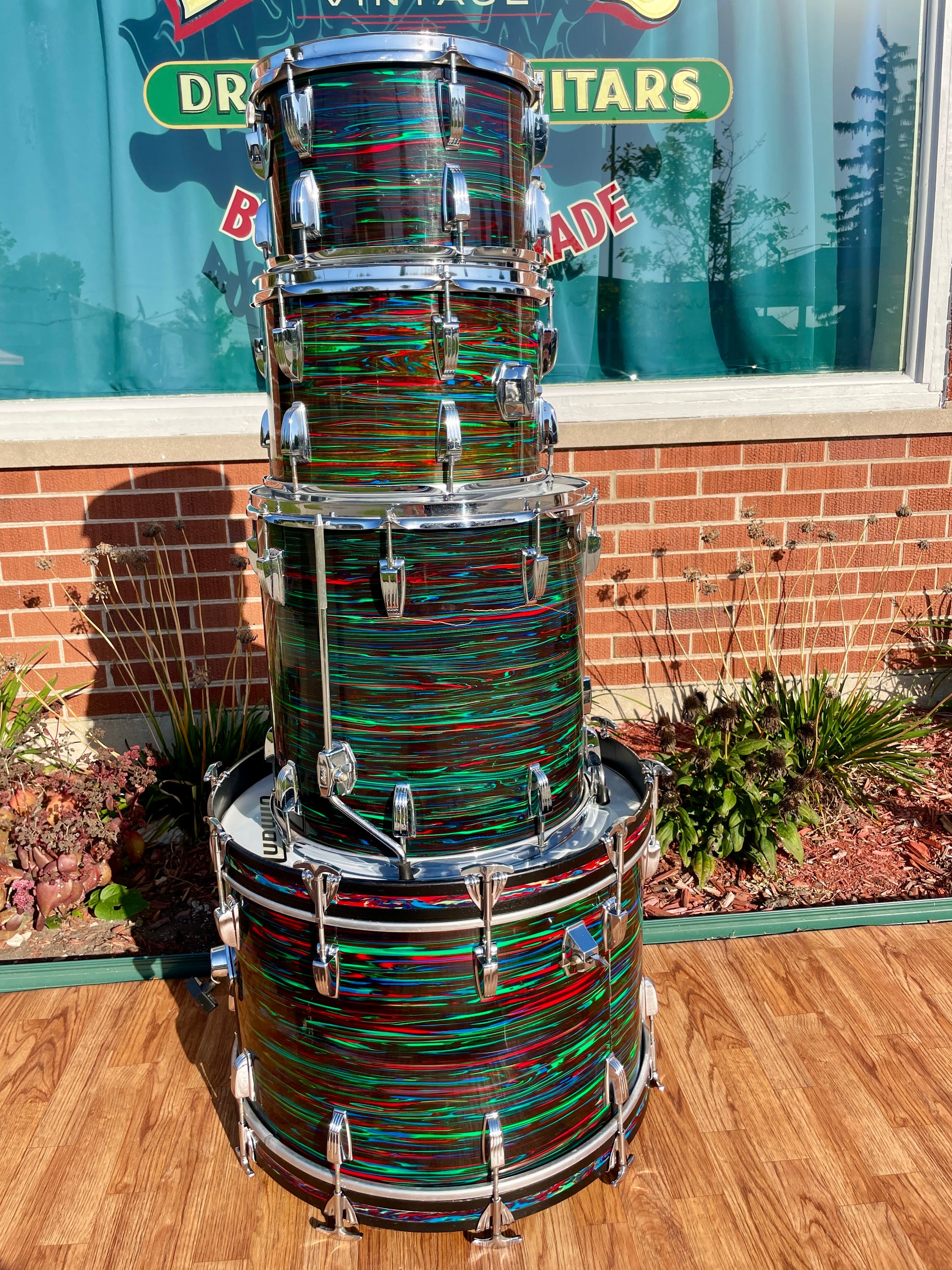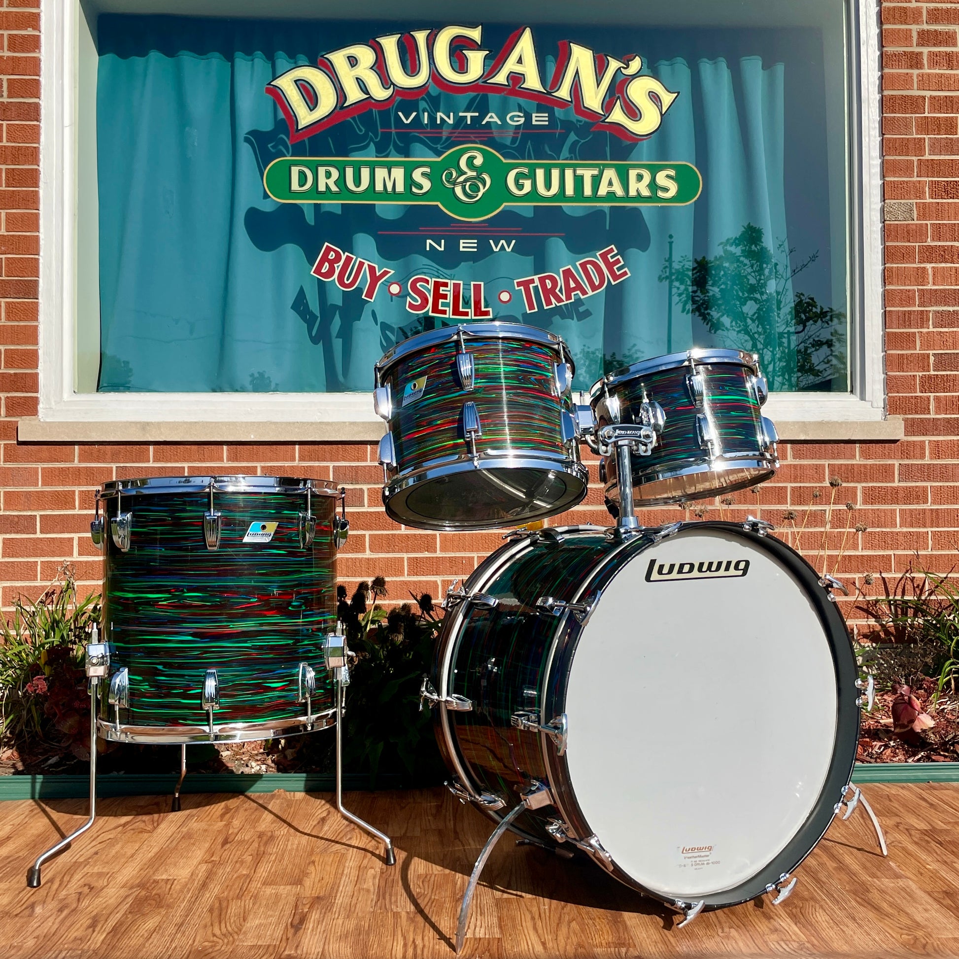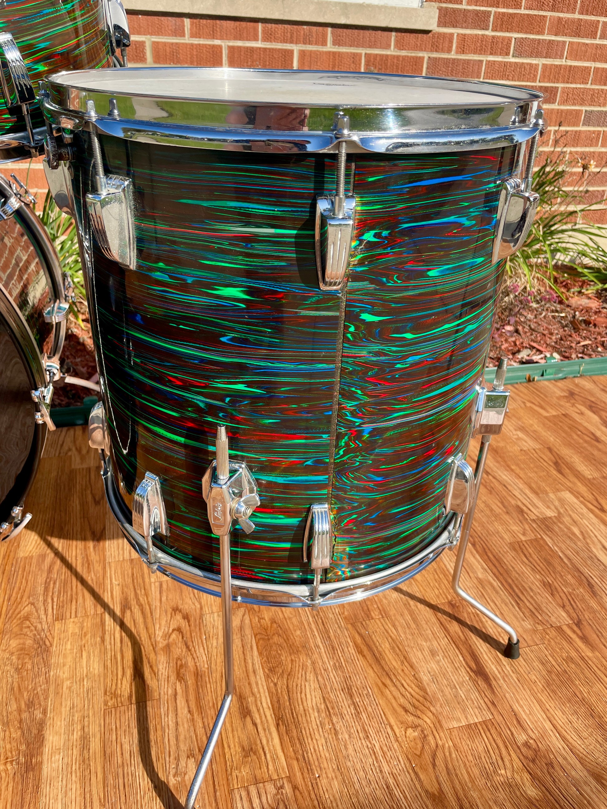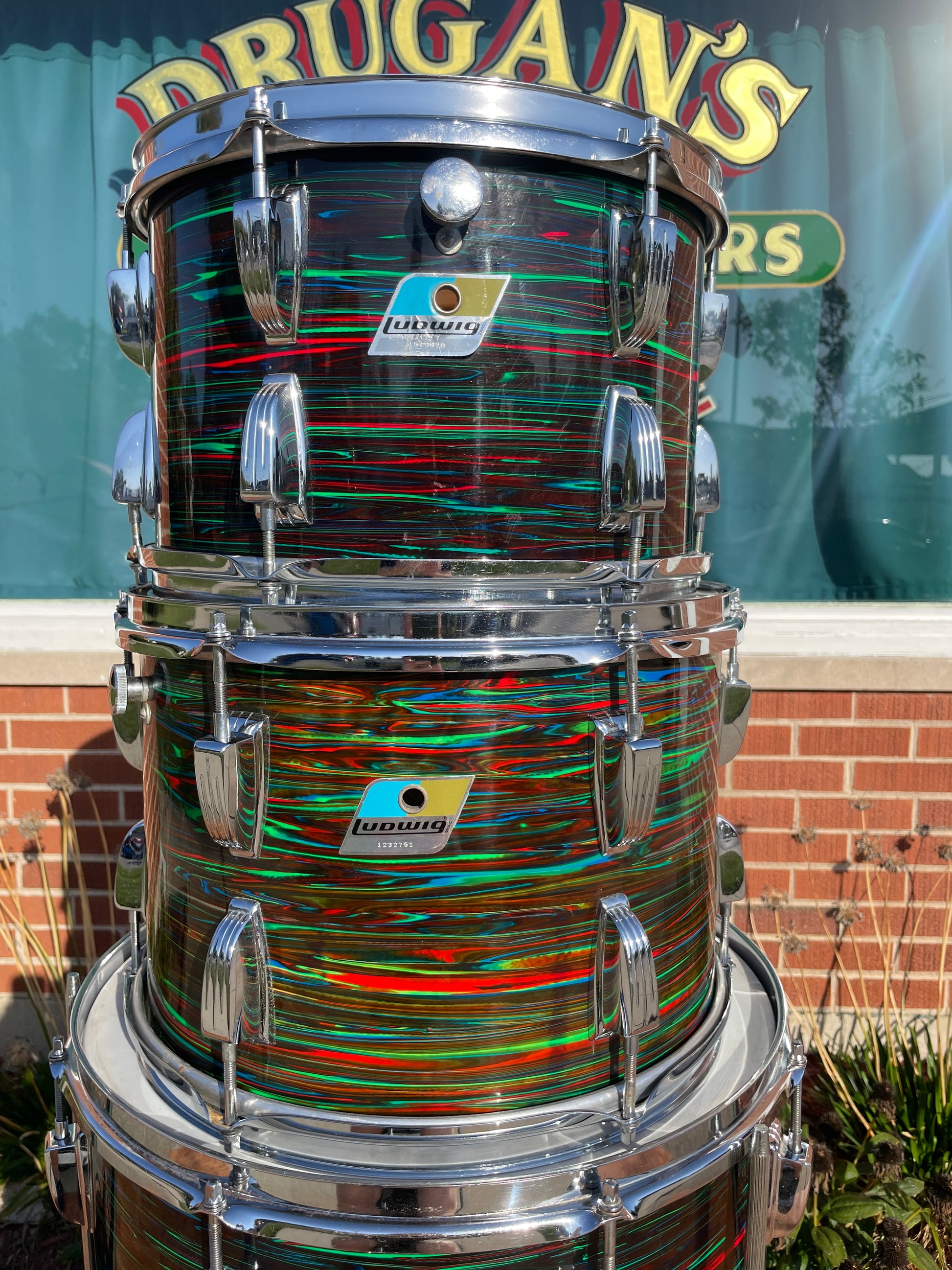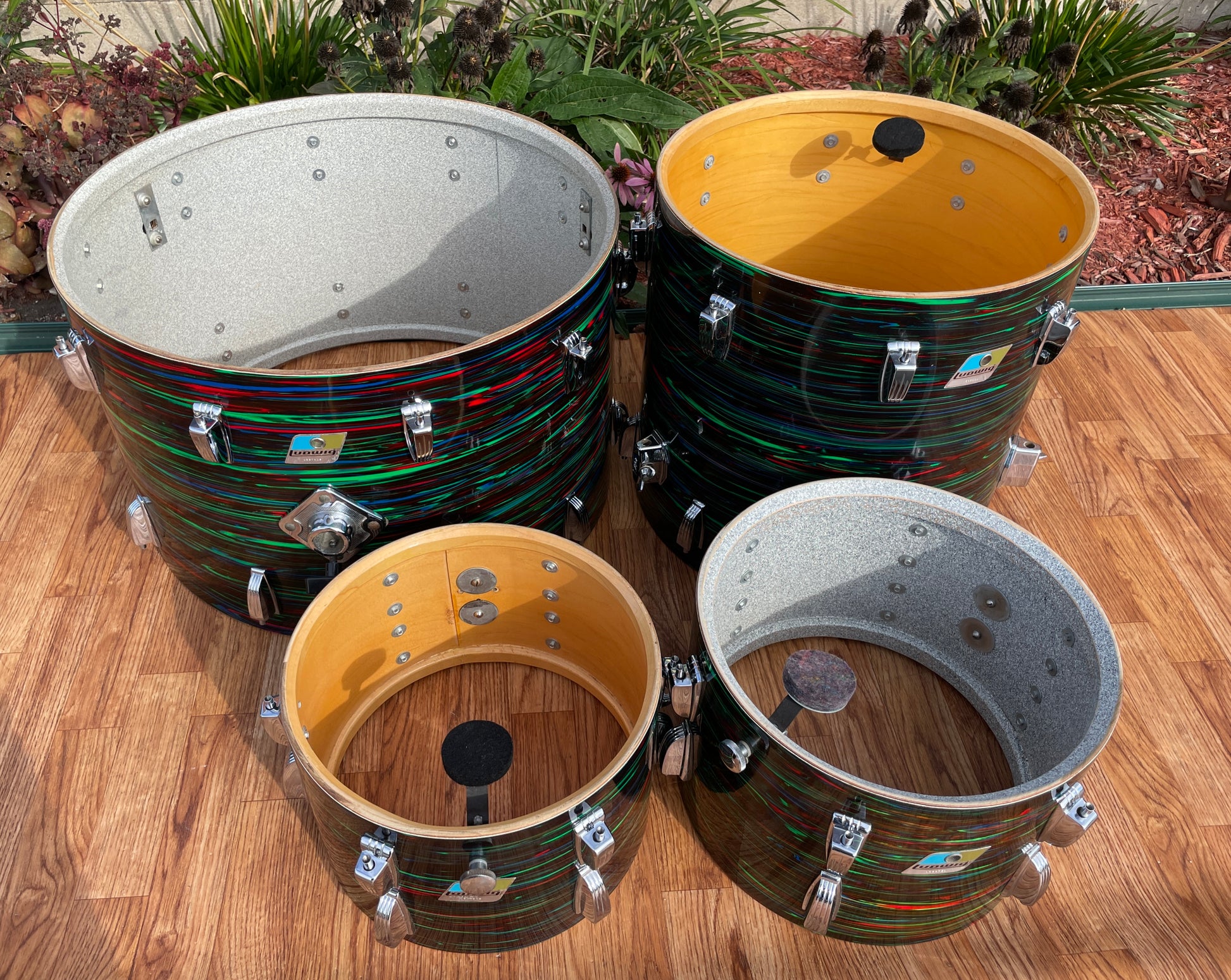 For your prime viewing pleasure is this vintage Ludwig Big Beat outfit in Psychedelic Red from the '70s. This is the very cool and rarely seen second (darker) version of Psychedelic Red, and the greens show vibrantly. This 3-ply drum set has mixed clear maple and Granitone interiors and is in great condition with just a few issues with the wrap as shown in pics. There is a split in the wrap on the 16" floor tom as shown, the seam has separated but lays flat, and the bottom side head fits snug but tunes up good. The 12" tom has extra holes where a clip mount was installed at one time which are covered by the existing mount and some numbers etched into the badge. There are no other extra holes or modifications of any kind. The edges are true and original. Aside from the heads, it's all original down to the hoops, tension rods, lugs, and double tom mount. Most importantly, it tunes up with the greatest of ease and sounds fantastic and bombastic and is ready to take the stage. Enjoy!