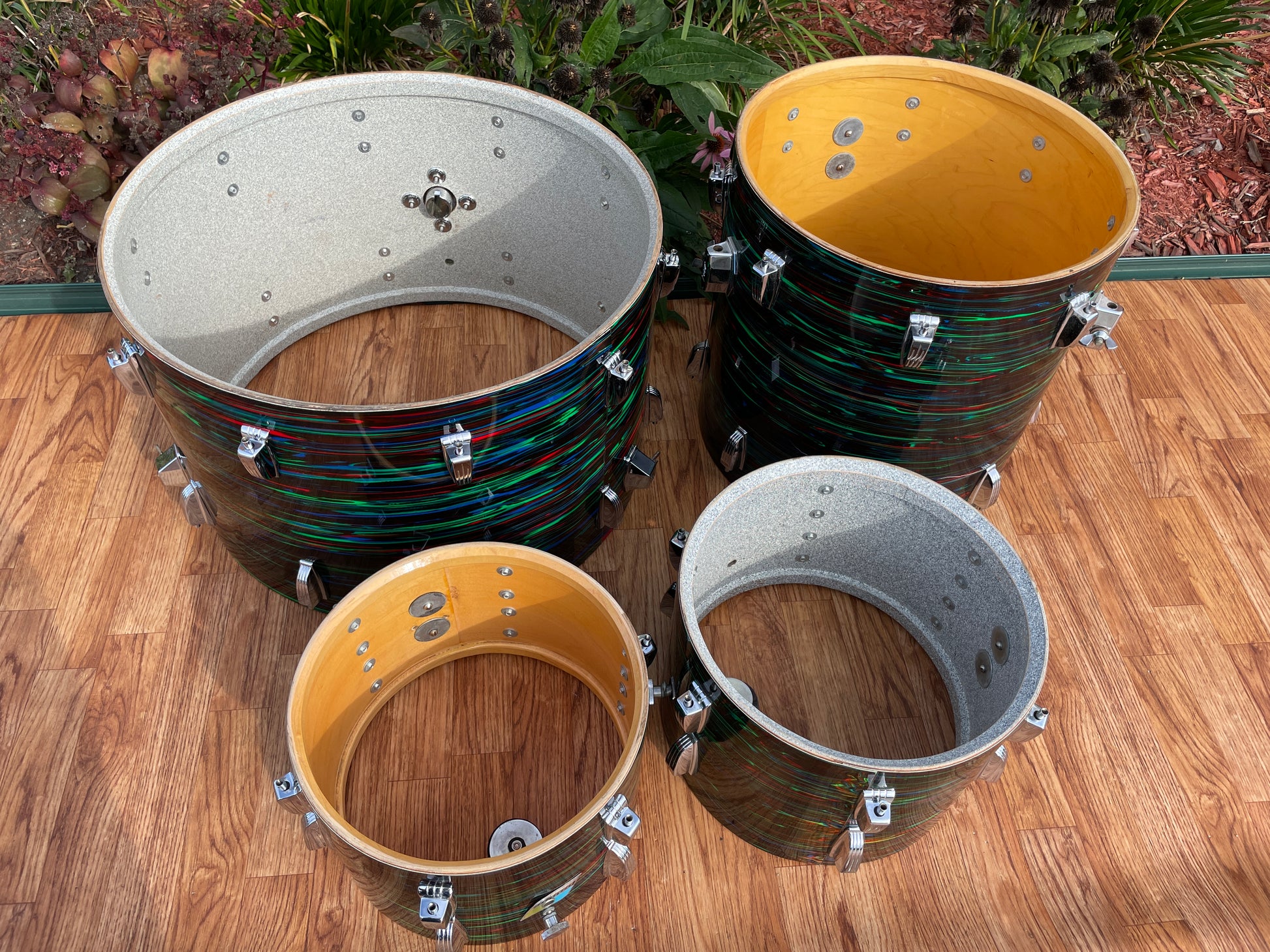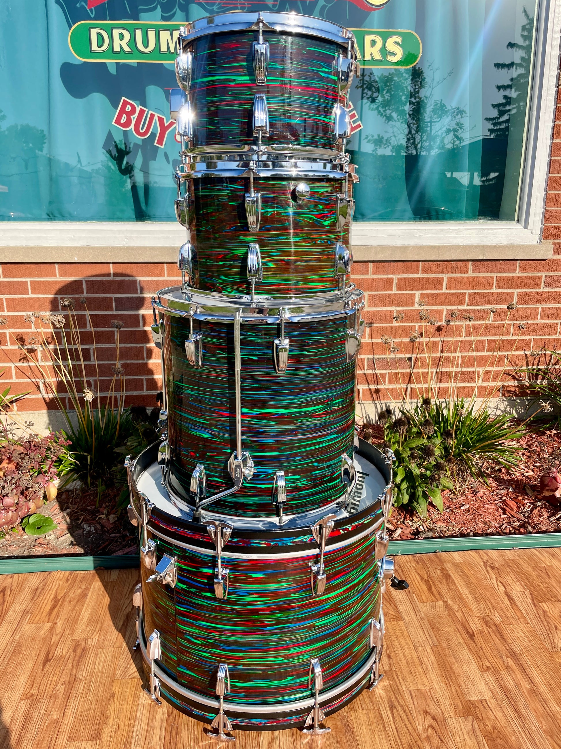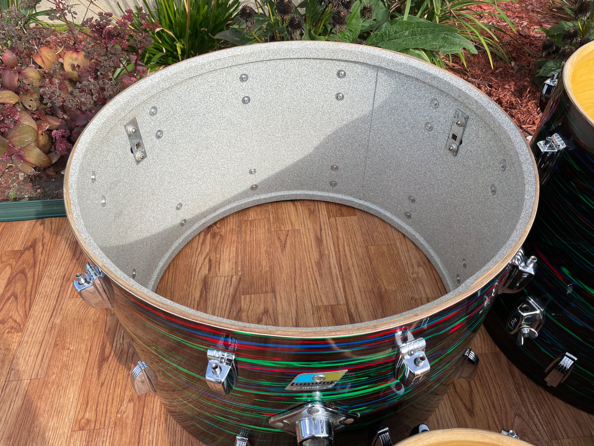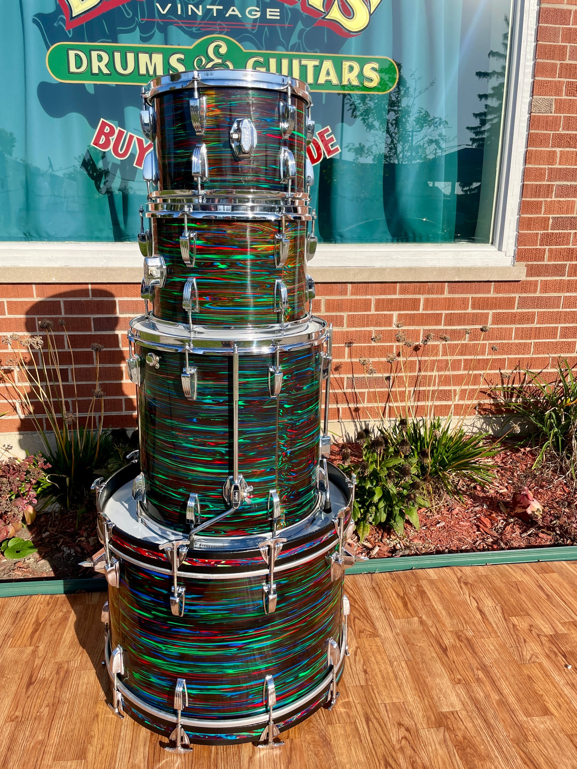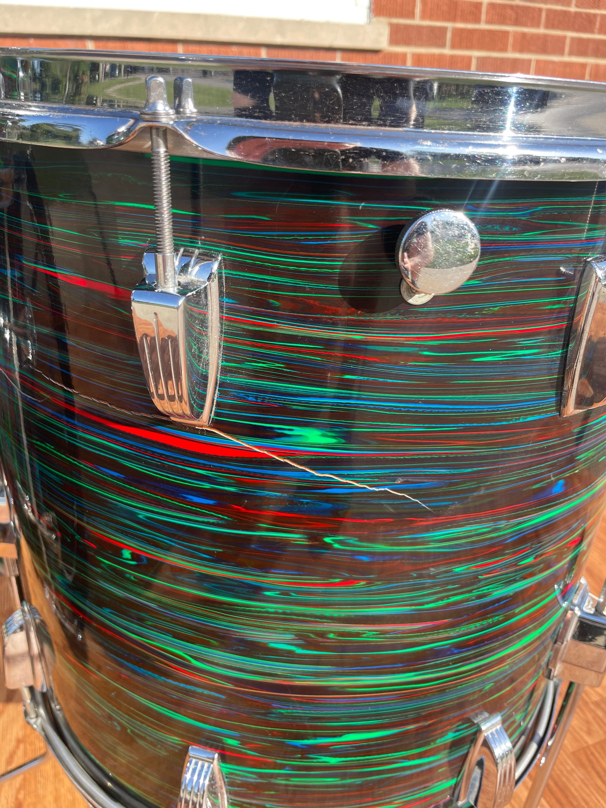 For your prime viewing pleasure is this vintage Ludwig Big Beat outfit in Psychedelic Red from the '70s. This is the very cool and rarely seen second (darker) version of Psychedelic Red, and the greens show vibrantly. This 3-ply drum set has mixed clear maple and Granitone interiors and is in great condition with just a few issues with the wrap as shown in pics. There is a split in the wrap on the 16" floor tom as shown, the seam has separated but lays flat, and the bottom side head fits snug but tunes up good. The 12" tom has extra holes where a clip mount was installed at one time which are covered by the existing mount and some numbers etched into the badge. There are no other extra holes or modifications of any kind. The edges are true and original. Aside from the heads, it's all original down to the hoops, tension rods, lugs, and double tom mount. Most importantly, it tunes up with the greatest of ease and sounds fantastic and bombastic and is ready to take the stage. Enjoy!