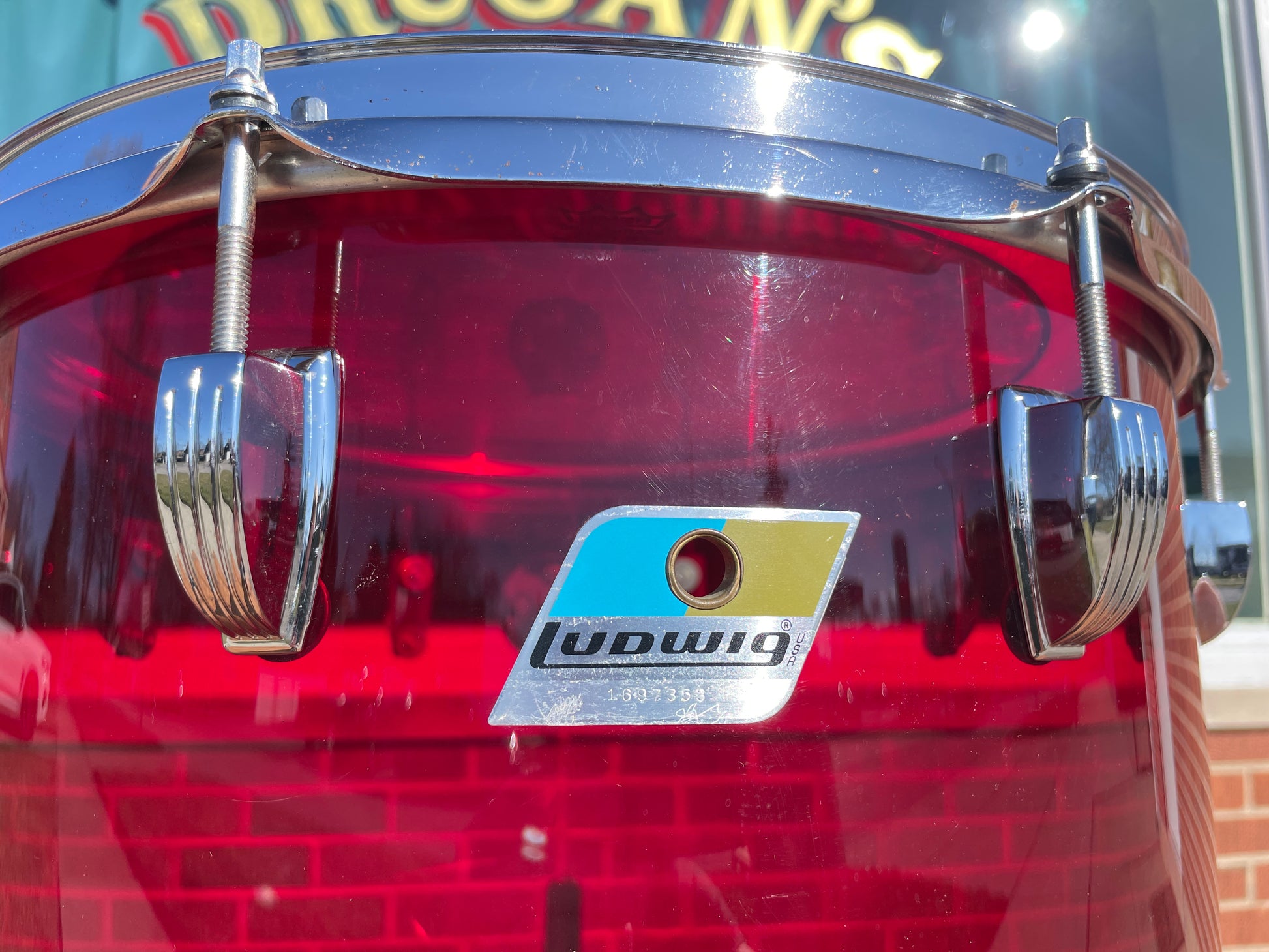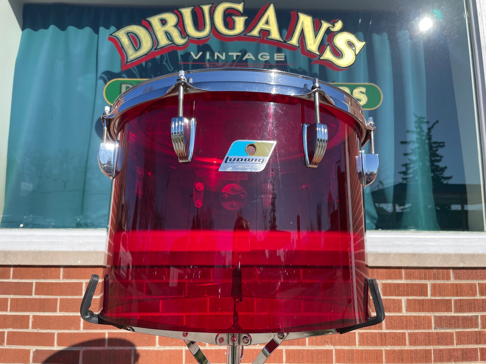 For your kind consideration is this vintage 10" deep x 14" diameter Ludwig Red Vistalite concert tom from the 1970s. This thunderous tom is looking to be paired up with your favorite drums. It's in in great condition and displays beautifully with just a bit of rash as shown in pics. Has original clip style mount. Pointy Blue/Olive badge with serial # 1697XXX. Most importantly, it tunes up with the greatest of ease and sounds fantastic. Enjoy!
