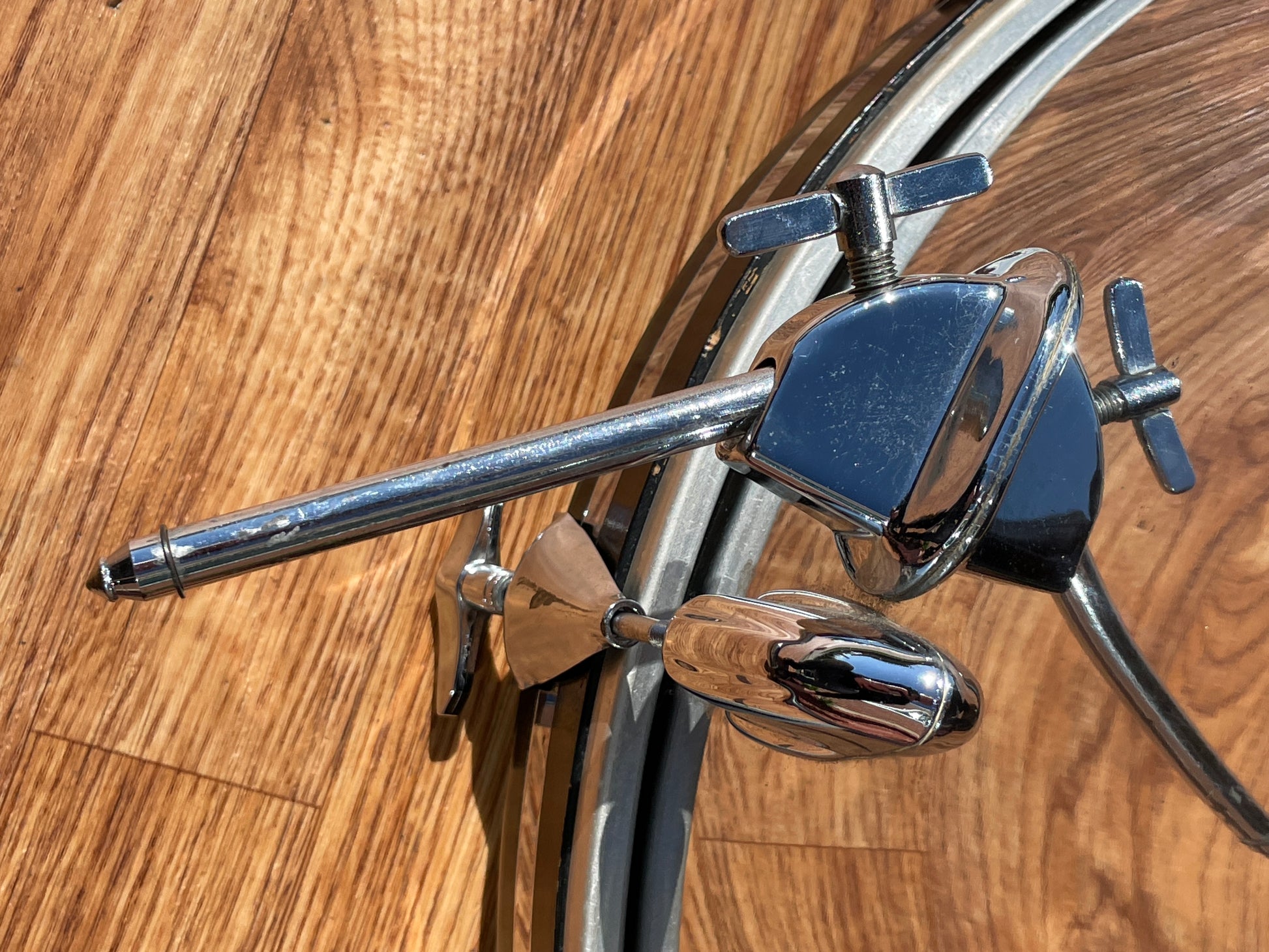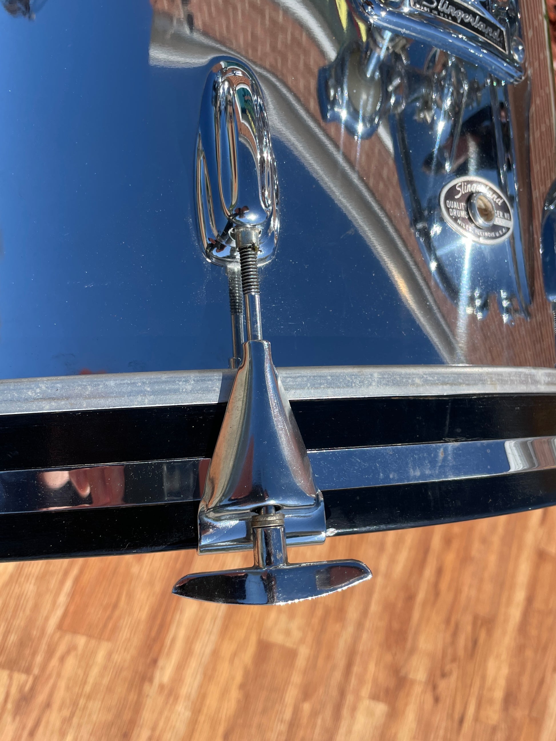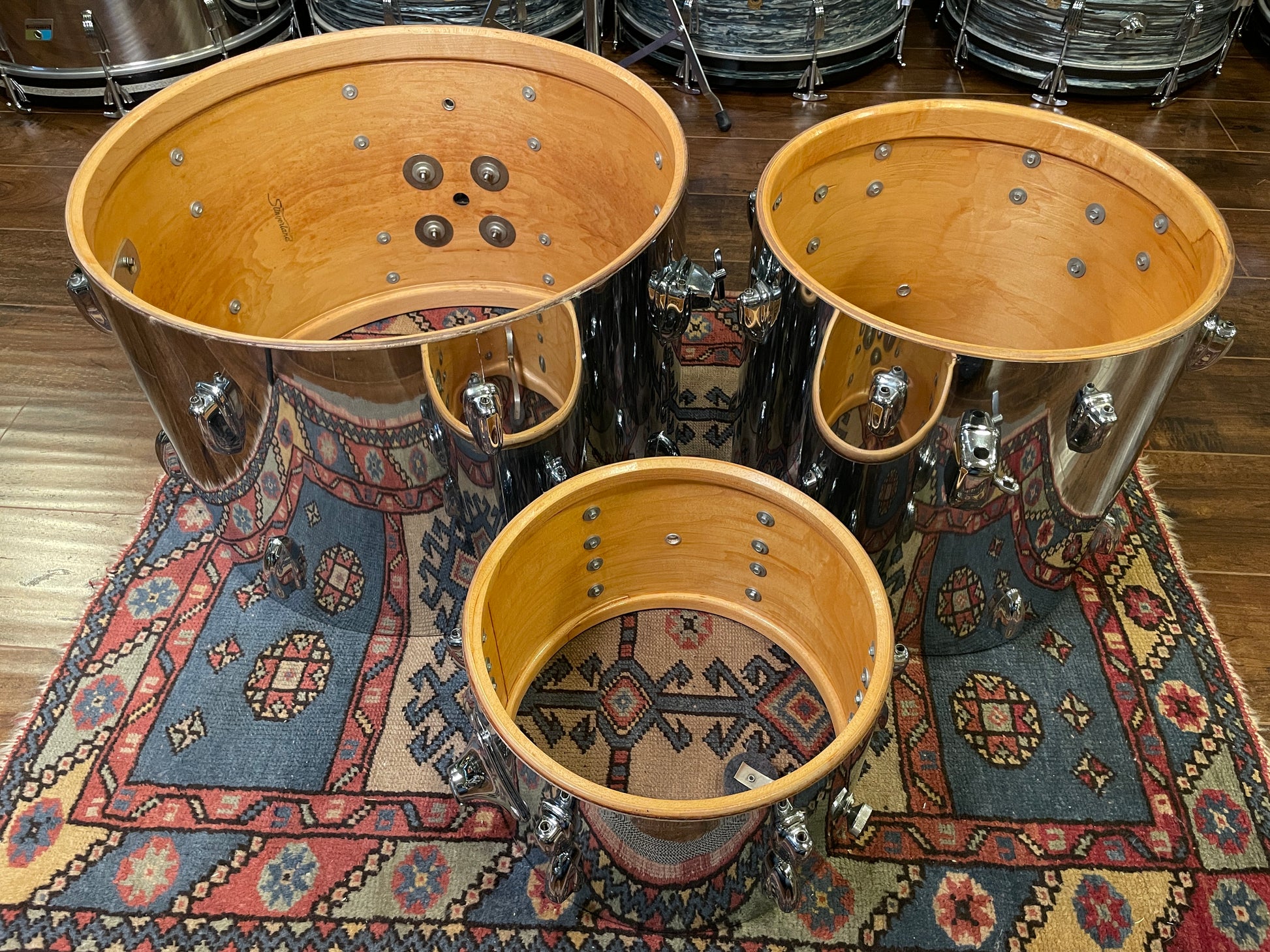 For your prime viewing pleasure is this very cool and seldom seen 1970s Slingerland No. 9N Modern Jazz Outfit in Chrome Over Wood. The Modern Jazz Outfit is comprised of a 14"x20" bass, 8"X12" tom, and 14"x14" floor tom, all with beautiful 3 ply clear maple interior shells. This set is all original with exception of heads which are modern. There are no extra holes or modifications of any kind. This set has a bit of rash on the 12" tom as shown in the last photo, some random scratches, dings, and some polishing swirls, but overall it presents nicely. Most importantly, it tunes up easily and sounds fantastic! It also looks amazing under stage lights and would be great for a jazz or rock band, both on the stage and in the studio. Enjoy!
