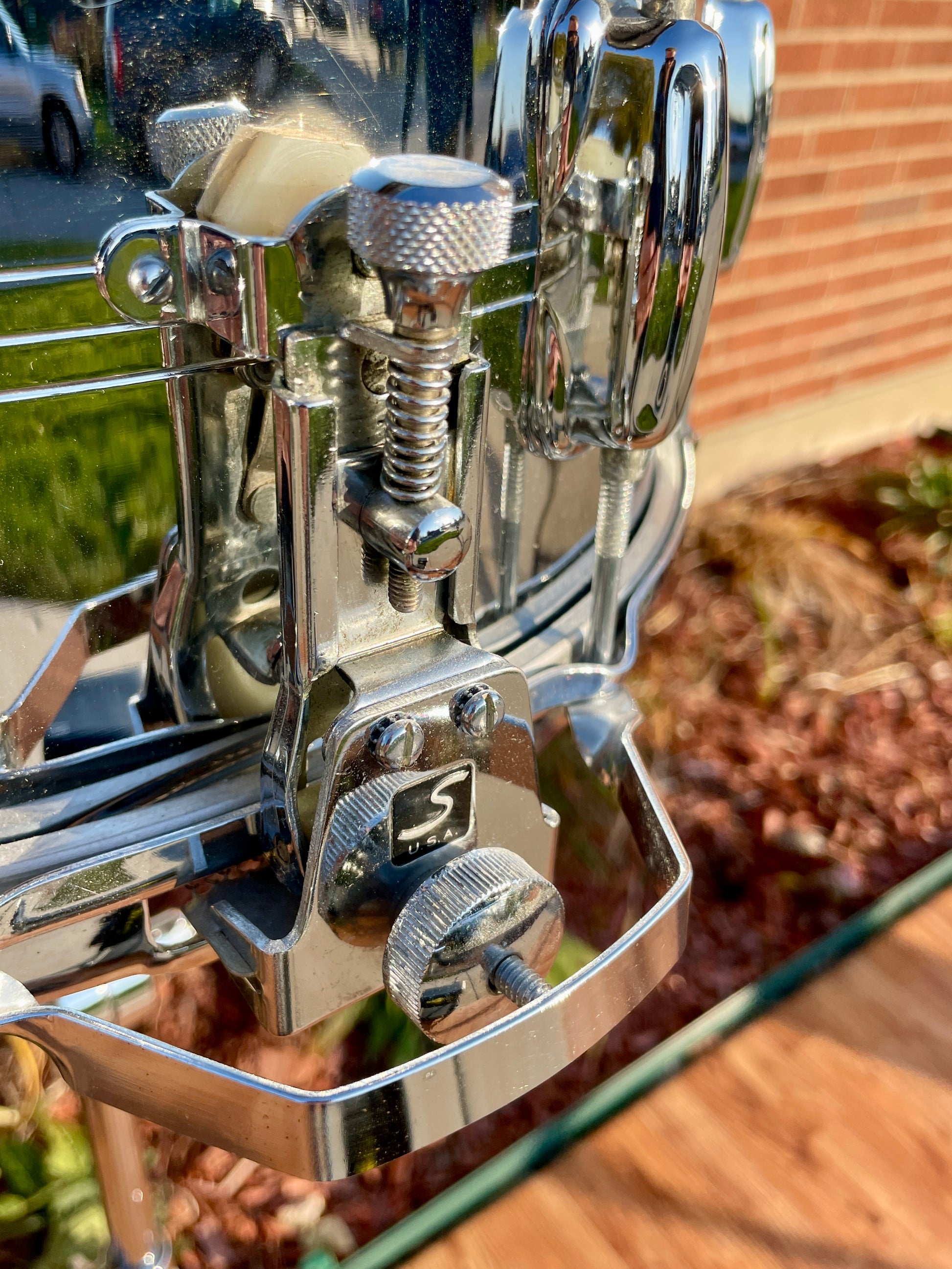 For your viewing pleasure is this vintage Slingerland 6.5x14 Super Sound King snare drum from the '70s. These drums get our vote for being the most underrated power house vintage snare drums on the planet. The amazing heavy chrome over brass shells have a wonderfully warm yet commanding sonic signature. The chrome on this drum is in fantastic condition with only a few light surface scratches and no pitting. The Dual Super Snare Strainer functions well and looks great, it is missing the guard on butt side side. This 10-lug drum is 100% original aside from the heads. The original tone control looks great and is fully functional. The oval Black & Silver Niles badge with serial number 80149 is nice and tight, and dates this between 1970 to 1972. There are no extra holes or modifications. Most importantly, this drum tunes up perfectly and sounds fantastic. It would be equally at home amongst the finest of collections, studios, or stages. Enjoy!