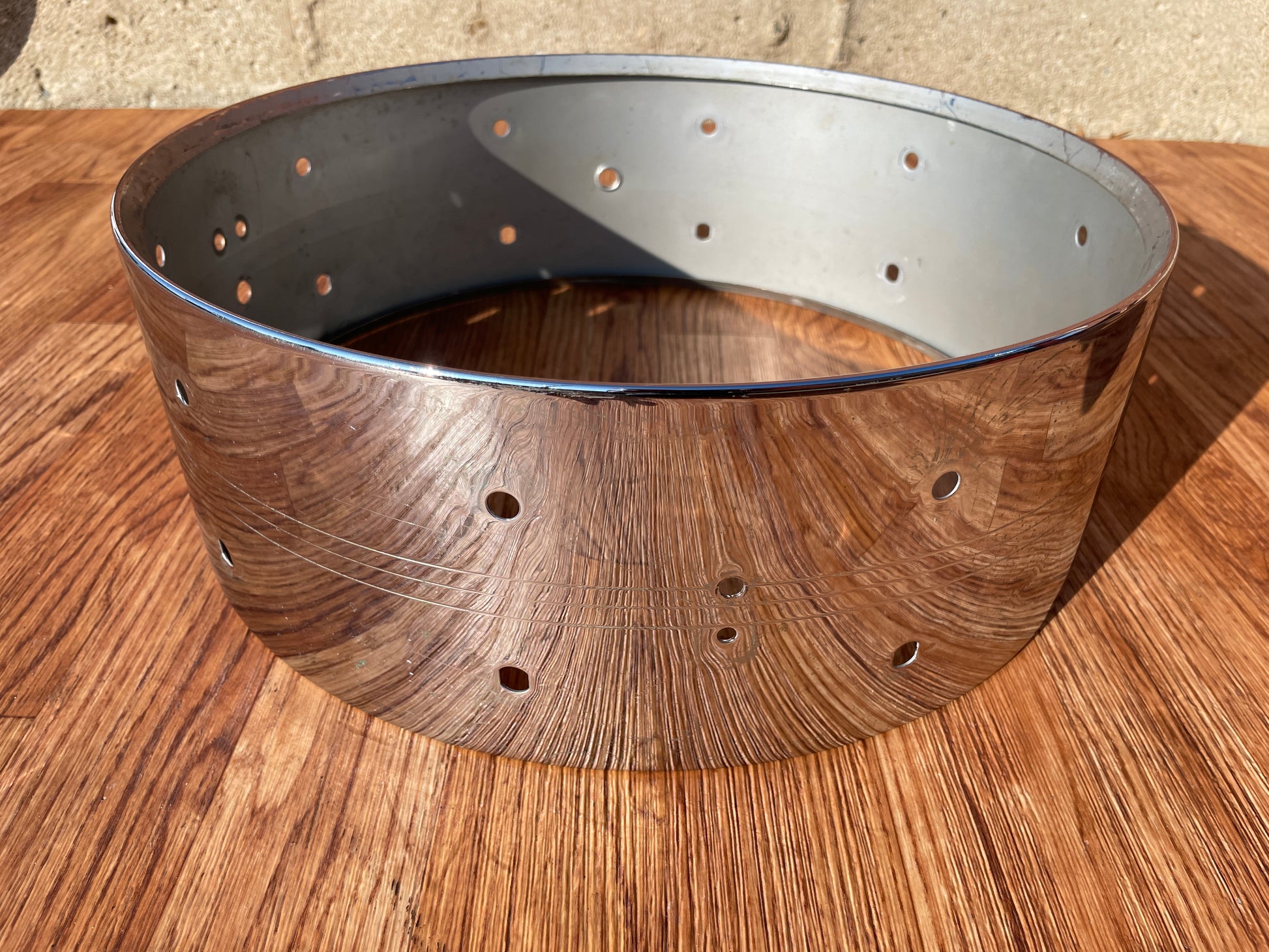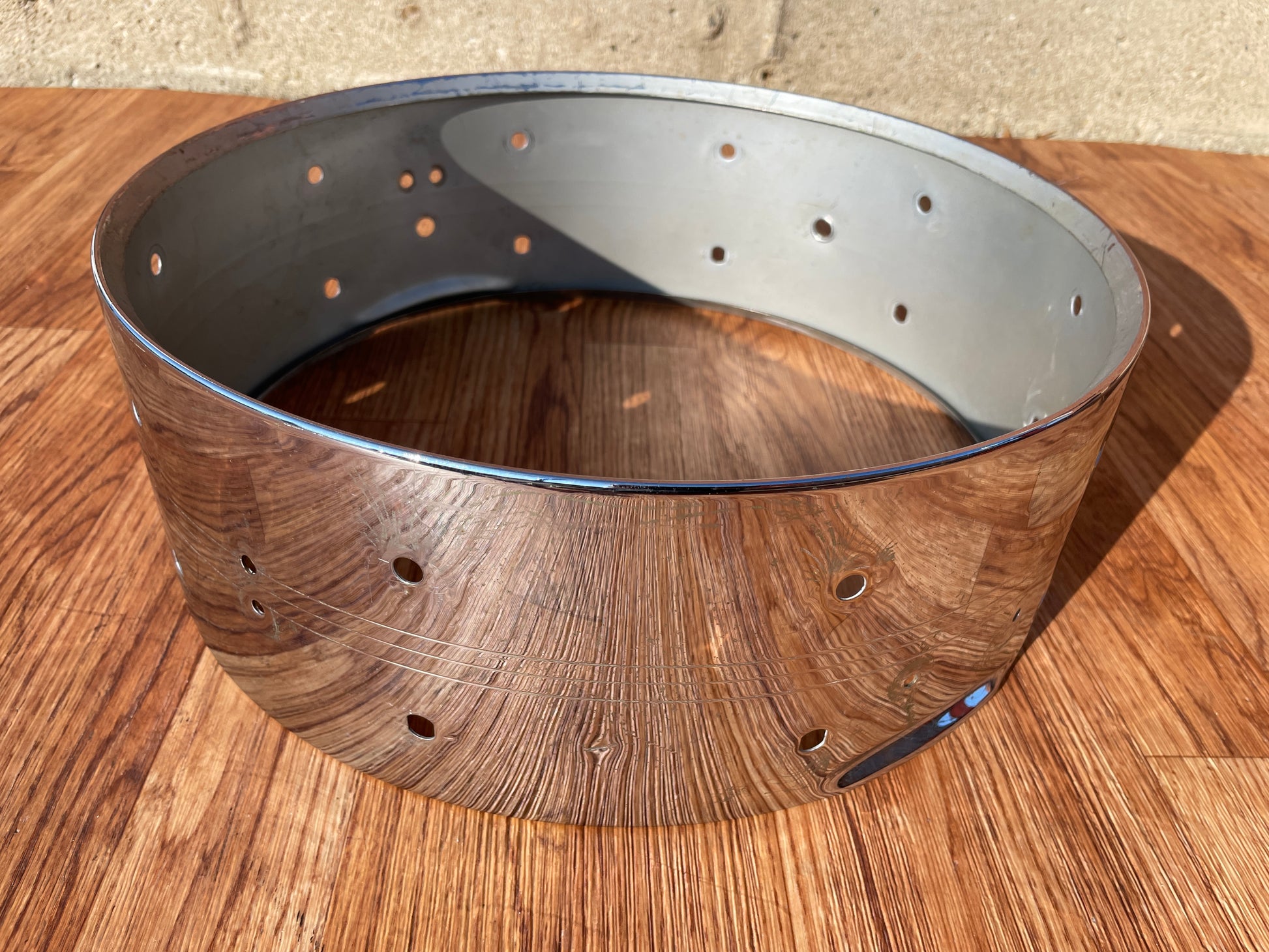 For your kind consideration is this vintage Slingerland Gene Krupa Sound King 5x14 snare drum shell. This chrome over brass shell is the No. 132 model that is 5x14 with 10 lugs. It's in good condition with light scratches and a couple area of pitting in the chrome. It produces a clear ringing tone when tapped and is ready to have you add hardware and heads and get it back in action. Enjoy!