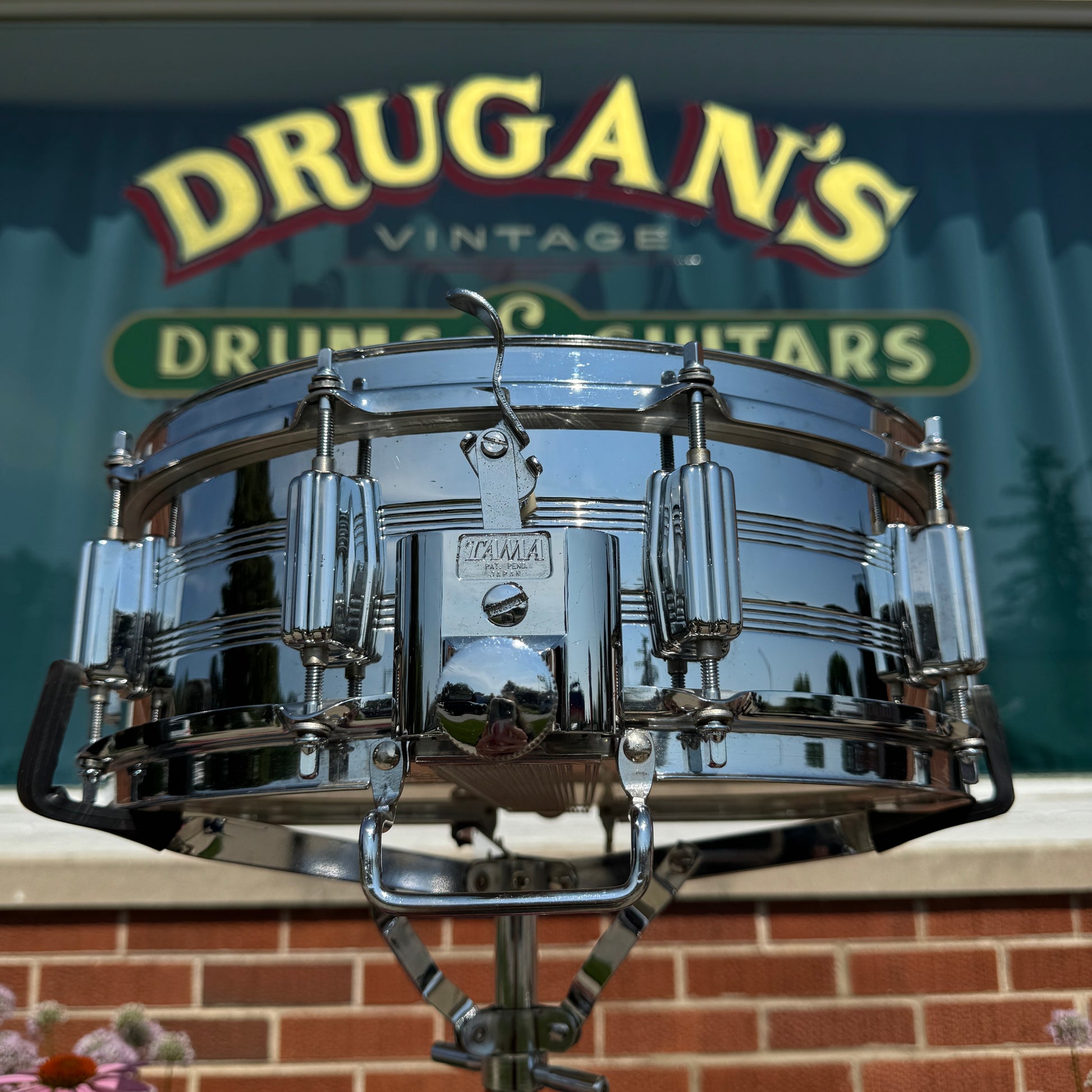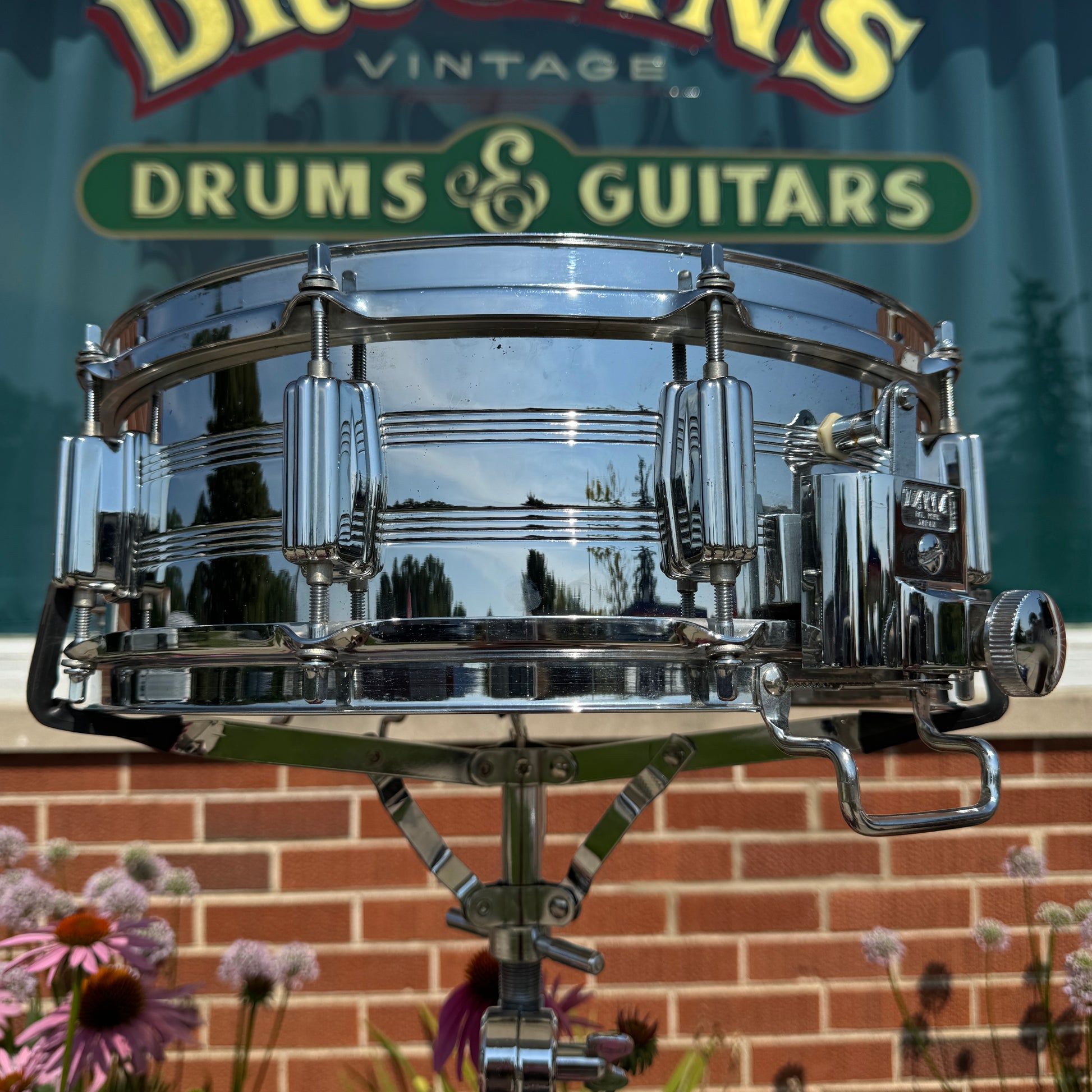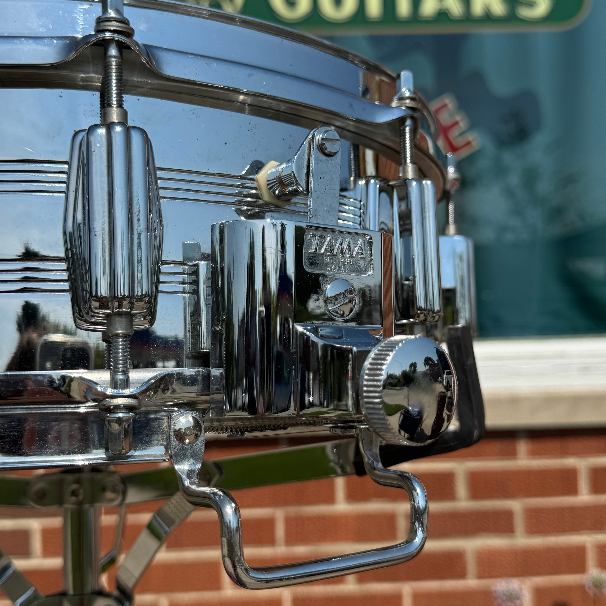 For your kind consideration is this vintage Tama 5x14 No. 8005 King Beat Seamless Steel snare drum made in Japan in the 1980s. It's in great overall condition with some light pitting and has the warm tone you expect from a 70s Tama steel snare. These heavy shells are the same used for Tama's Mastercraft snares during this era with a perfect 45 degree angle on the bearing edge. It has some very light aging as shown, is missing the muffler, and has non-original hoops. The original KG Parallel Action strainer and butt system works smoothly and has the original 6025 Steel Snappy Snares and bottom head. There are no extra holes or other modifications. Most importantly, it tunes up easily, sounds awesome and is a superb player's drum. Enjoy!