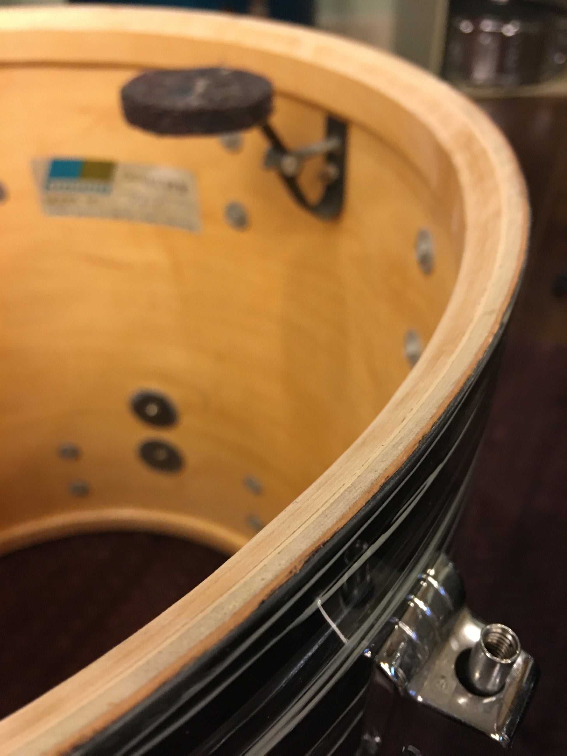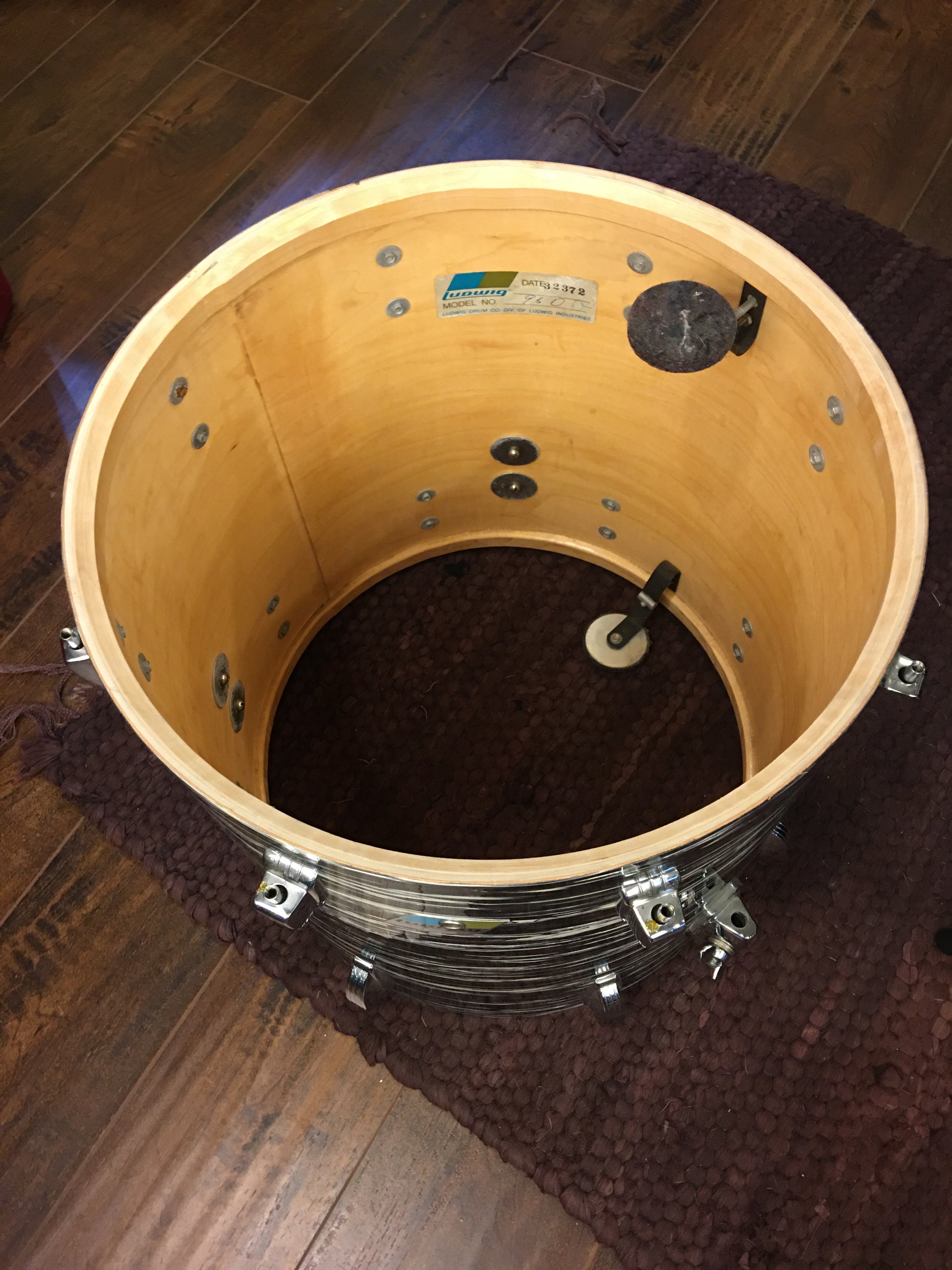 For your viewing pleasure is this magnificent Ludwig 16x16 3 ply floor tom in opulently clean 2nd generation Oyster Black Pearl with internal paper tag dated 3 23 72. This is among the very nicest examples of early 2nd generation Oyster Black Pearl we have come across, displaying the very best qualities of both 1st and 3rd generation OBP, with a very oyster-y shimmer and less bowling ball affect than 3rd gen. This drum has been very well cared for and there are no splits or damage to speak of. It is 100% original, including dual factory mufflers on top and bottom, which both look great and function. The chrome plating on the lugs, hoops, muffler knobs, leg brackets and legs is excellent. There is one very small bend in the top lip of the bottom hoop which is cosmetic in nature only and does not affect the tuning, sound, or integrity of the drum in any way. The blue & olive pointy badge is in beautiful condition with 6 digit serial # 924XXX. The edges are original and true, and the shell is a beautiful 3 ply with reinforcement hoops and clear maple interior. Most importantly, this drum tunes up easily and sounds amazing! Enjoy!