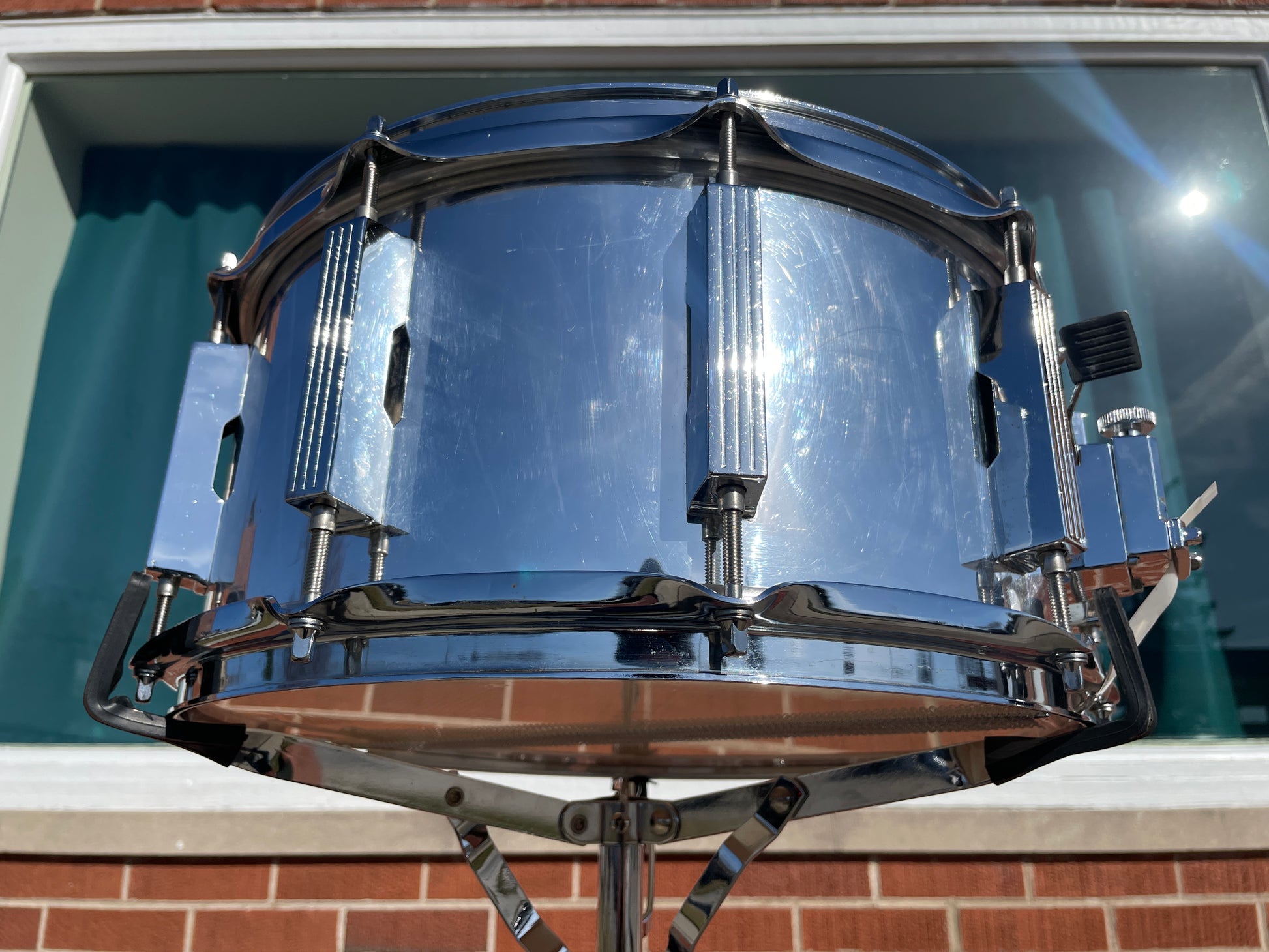 For your kind consideration is this vintage Tama 6.5x14 AW206 chrome over birch snare drum from the early 1990s. This drum is in very good condition and sounds great. It's built with Tama's 7-ply/9mm covered birch shell and has a slightly darker and warmer tone than a painted birch shell and measures deeper at 7" though 7x14 was never a catalogued size. The original Power Action strainer is in great condition and functions as it should. The chrome colored wrap has some light wear and one small section of bubbling on the panel next to the throw-off with some seam lift. The original steel Mighty Hoops are in very good condition overall as are the 10 Sure-Tune long lugs. This drum tunes up with the greatest of ease and sounds fantastic. Enjoy!