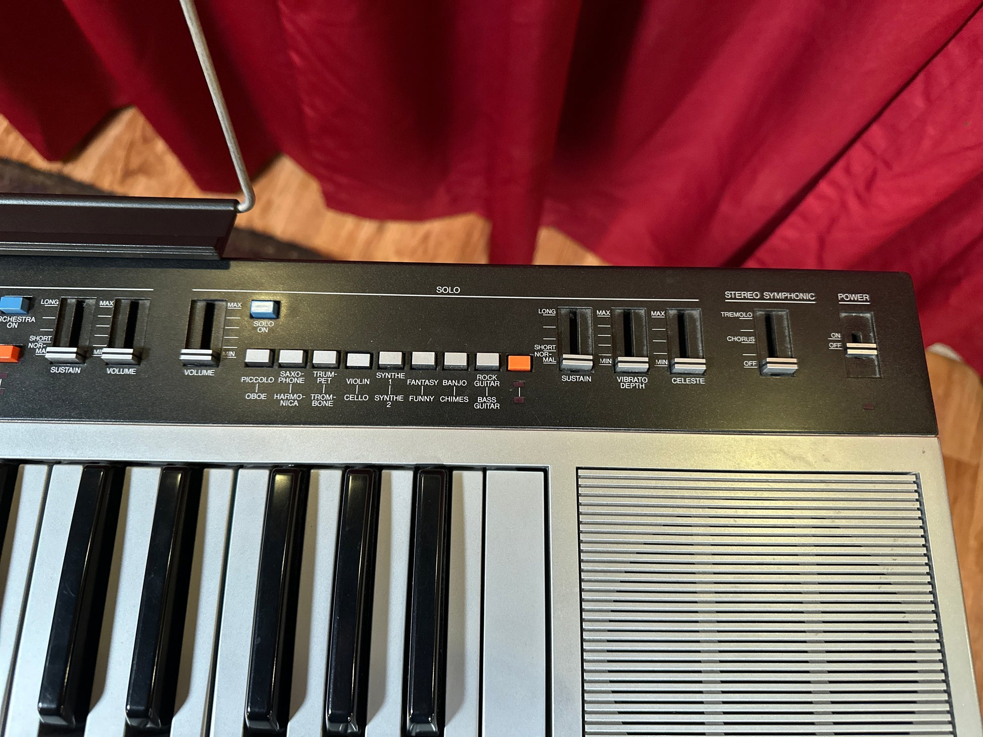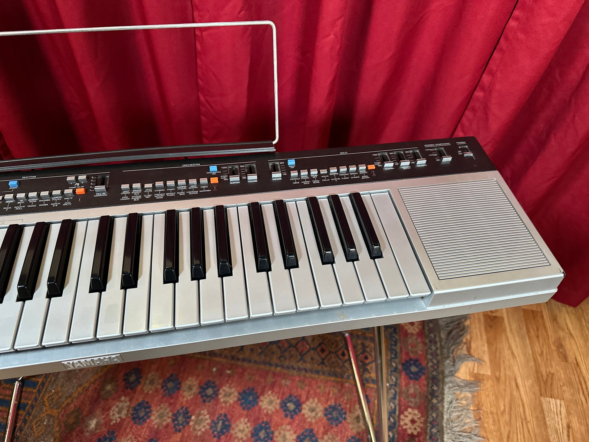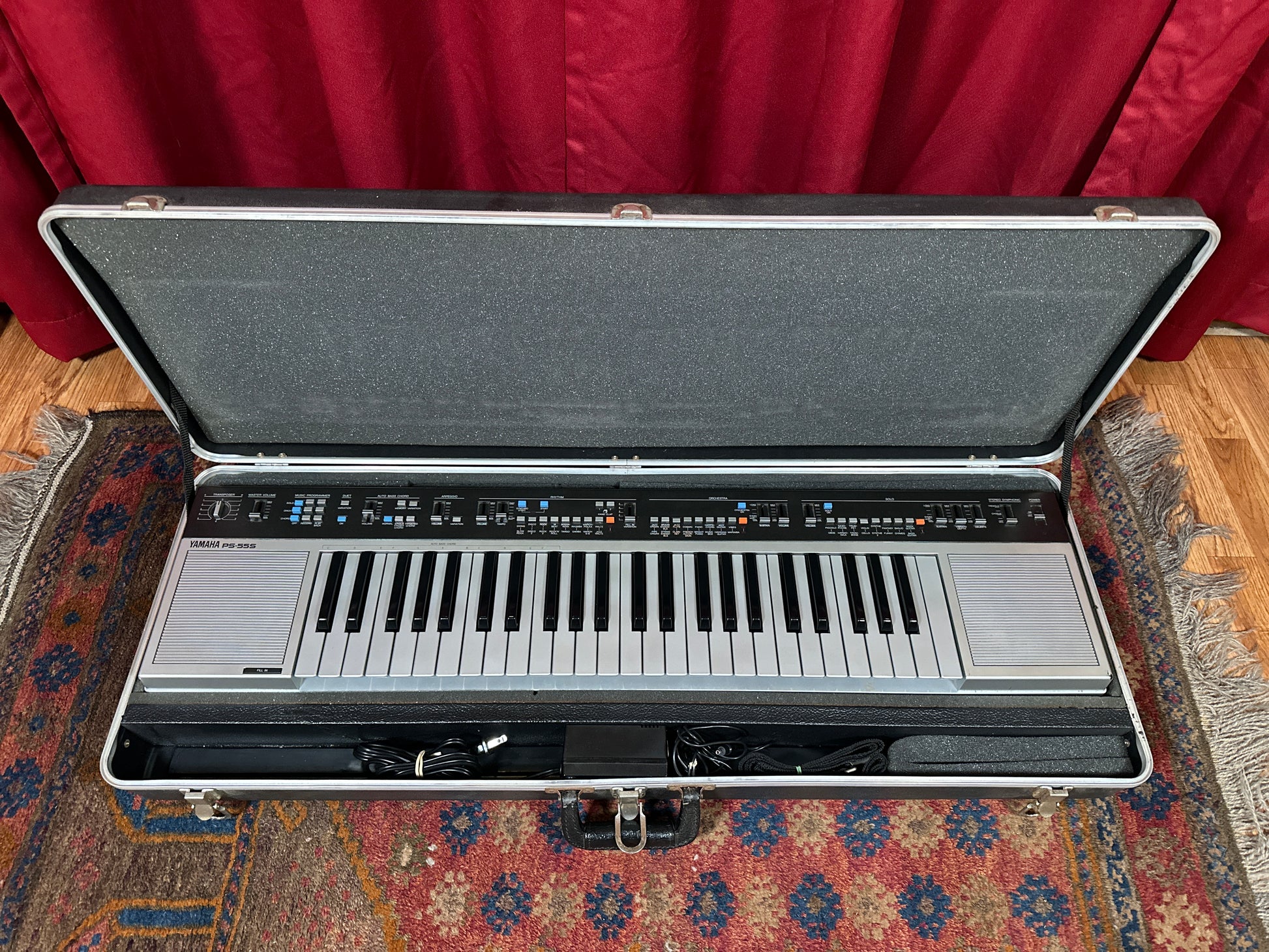 For your kind consideration is this rarely seen vintage Yamaha PS-55S home keyboard from the early 80s. This is identical to the PS-55 but the PS-55S was a limited edition finish released for Yamaha's 100th anniversary. The keyboard itself is in overall great condition with normal play wear for its age, including a few marks and scuffs. It includes the original stand, case, power supply, sheet music attachment, and cover. The sheet music attachment detaches and clips underneath for storage. One of the clips has broken off and it stays in place with only one of the clips remaining. The stand has some oxidation as shown in the photos and the cover has a few spots on it. The PS-55S is a two-oscillator synthesizer with a built-in chorus effect. It features a 49-note keyboard, a built-in arpeggiator, and a variety of modulation and filter controls, along with a built-in sequencer and a variety of preset sounds. Yamaha PS-55 models were used by a variety of artists, including Depeche Mode, New Order, and The Cure and now you can add those tones to your sonic palette too. The hardshell case is included. Enjoy!