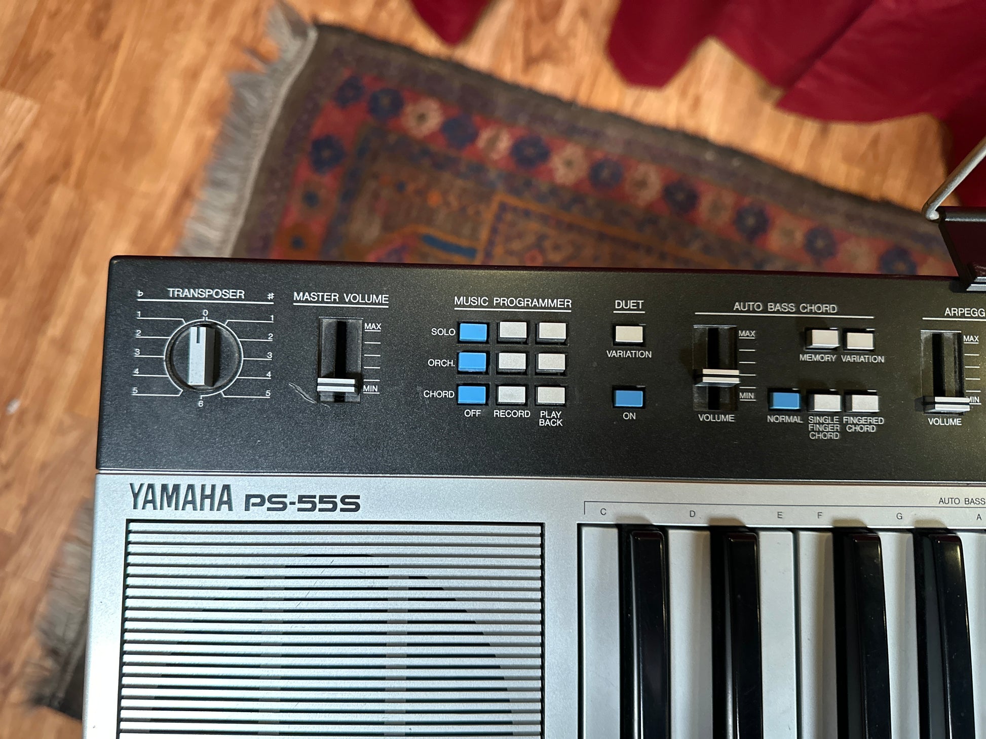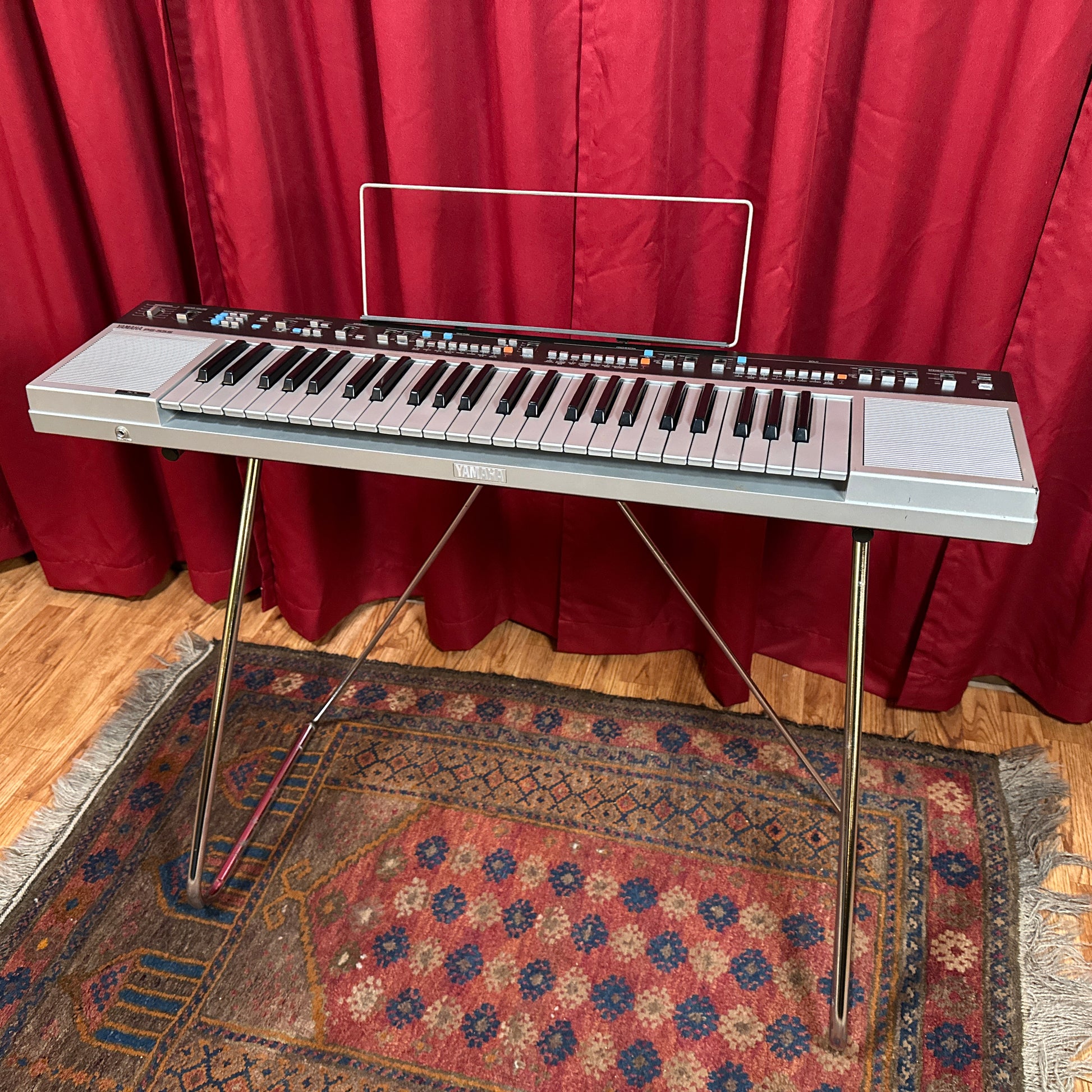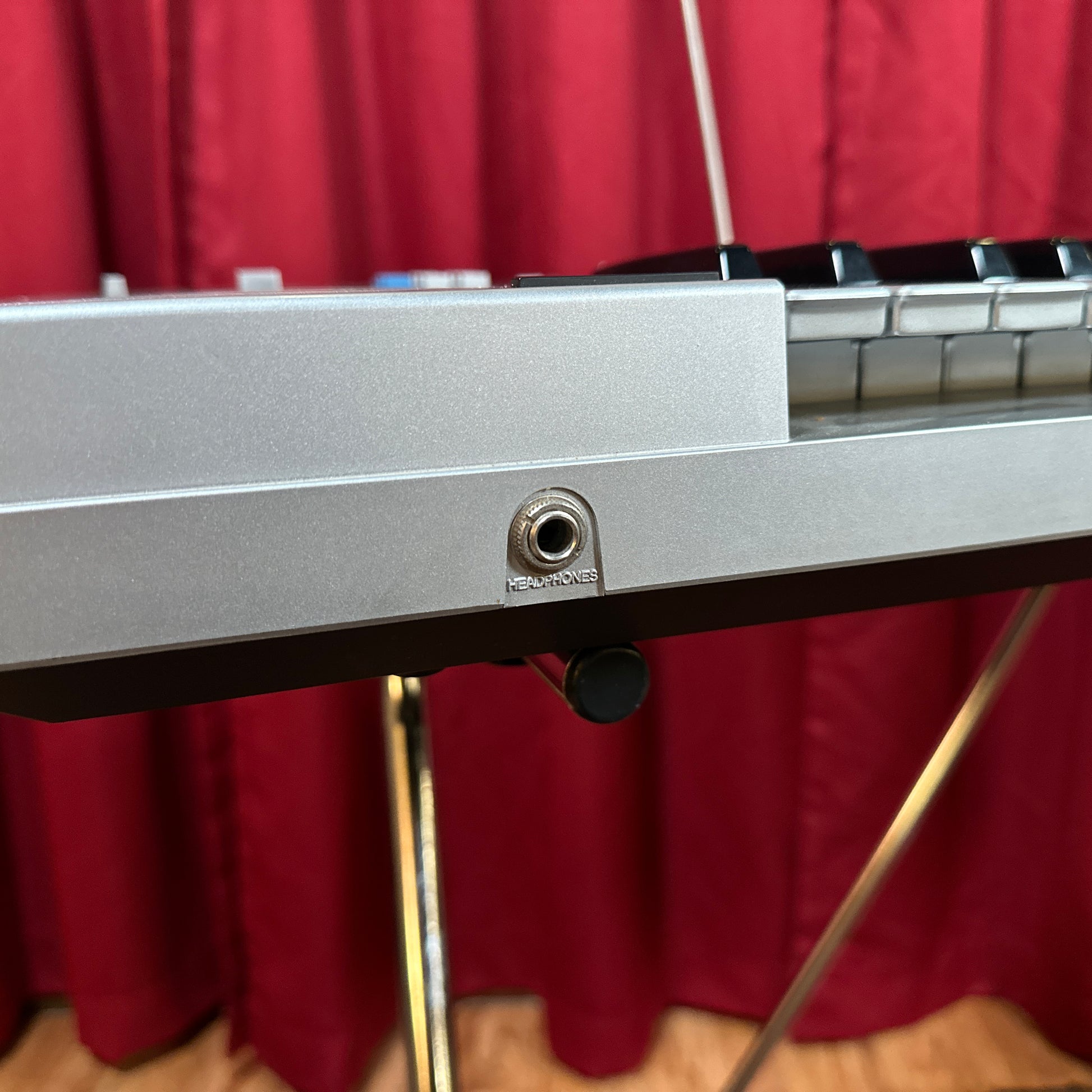 For your kind consideration is this rarely seen vintage Yamaha PS-55S home keyboard from the early 80s. This is identical to the PS-55 but the PS-55S was a limited edition finish released for Yamaha's 100th anniversary. The keyboard itself is in overall great condition with normal play wear for its age, including a few marks and scuffs. It includes the original stand, case, power supply, sheet music attachment, and cover. The sheet music attachment detaches and clips underneath for storage. One of the clips has broken off and it stays in place with only one of the clips remaining. The stand has some oxidation as shown in the photos and the cover has a few spots on it. The PS-55S is a two-oscillator synthesizer with a built-in chorus effect. It features a 49-note keyboard, a built-in arpeggiator, and a variety of modulation and filter controls, along with a built-in sequencer and a variety of preset sounds. Yamaha PS-55 models were used by a variety of artists, including Depeche Mode, New Order, and The Cure and now you can add those tones to your sonic palette too. The hardshell case is included. Enjoy!