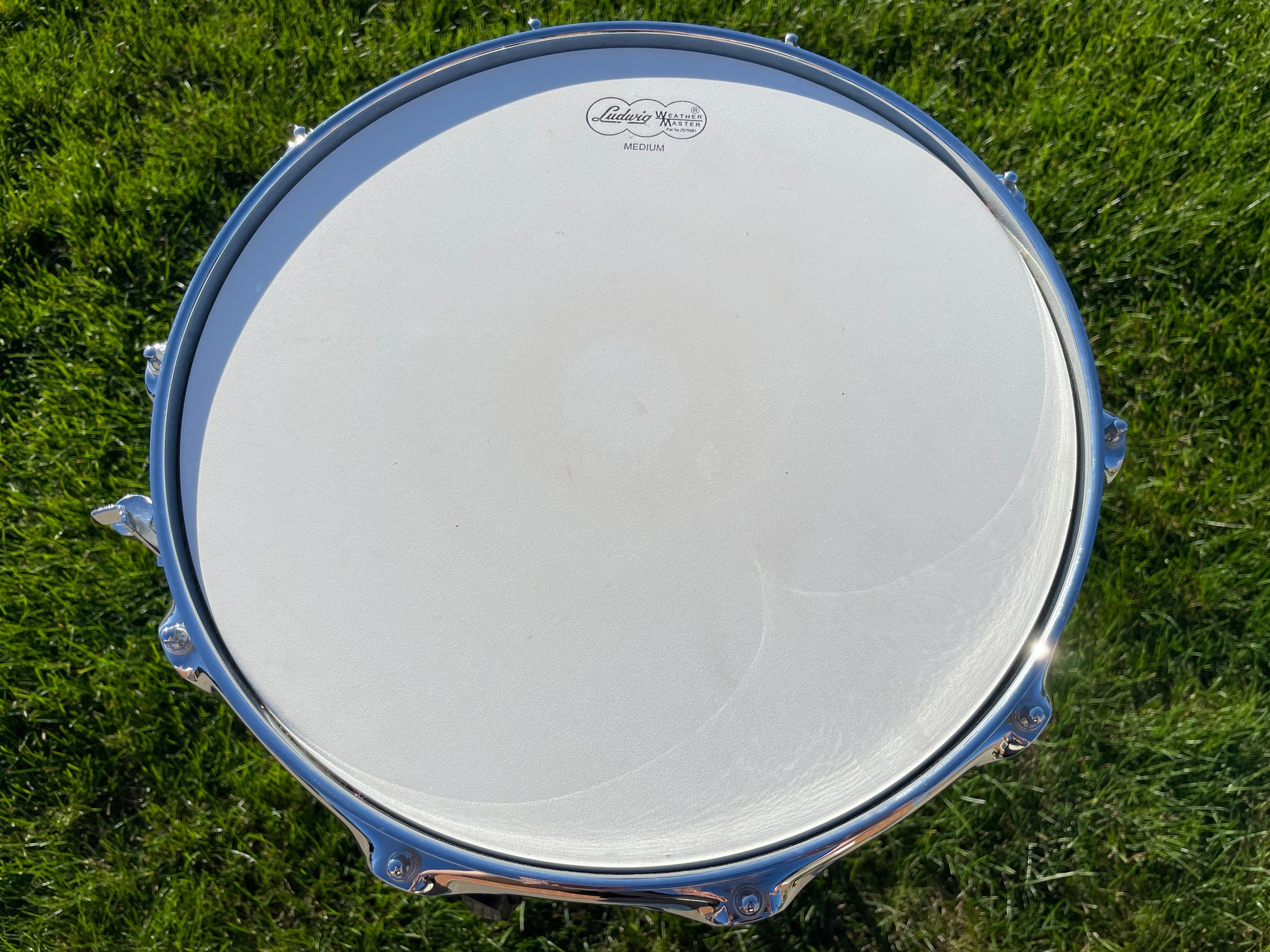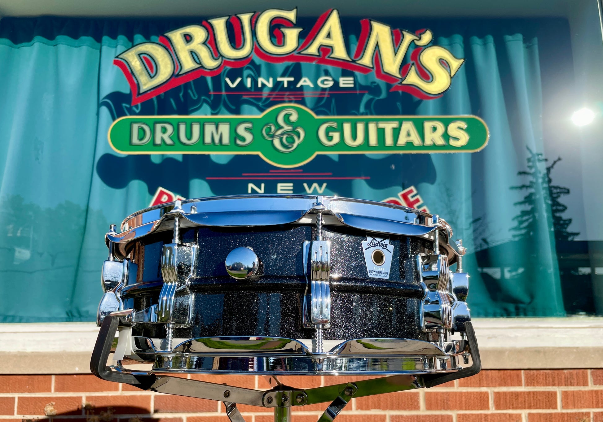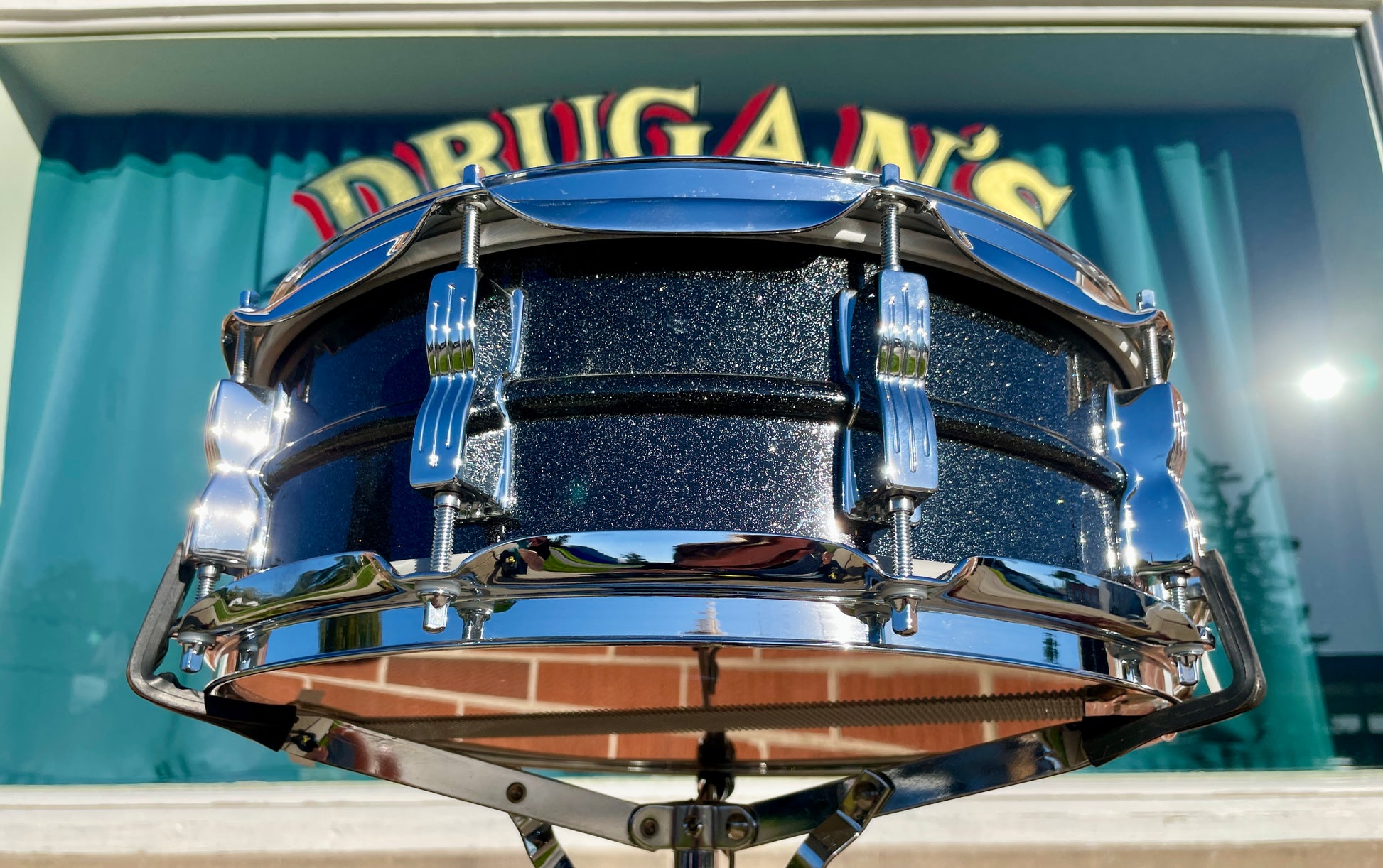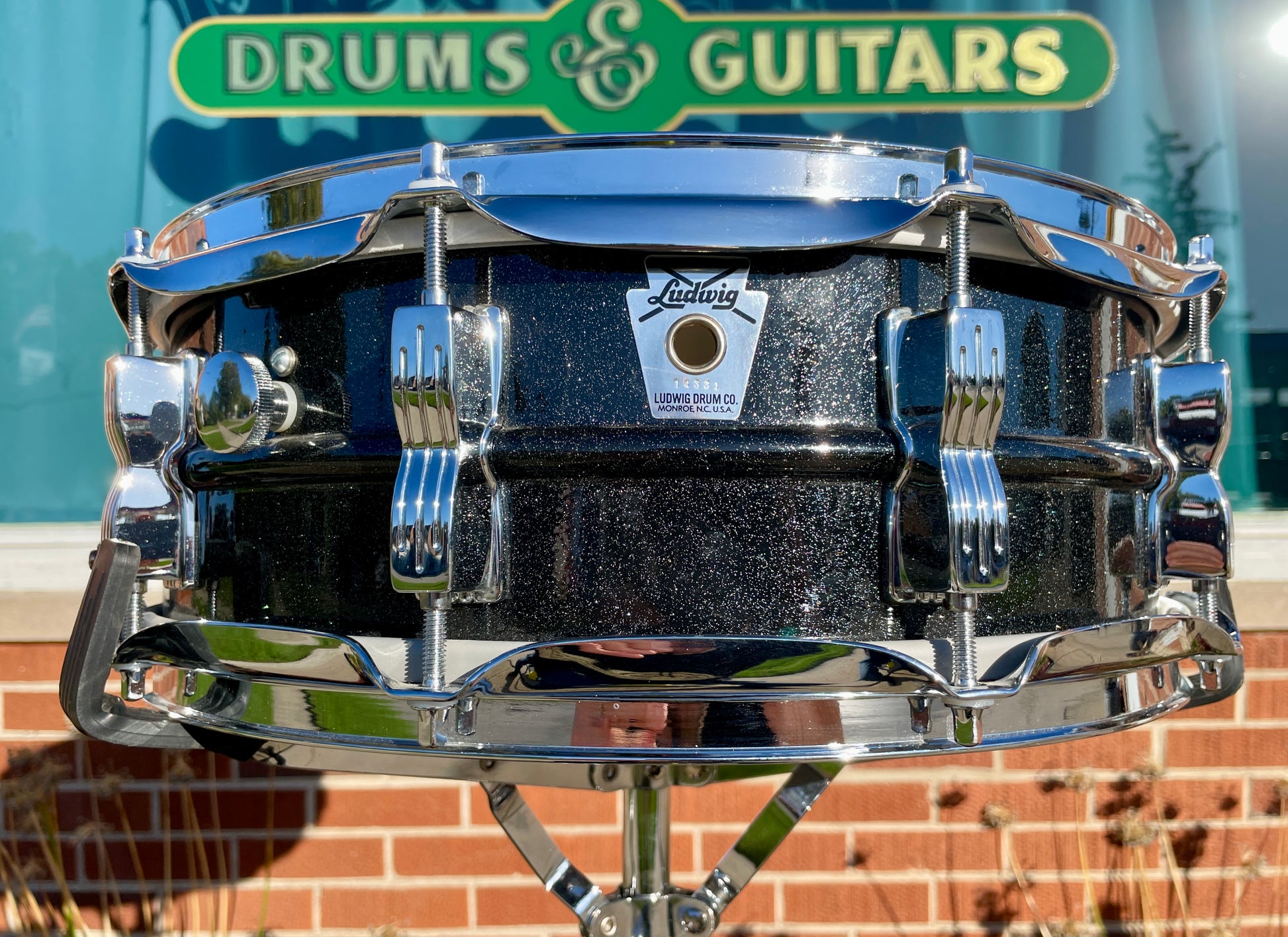 For your supreme viewing pleasure is this limited edition Ludwig 10-Lug 5x14 Acrolite snare drum in Black Galaxy from the '90s, and is one of only 200 made. This drum is in minty clean practically new condition, and is all original down to the heads and wires. The 10 bowtie lugs gives some heft to the aluminum shell which adds to the legendary crisp Acrolite tone. The P-85 strainer and internal muffler both operate smoothly. No drummer's or studio's snare drum arsenal is complete without a trusty Acrolite, and this rarely seen 10-lug version is ready for the job. Enjoy!