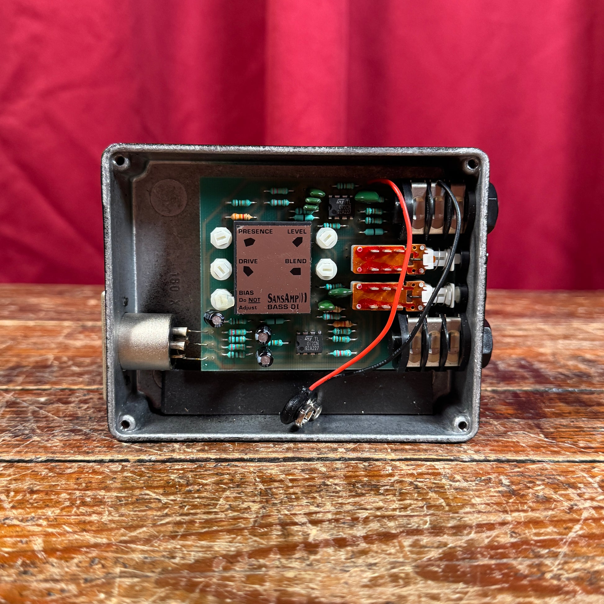 For your kind consideration is this rare, vintage Tech 21 SansAmp Bass DI. This is the very first, and some say best sounding, version that does not use phantom power and only operates with the internal 9v battery (not included). These original SansAmp DI boxes used internal controls before the Bass Driver we all commonly think of was introduced with external knobs to more easily dial in your tone. This unit is in fantastic, well cared for condition with only a few tiny paint chips along the edge here and there as shown. It features Presence, Drive, Level, and Blend controls to dial in the tone on the XLR output through its tube amplifier emulation circuit, which is activated using the "Active XLR" flush mounted button. It has been tested and is fully functional. This would be a great addition to your studio or stage setup. The full manual is available as a PDF on the Tech 21 support page. Enjoy!