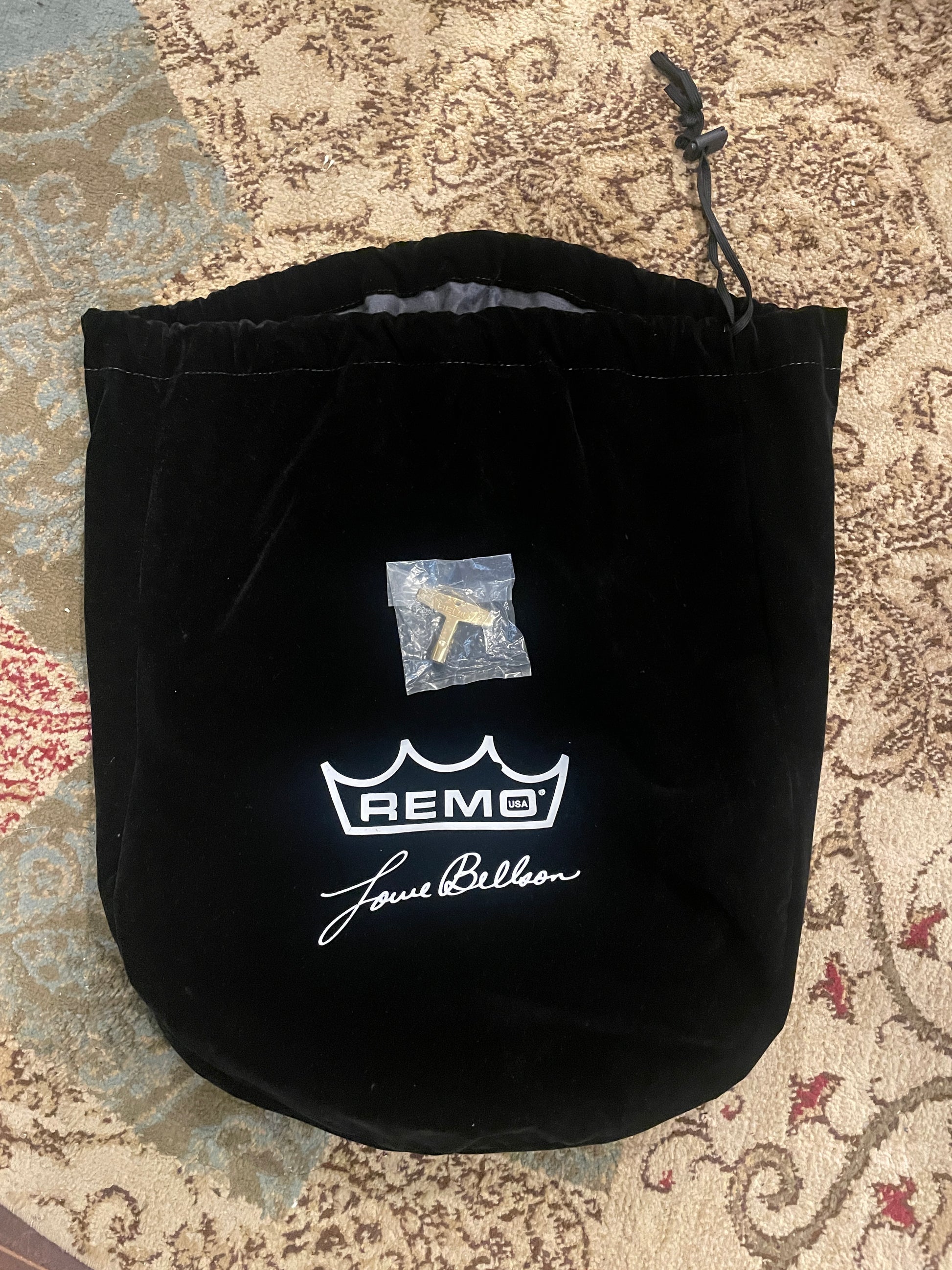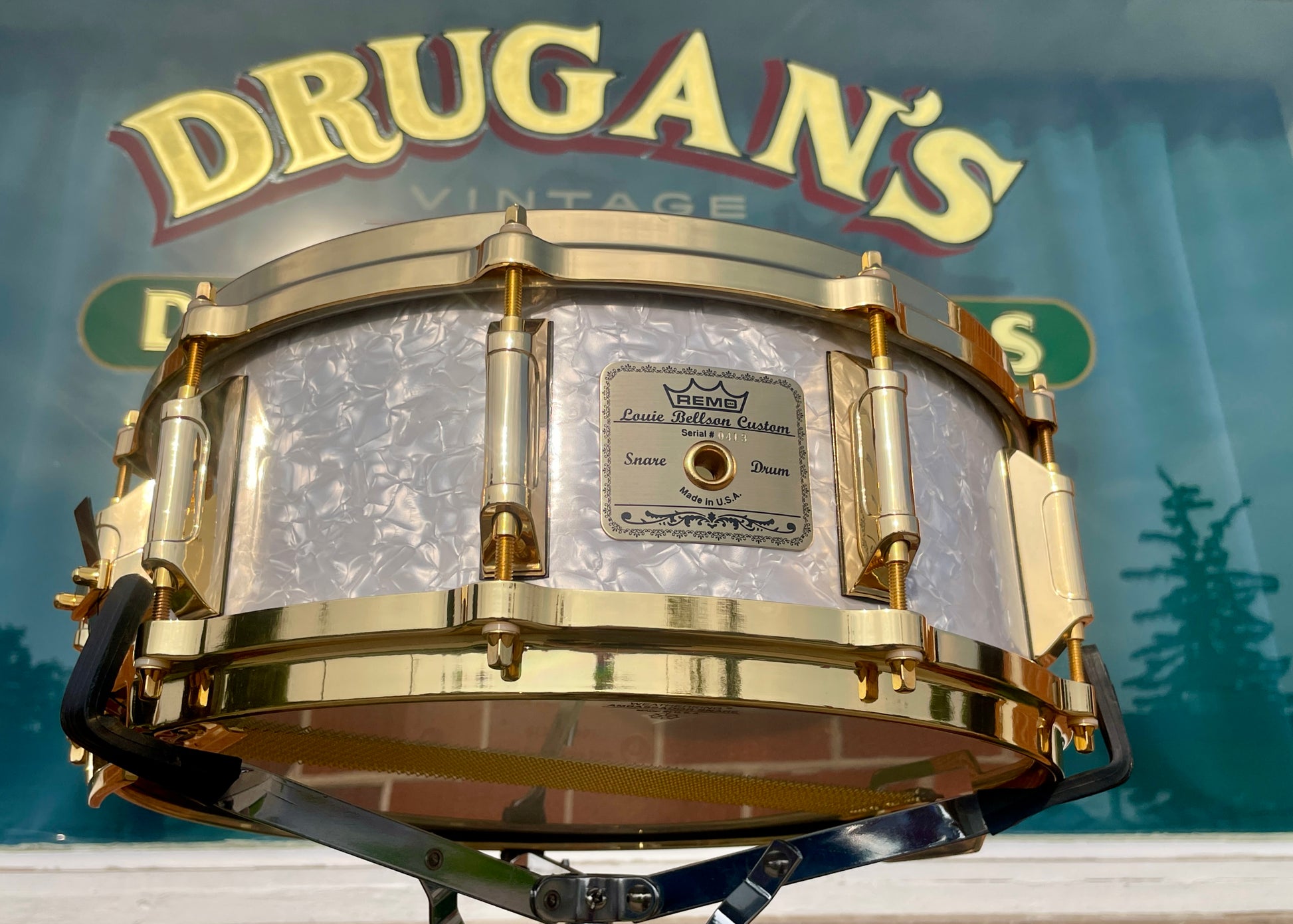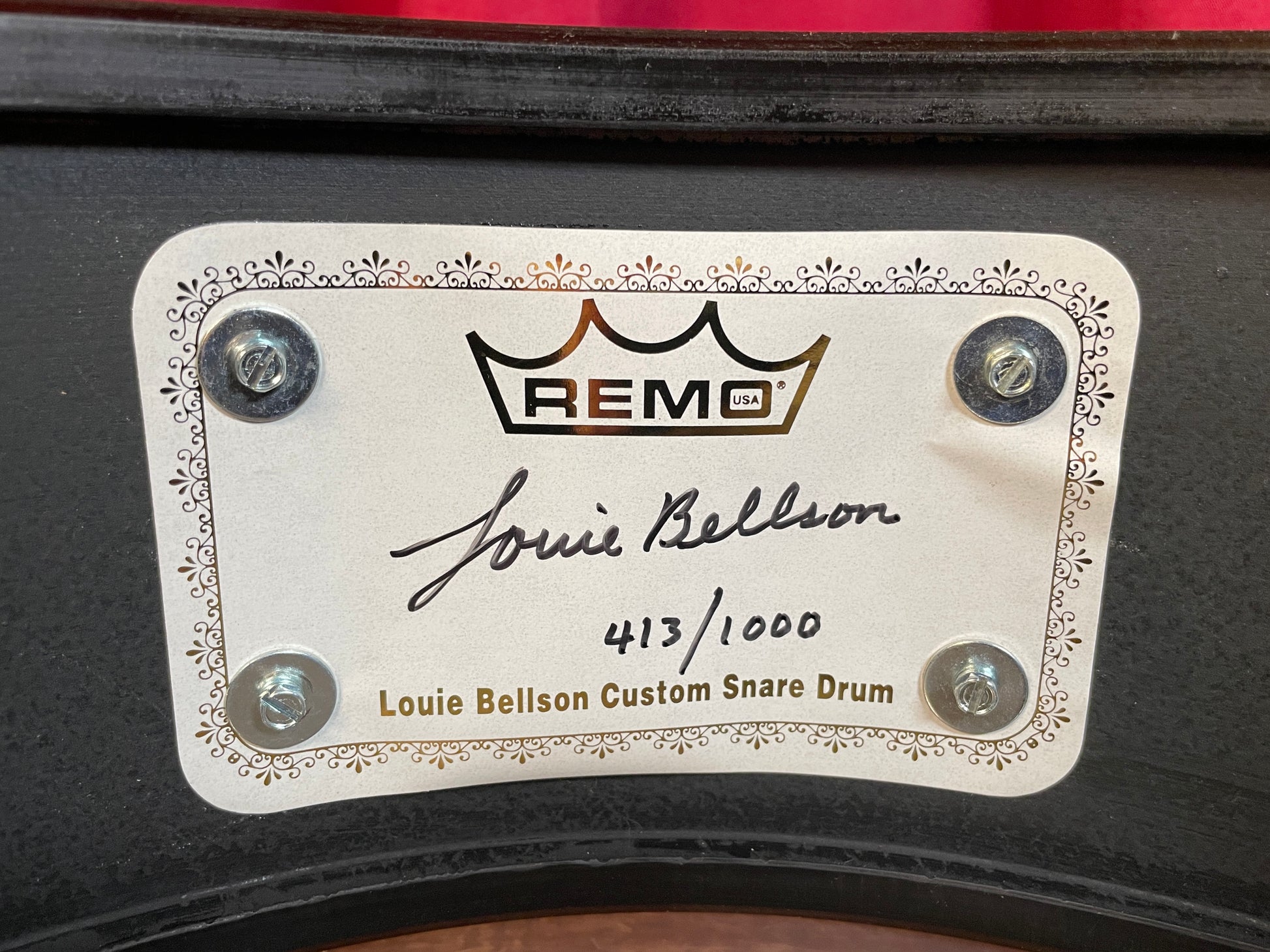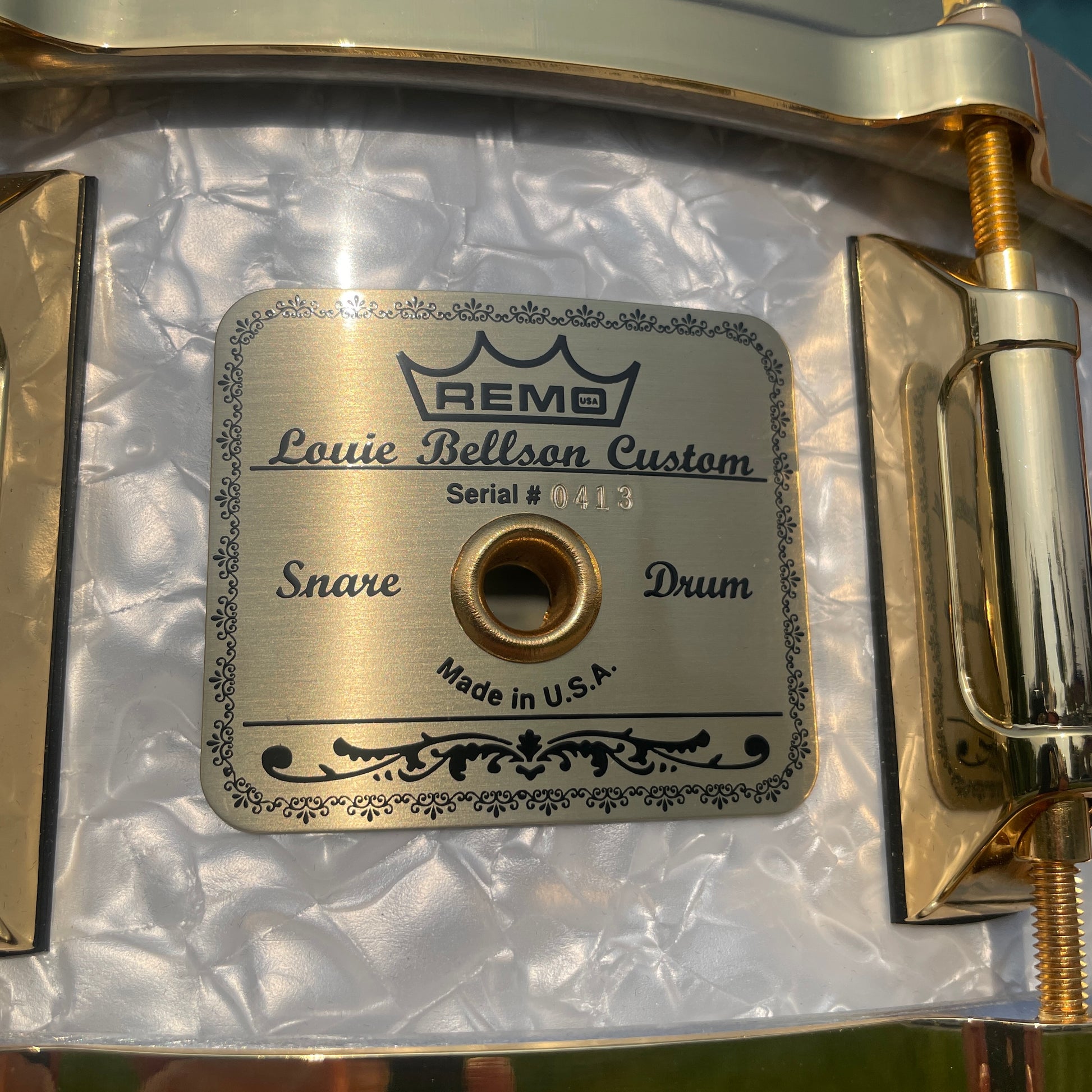 For your viewing pleasure is this limited edition Remo Louie Bellson 5.5x14 snare drum from 1999 in NOS (new old stock) condition. These drums were designed in commemoration of Louie Bellson's 75th birthday. It features Remo's Acousticon H/D drum shell with molded bearing edges, gold-plated hardware, die-cast hoops and Ambassador Renaissance batter head along with Bellson's trademark White Pearl finish and a commemorative, serial numbered badge. This one is as beautifully as they come and includes the perfect original bag and matching gold plated Remo drum key. Each of these is personally signed by Bellson and this one is number 413 of 1000. Perhaps the only NOS still in existence? Truly a beautiful example of these terrific drums. Enjoy!