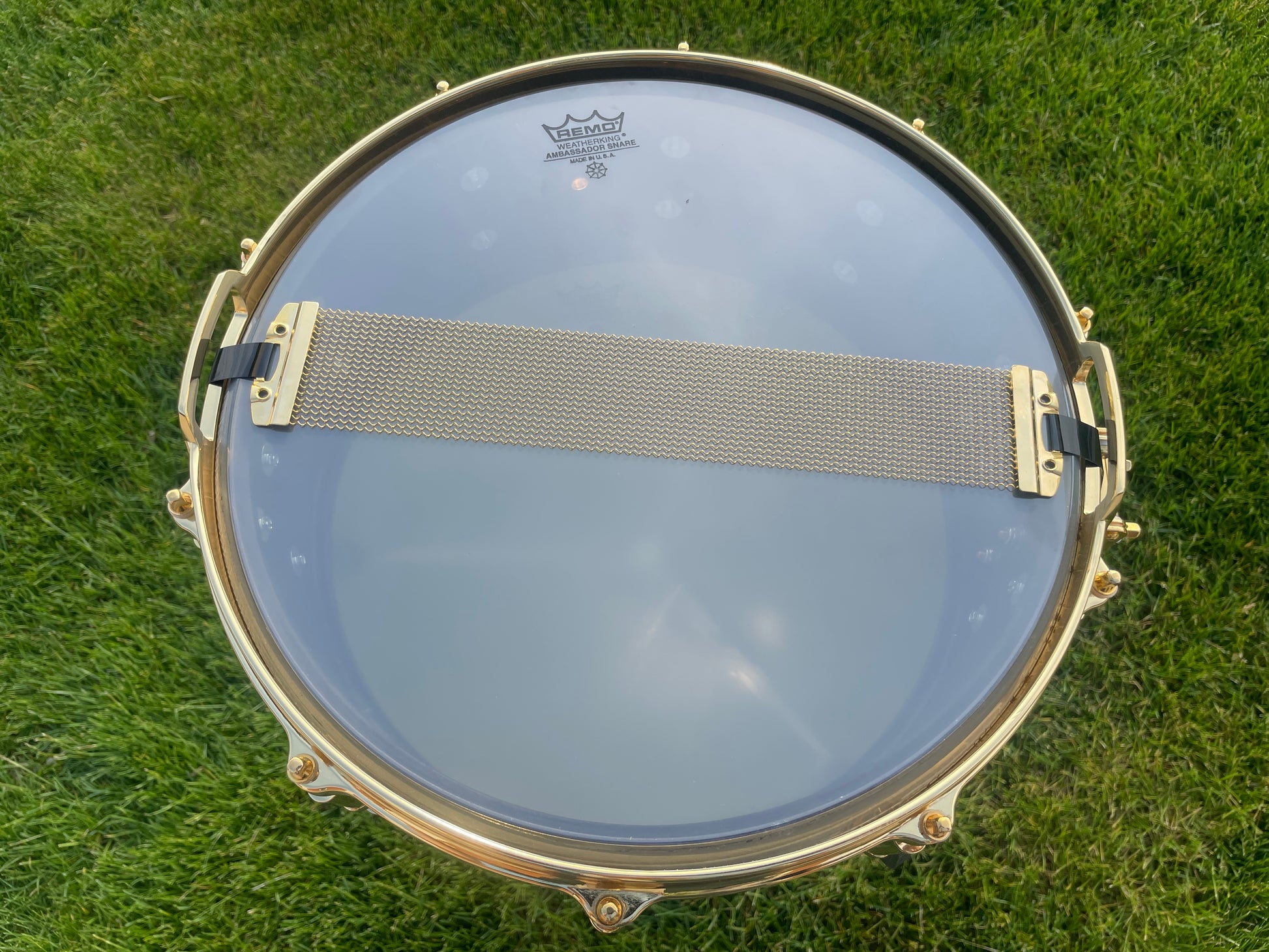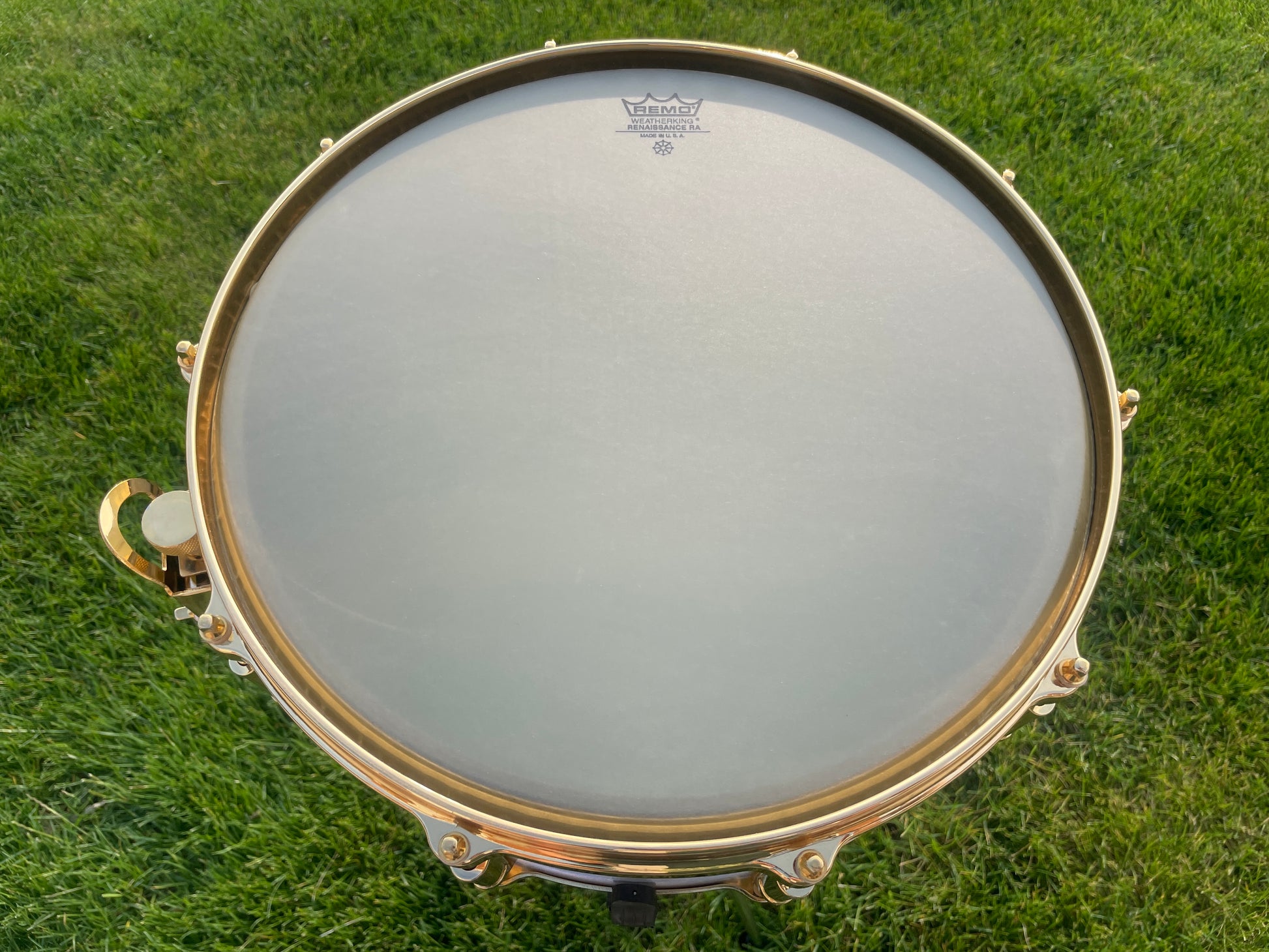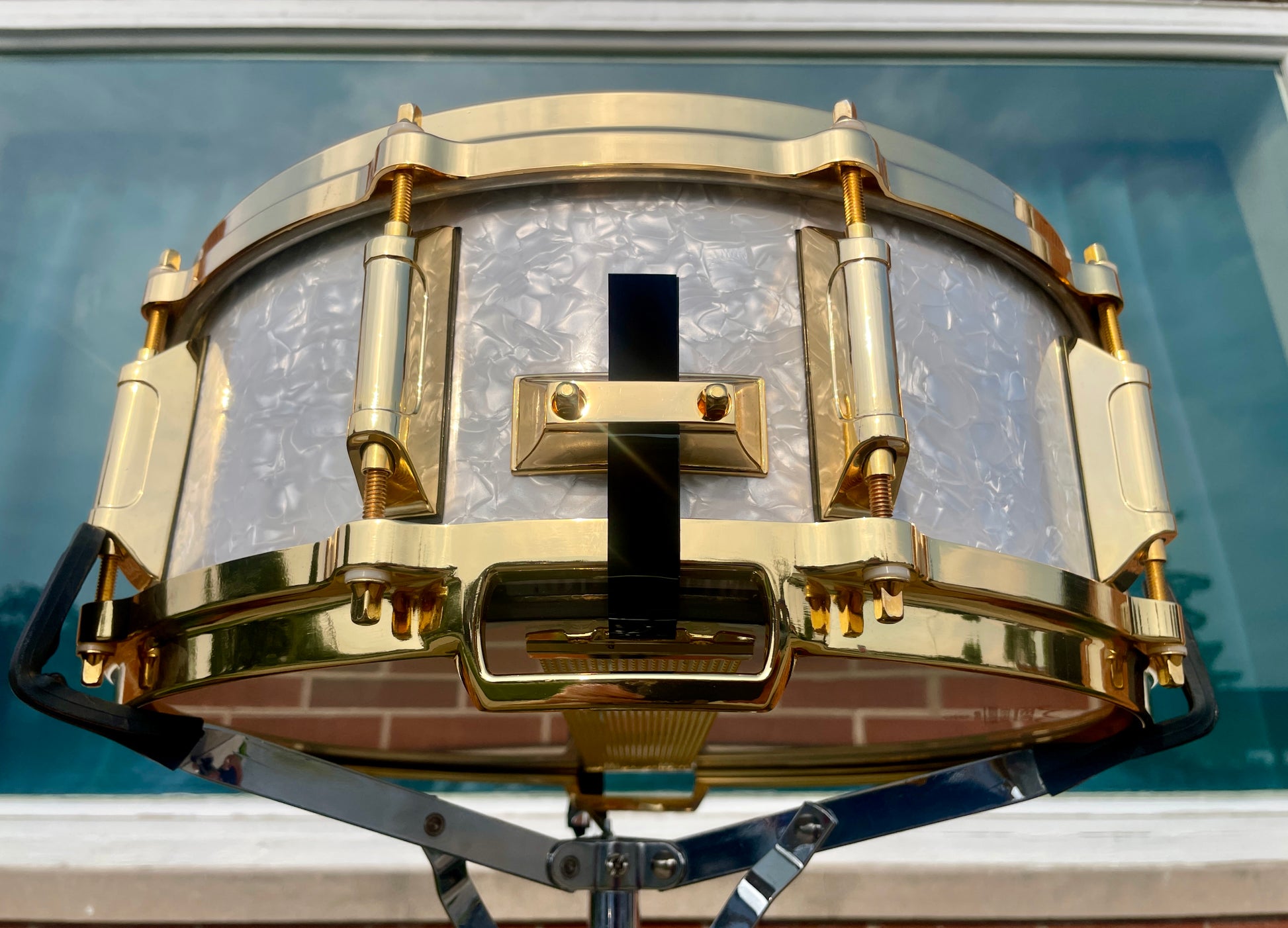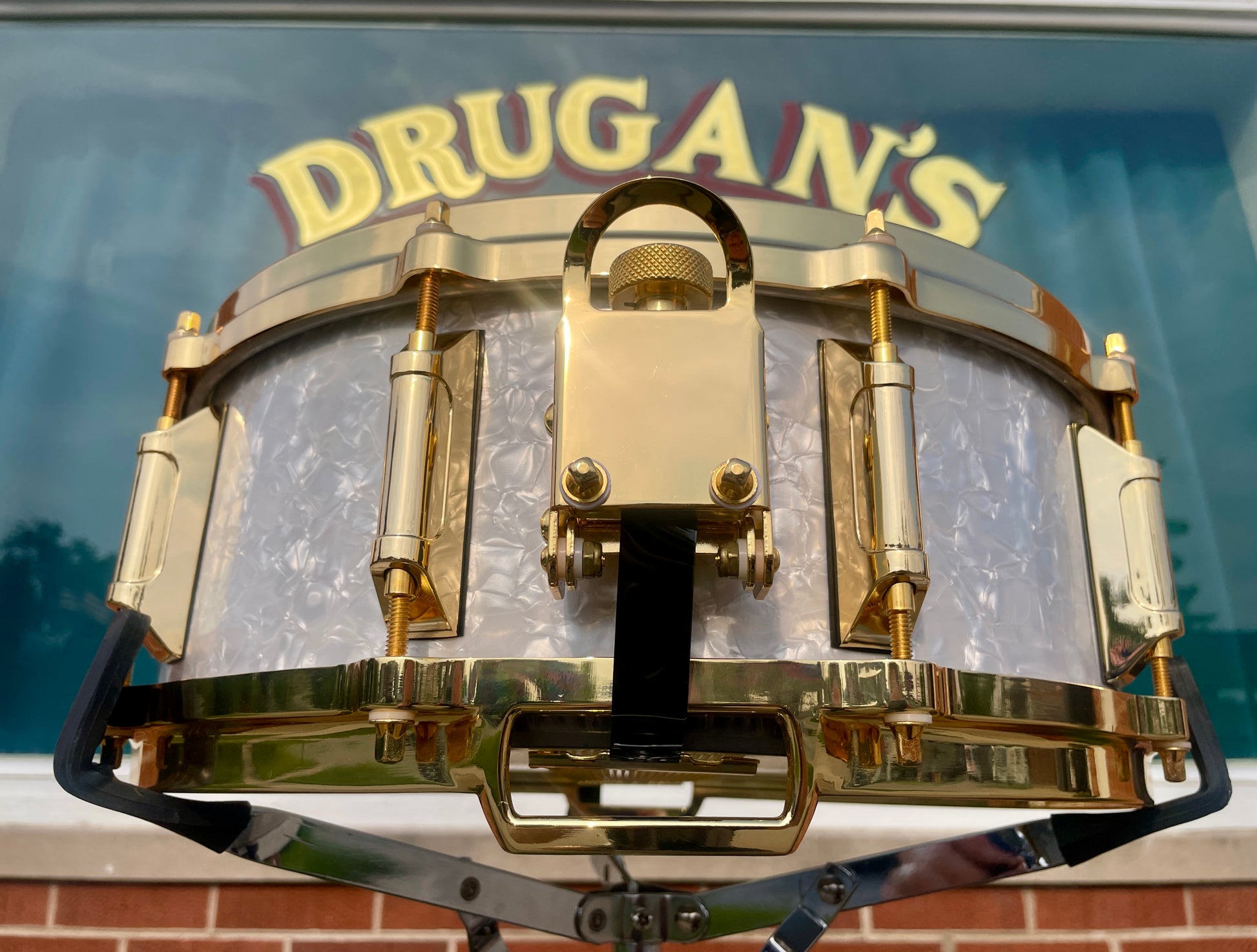 For your viewing pleasure is this limited edition Remo Louie Bellson 5.5x14 snare drum from 1999 in NOS (new old stock) condition. These drums were designed in commemoration of Louie Bellson's 75th birthday. It features Remo's Acousticon H/D drum shell with molded bearing edges, gold-plated hardware, die-cast hoops and Ambassador Renaissance batter head along with Bellson's trademark White Pearl finish and a commemorative, serial numbered badge. This one is as beautifully as they come and includes the perfect original bag and matching gold plated Remo drum key. Each of these is personally signed by Bellson and this one is number 413 of 1000. Perhaps the only NOS still in existence? Truly a beautiful example of these terrific drums. Enjoy!