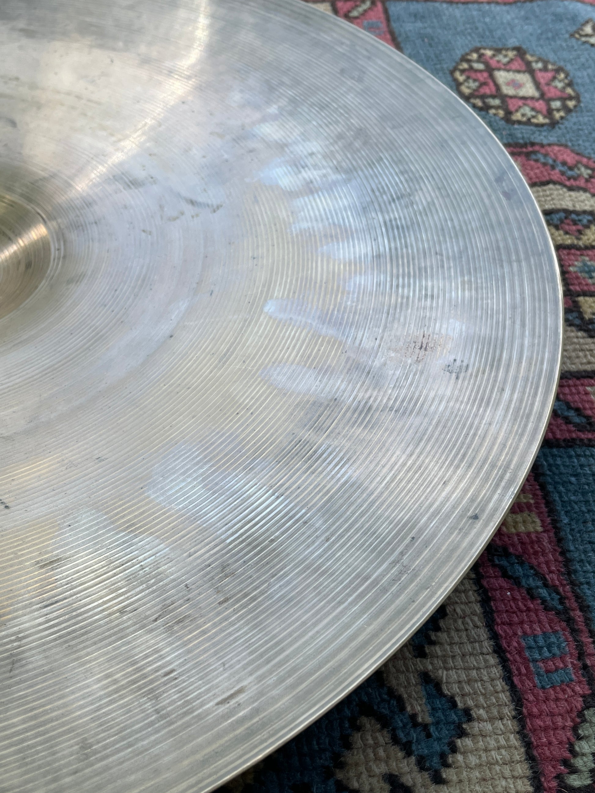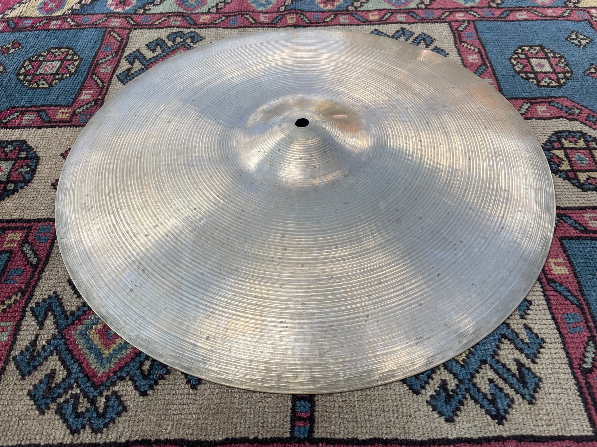For your kind consideration is this vintage 20" Zildjian A ride cymbal from the 1960s. It's in great condition and sounds beautiful. It has a slightly dry sound with a good blend of wash and stick definition and a musical bell. No cracks, bends, or flea bites and a near perfect hole. Weighs in at 2160 grams. Enjoy!