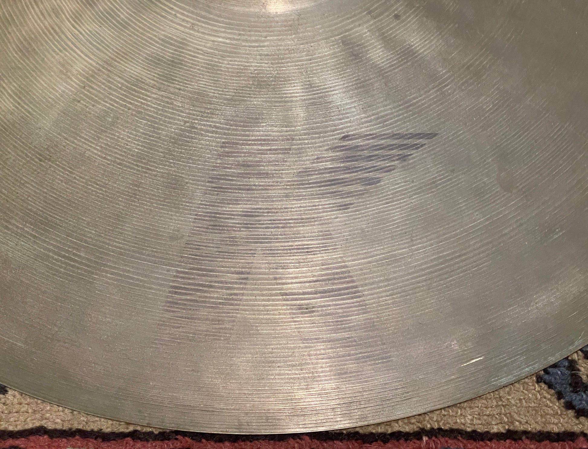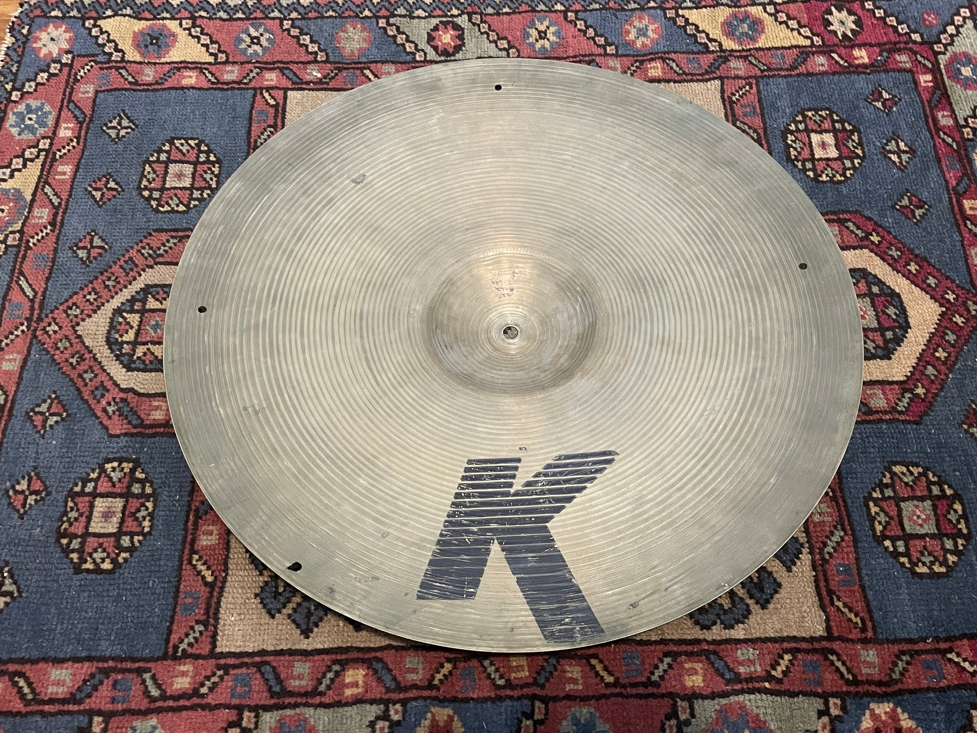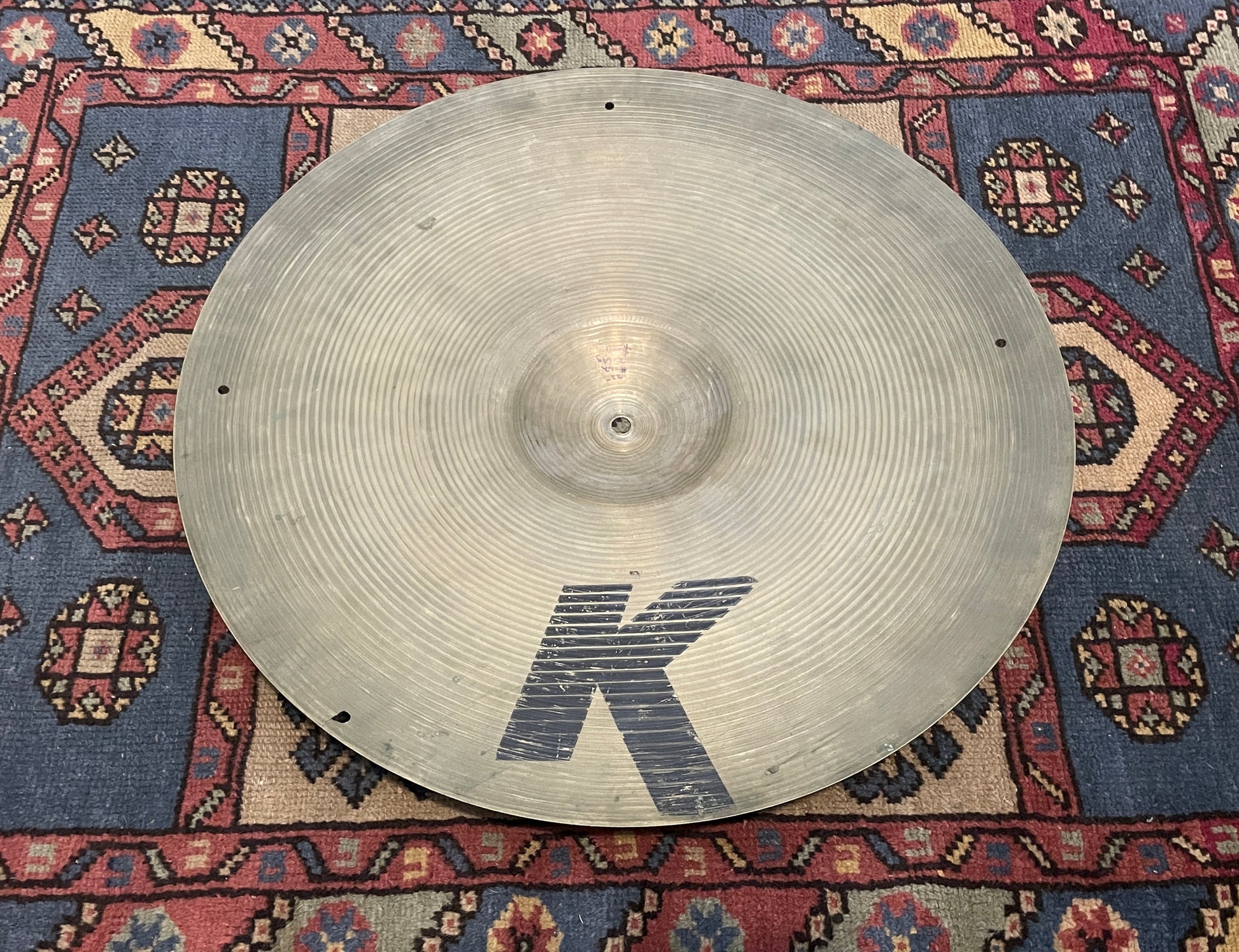 For your kind consideration is this vintage 22" Zildjian K Crash Ride cymbal. This is an EAK cymbal and would be worth a lot more if there weren't rivet holes added, hence the lower price. Absolutely fantastic sounding dark cymbal with loads of character. No bends, flea bites, or keyhole, one small crack radiating outward from one of the rivet holes. Weighs in at 2764 grams. Enjoy!